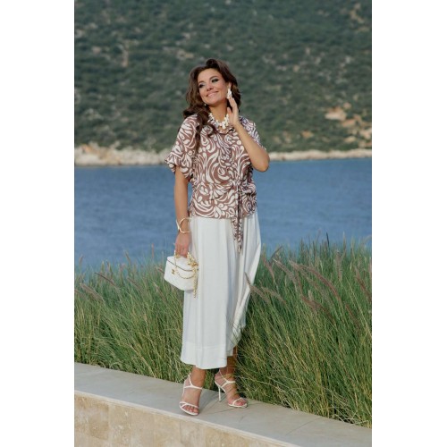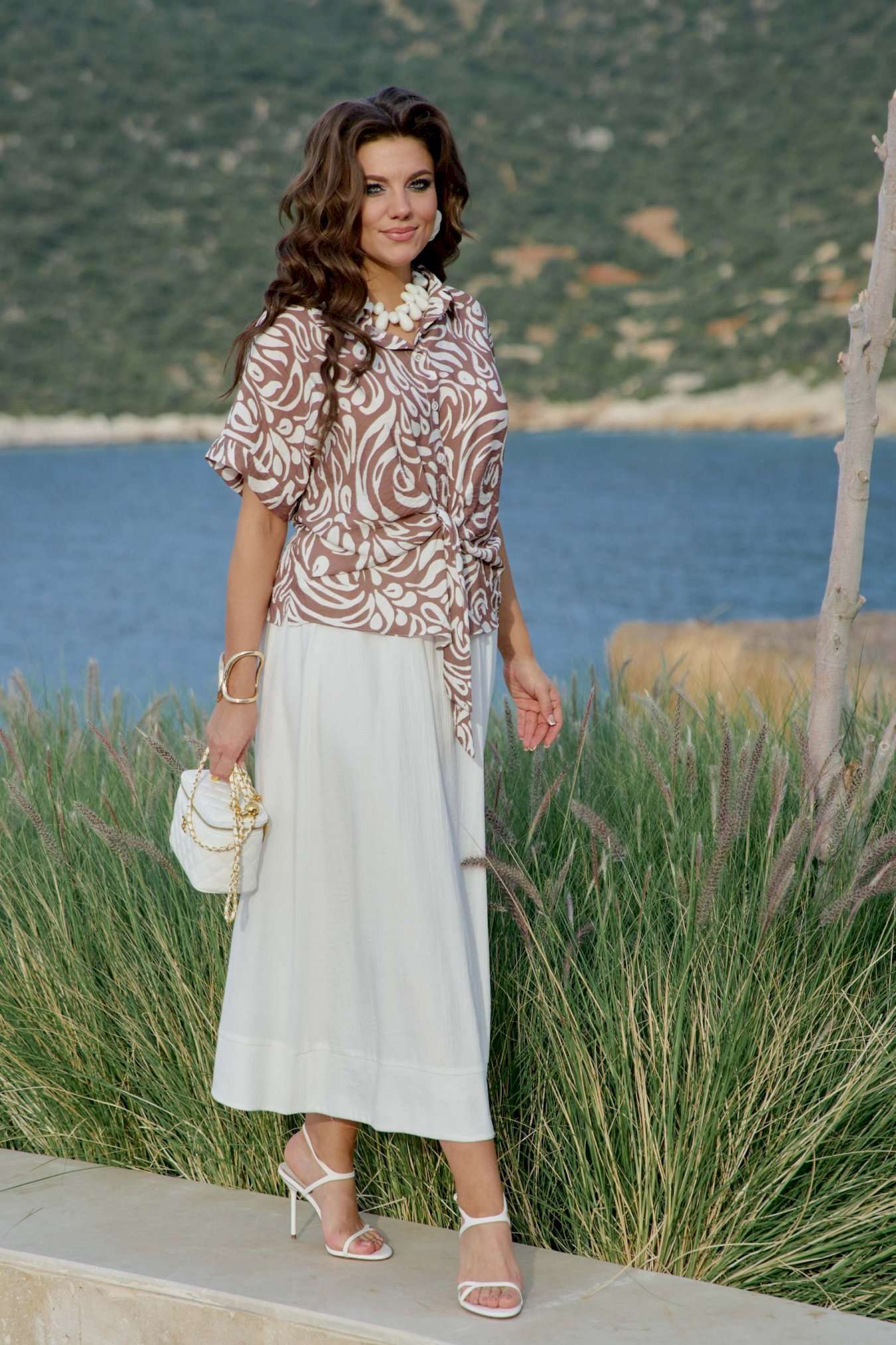 Юбка-трапеция из однотонной ткани — это воплощение летней легкости и грации, ее силуэт расширяется от узкой линии талии мягко расходится к подолу, создавая воздушный объем, который танцует при каждом шаге. Ее благородный цвет позволяют создавать образы от нежно-романтичных до смело-городских. Ключ к успеху — баланс: воздушность юбки уравновешивается более структурированным верхом, а теплый молочный оттенок становится идеальной базой для любых цветовых акцентов. Юбка трапециевидного силуэта. Её форма одновременно структурирована и свободна: чёткие линии кроя сочетаются с текучестью материала. Длина юбки — до середины икры или чуть ниже, позволяя демонстрировать изящные лодыжки и удобную летнюю обувь. При ходьбе юбка образует красивые волны, её полы расходятся, обнажая мгновениями ногу, чтобы тут же снова сомкнуться в элегантном движении. Пояс в юбке притачной, на эластичной тесьме-резинке, что обеспечивает максимально удобную посадку на любой тип фигуры, по низу притачная деталь в сгиб в виде планки. Юбка на подкладке. Длина юбки 87 см.