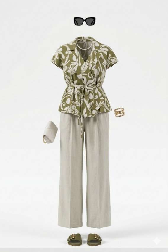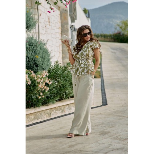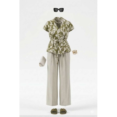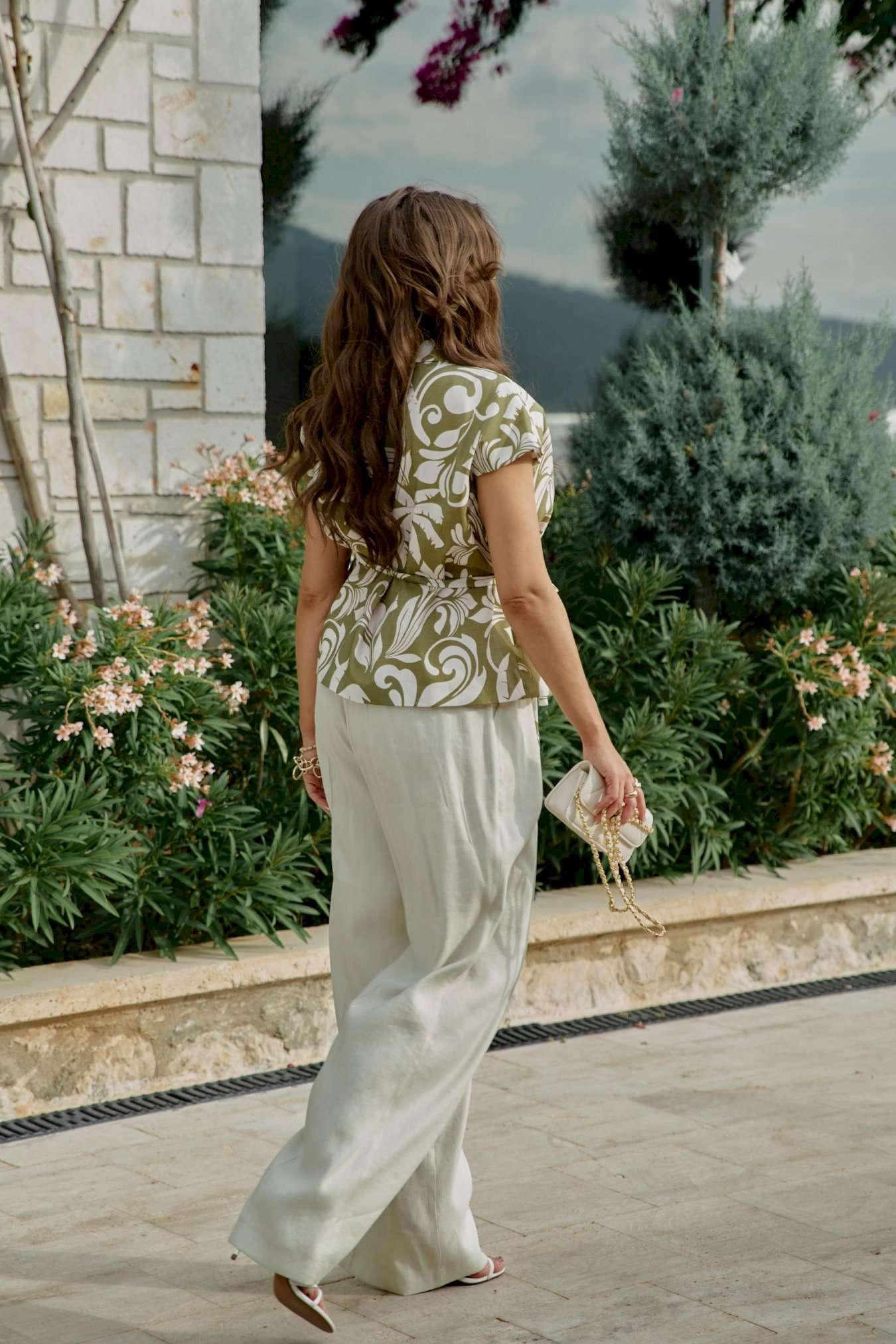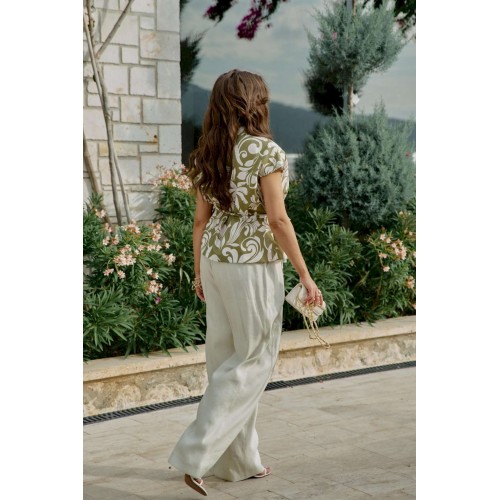 Этот жакет — идеальный компаньон для создания множества образов. Его нейтральный цвет и ненавязчивый принт делают его невероятно универсальным. Он подходит для женщины, которая не боится быть замеченной, но предпочитает, чтобы ее замечали не сразу. Для той, кто понимает, что настоящая роскошь — в легкости, а настоящая смелость — в тонкости. Жакет свободного силуэта, на «запах» с фигурной линией борта, и акцентным элементом в виде декоративных лацканов переходящих в воротник. Запах — это не просто застежка, он создает динамичную асимметрию — одна сторона накладывается на другую, создавая живую, нестатичную форму. А также игру объемов — в зависимости от того, как завязан жакет, меняется его силуэт. Линия плеча в жакете спущенная, плечи плавно ниспадают, создавая расслабленный силуэт. Спинка без особенностей. В комплекте идёт декоративный пояс из основной ткани. Жакет на подкладке. Жакет достаточно универсален для офиса, а та же для особых мероприятий. Ключ к успешной стилизации — баланс: позвольте цветочным акцентам быть главными героями образа, а всё остальное пусть будет их достойным фоном. Помните — иногда одна яркая деталь говорит больше, чем целый ансамбль, и эта блузка именно такая деталь. Длина жакета 64 см.