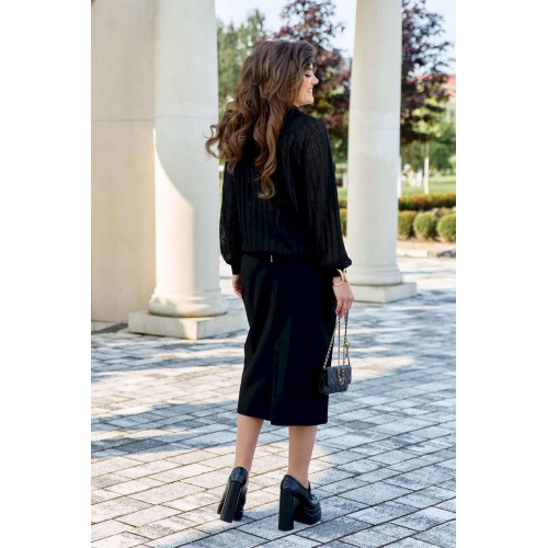 Комплект женский, состоящий из джемпера и юбки. Джемпер черного цвета, из полупрозрачного материала, его фактура — эффект гофре — это складки, они играют со светом, то поглощая его, то отпуская, создавая живое, дышащее полотно. Джемпер свободного силуэта, с планкой из отделочного материала переходящей в отложной воротник с застёжкой на декоративную тесьму-молнию. Рукав в джемпере- реглан со сборкой на притачную манжету из отделочной ткани. По спинке джемпера фигурная кокетка из отделочной ткани. Низ со сборкой на эластичную тесьму-резинку. Юбка прямого силуэта, удлинённая, зауженная книзу. Пояс в юбке притачной со вставкой в бочках декоративной тесьмы-резинки для удобного прилегания. В среднем шве заднего полотнища юбки застёжка на декоративную молнию, и разрез от низа. Обращаем Ваше внимание, что фурнитура может незначительно отличаться от фото. Длина джемпера 67 см (р 50-54), 67,5 см (р 56-60), длина рукава 64 см (р 50-54), 65 см (р 56-60). Длина юбки 81 см.