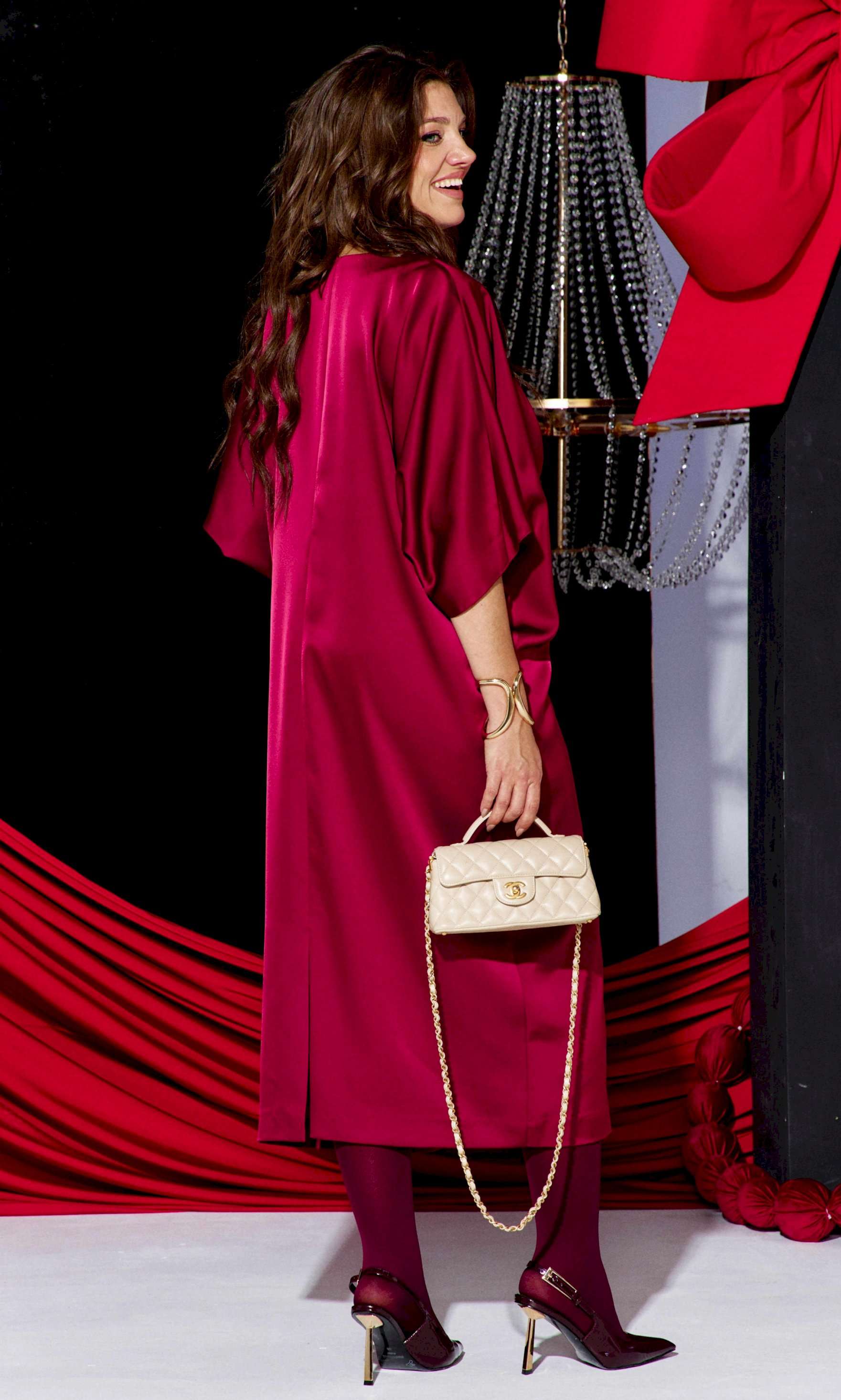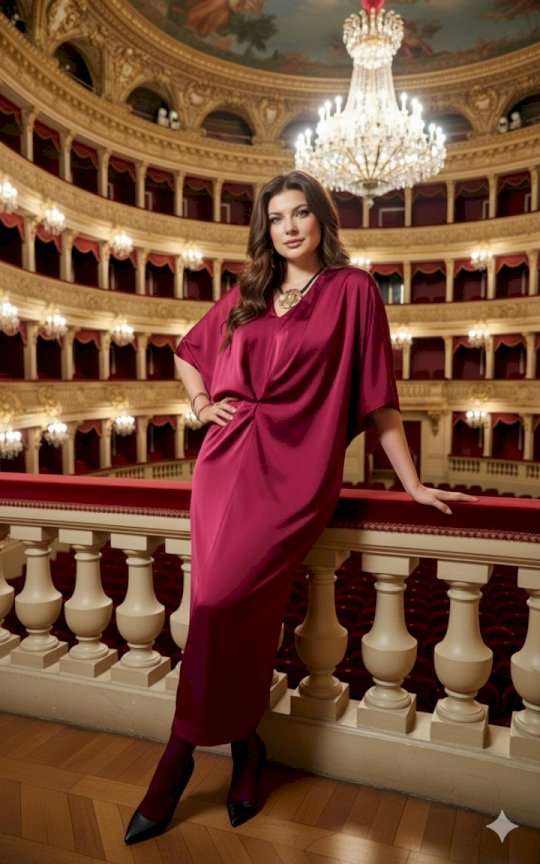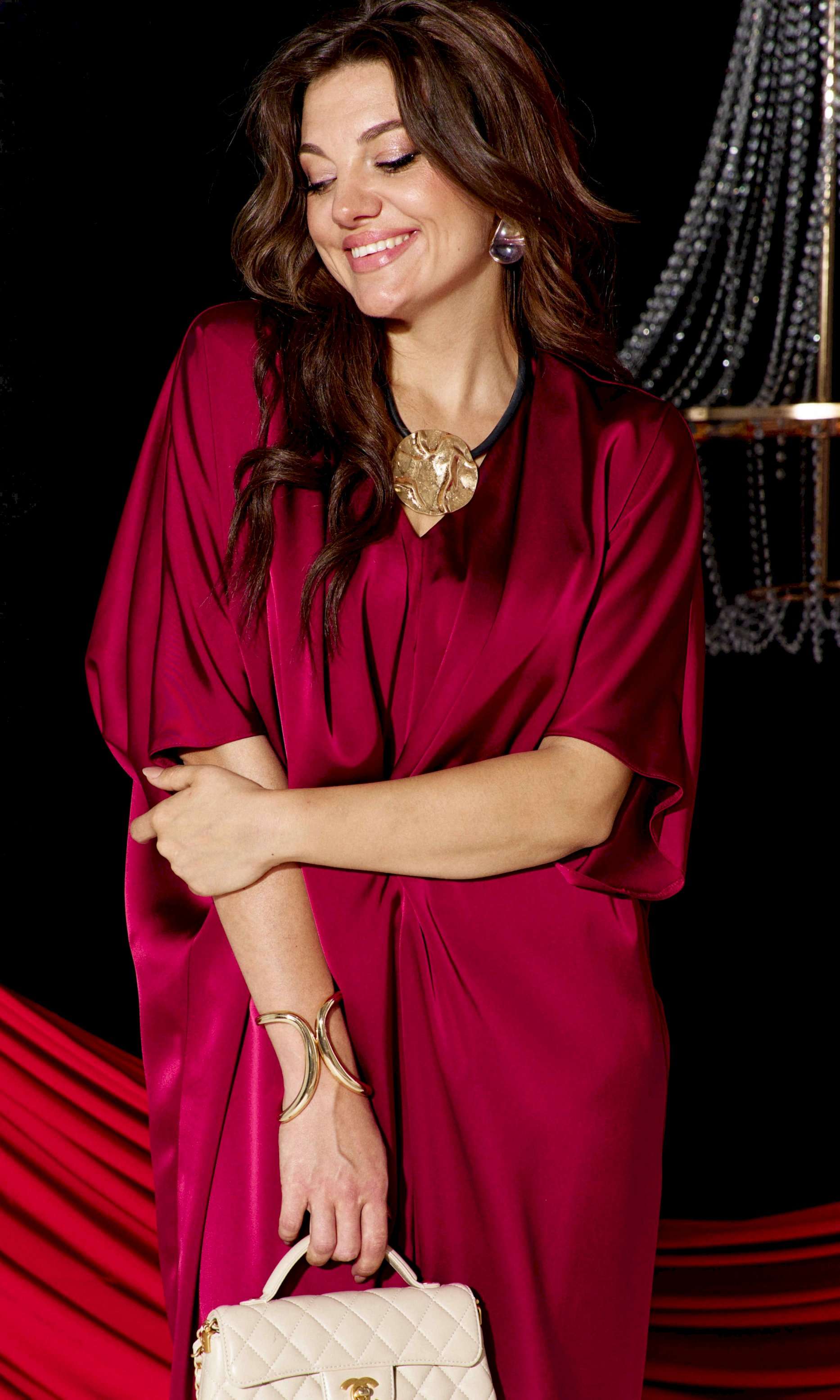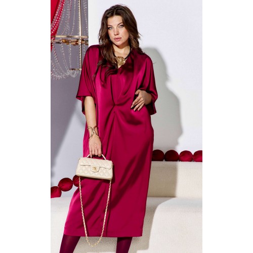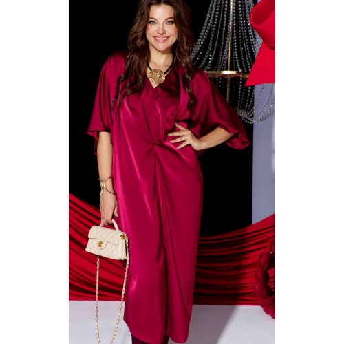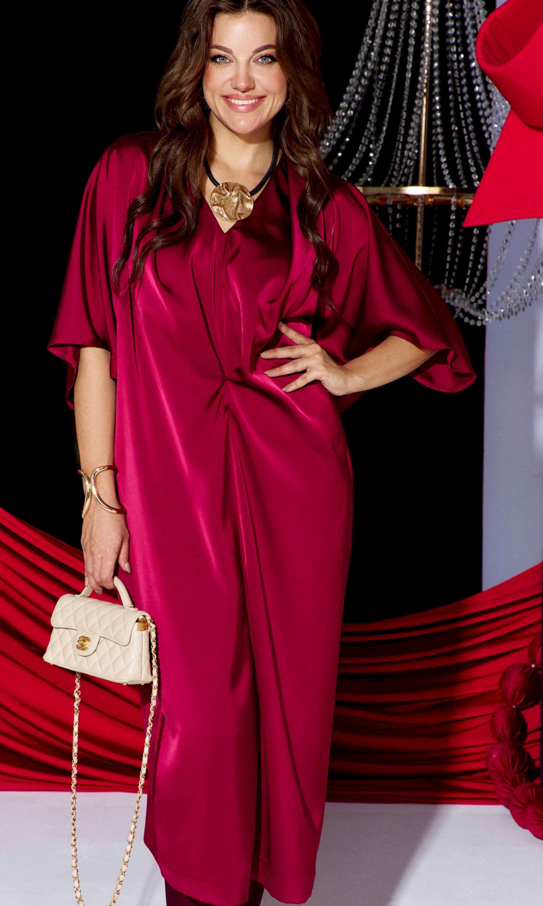 Это платье — олицетворение силы и изящности: ярко, но не кричаще. Уверенный, волнующий наряд для торжественных мероприятий и важных встреч. Силуэт «летучая мышь» мягко обтекает фигуру, создавая плавный переход между линией плеч и линией талии, затем свободно распускается по бокам, позволяя ткани играть волной при каждом движении. Вырез горловины V-образной формы подчёркивает изящную шею, а рукава добавляют образу лёгкую драматичность и женственность. По переду платья средний шов, с застроченной складкой выше уровня талии переходящую в складку по плечу. Спинка в платье со средним швом с разрезом от низа. Рукав в платье цельнокроеный со щеловидным вырезом проймы. Длина платья 123 см, длина рукава 48 см (р 52-56), 48,5 см (р 58-62).
