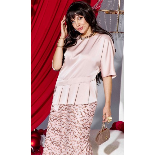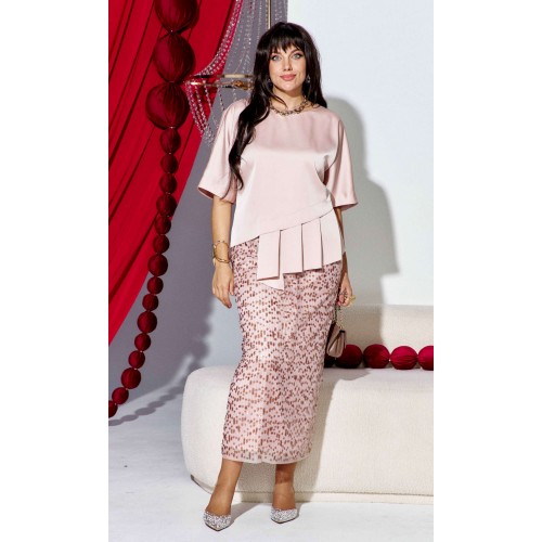 Комплект женский юбочный, состоящий из блузы и юбки. Комплект идеально подходит для вечерних торжеств, где важна каждая деталь, чтобы подчеркнуть изысканную женственность и уверенность в себе — светлый, элегантный и чуть волнующий наряд, который оставляет за собой шепот восхищения. Сочетание матового атласа и зеркального блеска пайеток создает идеальный дуэт. Блуза свободного силуэта, горловина округлой формы. По переду джемпера декоративная отлетная складка, с воланом с заложенными декоративными складками, он живет своей жизнью, колышется при каждом шаге, добавляя динамики и легкости верху. Он не пришит намертво, он «отлетает», создавая ощущение незавершенности и художественного хаоса. Рукав в блузе цельнокроеный, длиной ¾. Спинка в блузе со средним швом. Низ в блузе ассиметричный. Юбка прямого силуэта, длины миди с притачным поясом с эластичной тесьмой-резинкой в круговую, что обеспечивает максимально удобную посадку на любой тип фигуры. В среднем шве юбки разрез от низа. Длина спинки блузы 60 см (р 52-56), 61 см ( р 58-62), длина по переду право/лево 58/67 см (р 52-56), 59/69 см (р 58-62). Длина рукава 41 см. Длина юбки 90 см.