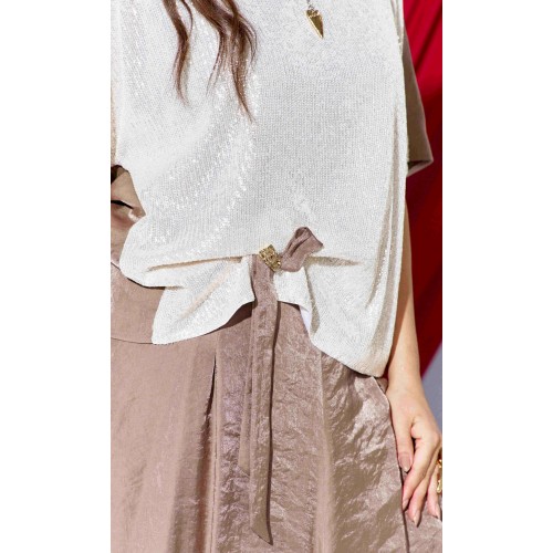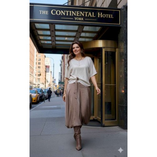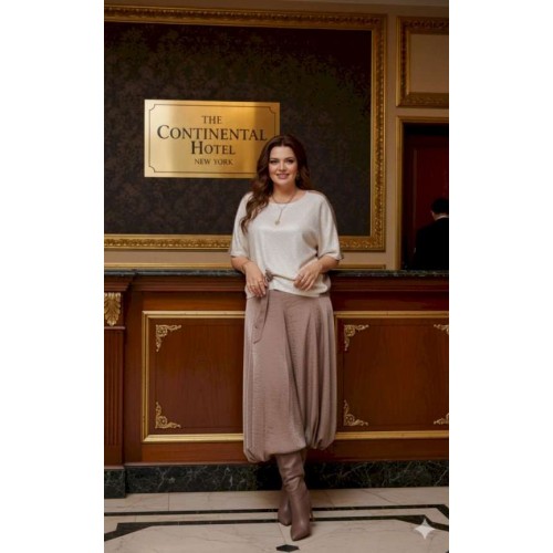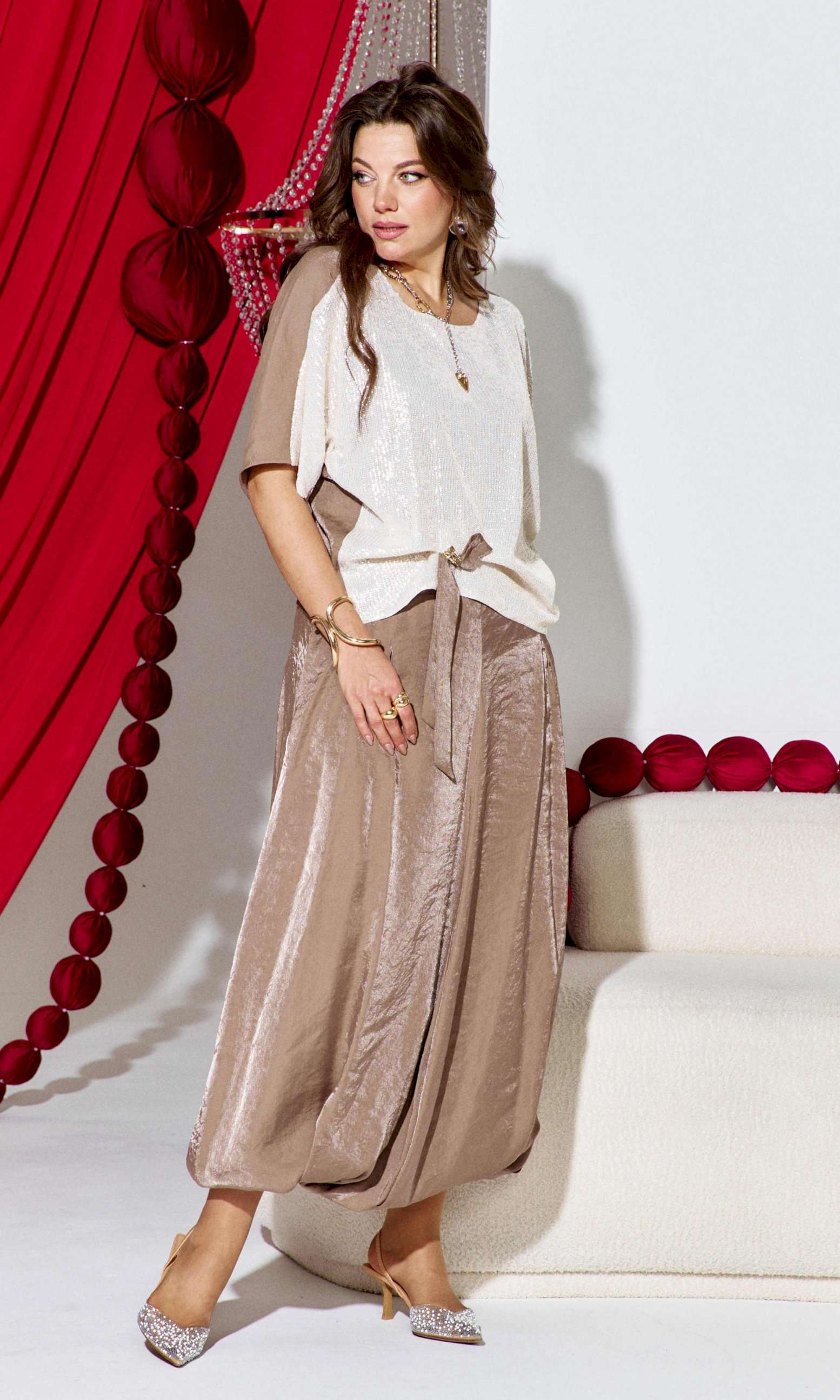 Комплект женский юбочный, двух-предметный, состоящий из блузы и юбки-балон. Комплект держится в гармонии за счёт контраста фактур: гладкая блуза с акцентной вставкой из отделочной ткани- светлой пайетки по переду и фактурным балоном юбки за счёт лёгкого перекрута по низу. Общий силуэт создаёт ощущение движения даже в статичном кадре. Этот наряд идеально подходит для торжественных мероприятий: он подчеркивает женственность, оставаясь при этом светлым и уверенным. Блуза свободного силуэта, с округлой формой горловины. Линия плеча в блузе переходит на перёд. По переду вставка из отделочной ткани- пайетки, от низа в качестве декоративного элемента заложена складка фиксирующаяся при помощи отделочной пуговицы и декоративной ленты из основной ткани. По спинки блузы отрезная кокетка. Рукав цельнокроеный, длиной ¾. В качестве дополнительного конструктивного элемента в блузе фигурные вставки « бочки». Юбка баллон, конической формы, расширяется к низу. По переднему и заднему полотнищу юбки фигурные подрезы переходящие в декоративные складки от низа, тем самым создавая необычный силуэт. Пояс в юбке притачной, со вставкой декоративной эластичной тесьмы-резинки в бочках. В среднем шве юбки застёжка на тесьму молнию и пуговицу по центру пояса. В боковых швах юбки карманы. Юбка на подкладке. Обращаем Ваше внимание, что фурнитура может незначительно отличаться от фото. Длина блузы 56 см (р 50-54), 57,5 см (р 56-60 см). Длина рукава (плеча) 39 см (р 50-54), 40 см (р 56-60 см). Длина юбки 95 см.