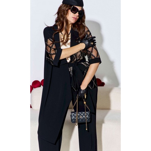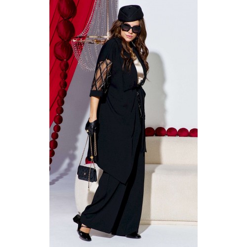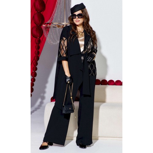 Комплект женский брючный, состоящий из жакета, блузы и брюк. Если Вы ищете идеальное сочетание стиля и комфорта, вот идеальный выбор. Мы специально подобрали качественную и тактильно приятную ткань, которая хорошо держит свою форму, создавая ощущение легкости и свободы движения. Оригинальный асимметричный крой, помноженный на пластические свойства ткани подчеркнет все, что нужно подчеркнуть, и скроет все, что нужно скрыть. Жакет свободного силуэта, ассиметричного кроя создан на контрастах глубокого черного цвета и полупрозрачной отделочной ткани. Жакет на запах, с ассиметричным воротником пиджачного типа и ассиметричным низом. Линия плеча спущенная, рукав втачной, длиной ¾ из полупрозрачной отделочной ткани с притачной манжетой по низу. Спинка в жакете со средним швом. В комплекте идёт пояс. Блуза прямого силуэта с округлой формой горловины и нагрудными вытачками по полочке. Спинка без особенностей. Низ в блузе фигурной формы. Брюки прямого силуэта, длинные. Пояс в брюках притачной на эластичной тесьме-резинке. По переду брюк прорезные карманы. Длина жакета по спинке 73,5 см (р 50-54), 74,5 см (р 56-60), длина рукава 27,5 см. Длина брюк по боковому шву 108 см. Длина блузы по спинке 63 см, длина рукава (плечо) 8 см (р 50-54), 8,5 см (р 56-60).