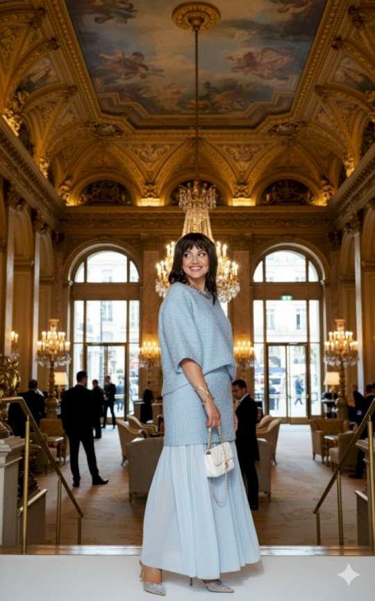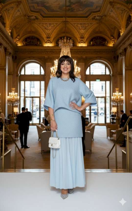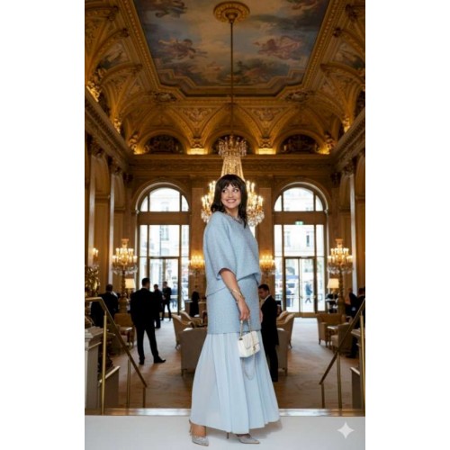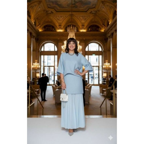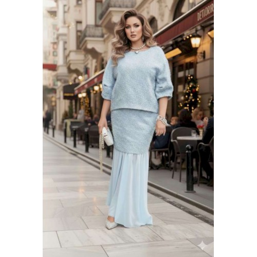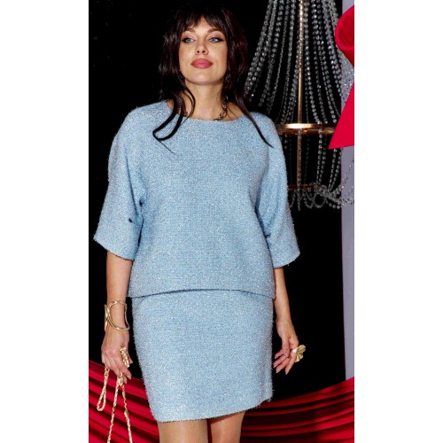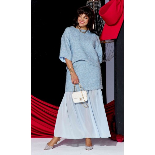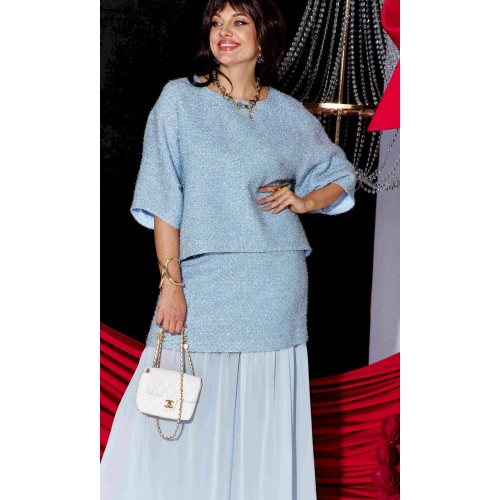Это стильный и современный юбочный костюм, созданный для особого случая. Он состоит из трёх частей: блузы, верхней и нижней юбки. Основу ткани составляет роскошный твид голубого цвета с металлическим блеском, в который искусно вплетена деликатная люрексовая нить, придающая полотну благородное мерцание. Он не только подчеркивает достоинства фигуры, но и дарит ощущение комфорта и роскоши. Блуза свободного силуэта, выполненная из плотной, фактурной ткани с серебристым блеском. Её простой крой с широкими рукавами создаёт расслабленный силуэт. Горловина в блузе округлой формы, по переду нагрудные вытачки. Спинка без особенностей. Рукав длиной ¾, широкий, фигурной формы с застроченной складкой. Низ в блузе ассиметричный. Юбка представляет собой многослойную конструкцию: верхний слой выполнен из той же блестящей ткани, что и блуза, и имеет прямой силуэт мини-длины. Нижний слой — это длинная, струящаяся юбка-макси из полупрозрачного, лёгкого шифона серого цвета. Такое сочетание фактур и длин создаёт интересный и динамичный образ. Верхняя юбка длины мини, прямого силуэта с притачным поясом со вставкой эластичной тесьмы- резинки в бочках. В среднем шве юбки застёжка на потайную тесьму-молнию и пуговицу в поясе. Юбка на подкладке. Нижняя юбка длины миди, со сборкой на резинку по верхнему срезу, с притачным воланом со сборкой от подреза. Длина блузы по спинке 59,5 см (р 50-54), 60,5 см (р 56-60), длина рукава 28,5 см. Длина юбки 106 см (р 50-54), 107 см (р 56-60). Нижняя юбка 44 см (р 50-54), 45 см (р 56-60).
