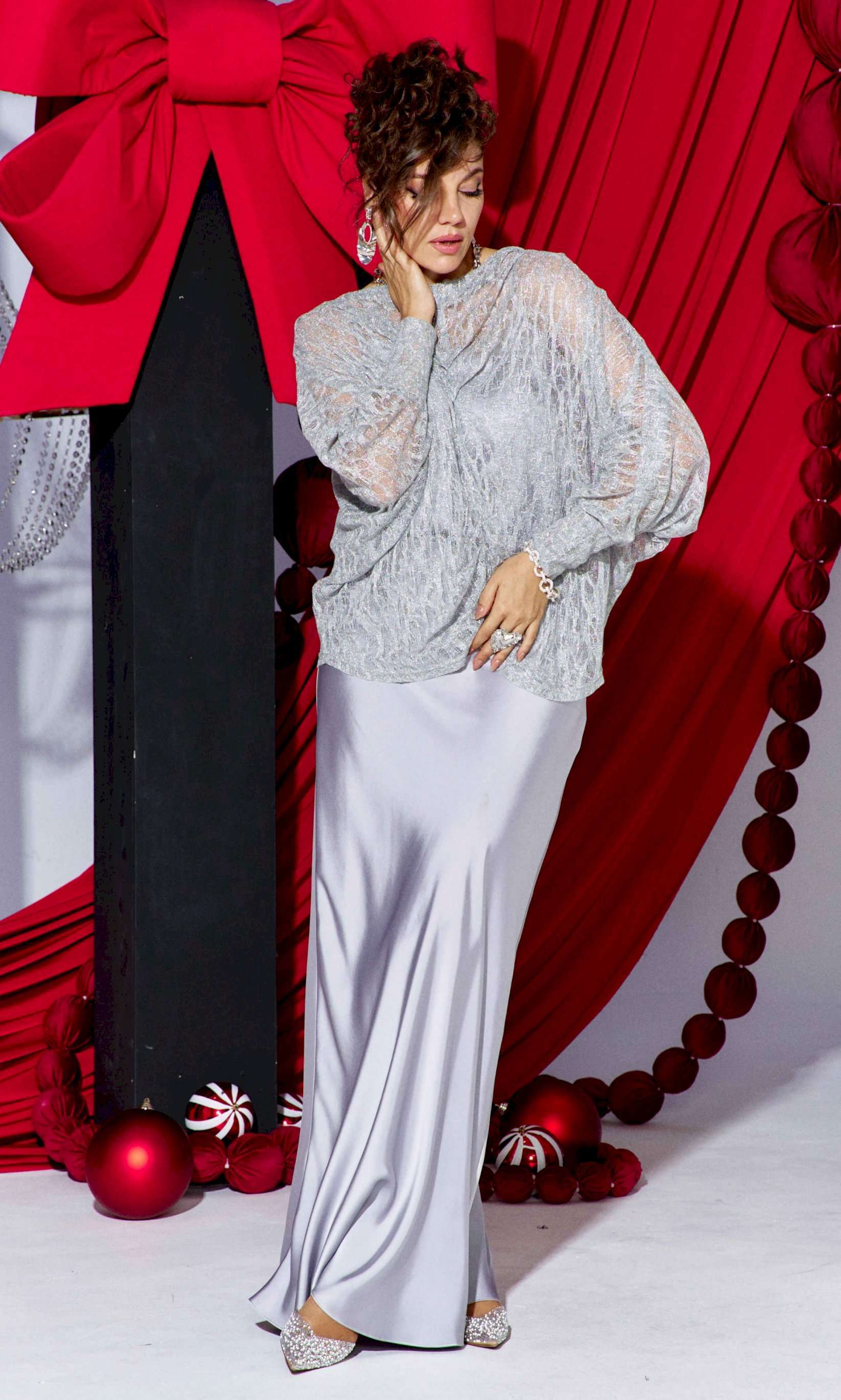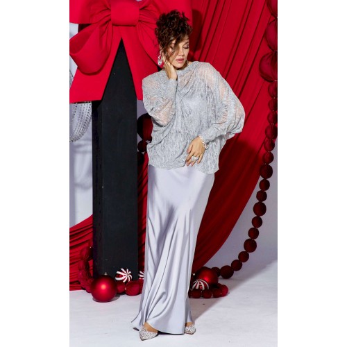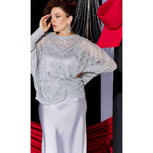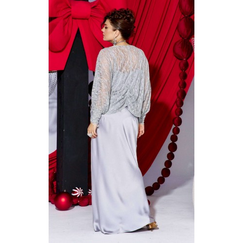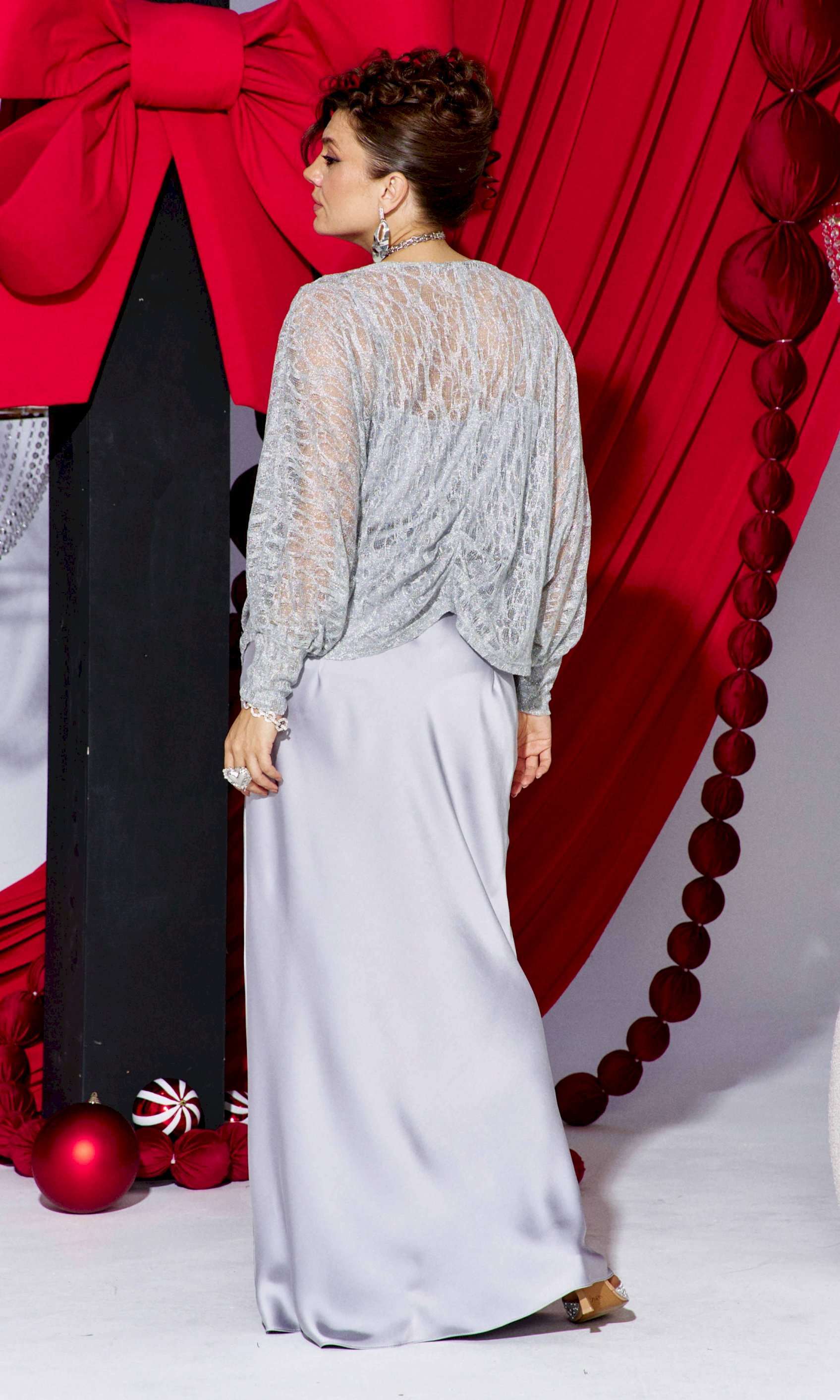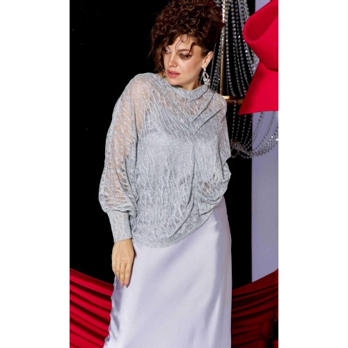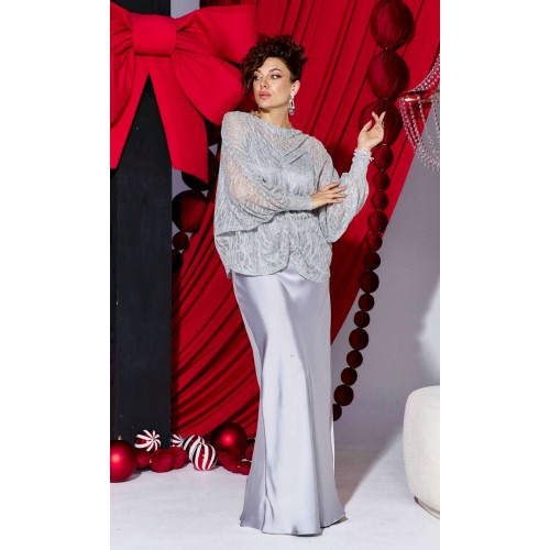 Комплект женский юбочный, состоящий из блузона, блузы и юбки. Комбинация текстур создаёт баланс между комфортом и эффектной внешностью. Тонкий трикотаж блузона держит верх мягко и деликатно, не перегружая образ, в то время как атласная юбка привносит лаконичную драму и движение. Их союз напоминает современную картину: спокойная энергия блузона встречается с холодной иронией юбки, образуя наряд, который подходит как для повседневной городской среды, так и для торжественных павильонов, когда нужен стиль без лишних слов. Блузон из тончайшего трикотажа держится на теле как вторая кожа: прозрачность ткани едва скрывает очертания силуэта, а тонкий плетёный рисунок ловко ловит свет, создавая игру полупрозрачных переходов. Его цвет— словно утренний туман, в котором каждая деталь дышит воздухом утончённости. Манжеты и блузона остаются эластичными и облегающими, подчёркивая плавные линии плеч и груди, без лишних объёмов, будто ткань шепчет о хрупкости и комфорте. По переду блузона средний шов с заложенными декоративными складками от горловины и от низа, направленные на встречу друг-другу. Рукав в блузоне цельнокроеный с притачной высокой манжетой. Блуза свободного силуэта, с нагрудными выточками по переду, и разрезами в боковых швах; на регулируемых бретелях. По спинки блузы вставка эластичной тесьмы-резинки, обеспечивающей максимально удобное прилегание. Юбка атласная в стальном металлическом оттенке добавляет образу холодной свежести и энергетического акцента. Юбка длины «миди» с притачным поясом, вставкой эластичной тесьмы-резинке в задней части пояса и застёжкой на потайную тесьму-молнию в боковом шве и пуговицу в поясе. Длина спинки блузы 53 см (р 50-54), 54 см (р 56-60), длина рукава 71. Длина топа 46 см. Длина юбки 93 см.