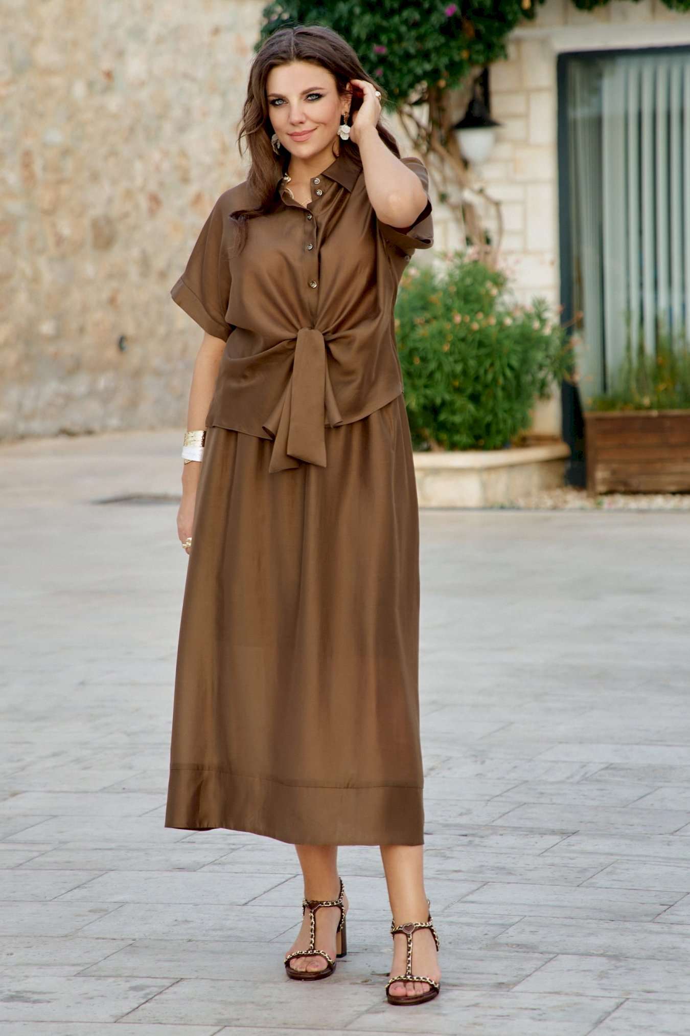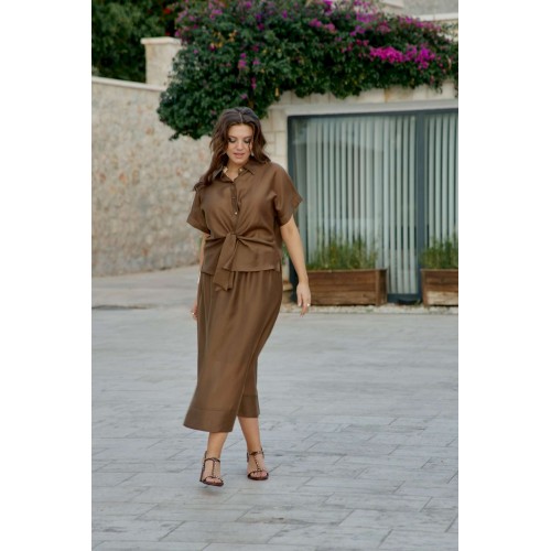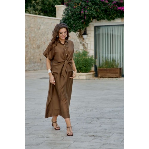 Блузка словно соткана из жидкого шоколада, застывшего в момент своего самого изысканного перелива. Это не просто одежда — это тонкая игра света и тени, где полупрозрачность становится не недостатком, а главной художественной задумкой. Шоколадный цвет здесь становится не просто оттенком, а полноценным персонажем этой визуальной истории — теплым, глубоким, с легкой горчинкой изысканности. А полупрозрачная, летящая ткань создаёт иллюзию невесомости и лёгкой таинственности. Блузка с центральной застёжкой на декоративные петли-пуговицы по планке, с воротником рубашечного типа. Её свободный крой обволакивает фигуру, не стесняя, а подчёркивая её естественные линии. Рукав в блузке цельнокроеный с притачной манжетой по низу. По переду блузки цельнокроеные отрезные детали завязывающиеся на бант. Спинка с отрезной кокеткой. В боковых швах блузки разрезы. Полупрозрачная шоколадная блузка — универсальный элемент, который работает в любом стиле. Ключ к успешному образу — баланс: если блузка воздушная и чувственная, низ должен быть более структурированным, и наоборот. Экспериментируйте с текстурами, не бойтесь контрастов и помните — эта вещь создана быть центром внимания в любом ансамбле. Длина блузы 56 см (р 50-54), 57,5 см (р 56-60), длина рукава 32 см (р 50-54), 33 см (р 56-60).