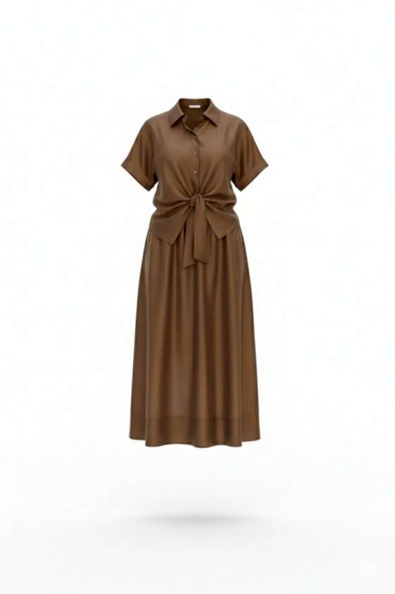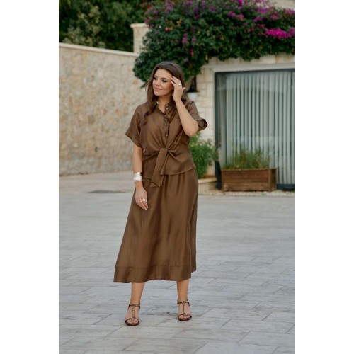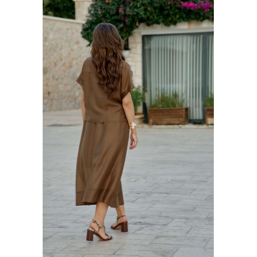 Юбка-трапеция из полупрозрачной ткани — это воплощение летней легкости и грации, ее силуэт расширяется от узкой линии талии мягко расходится к подолу, создавая воздушный объем, который танцует при каждом шаге. Ее полупрозрачность и благородный цвет позволяют создавать образы от нежно-романтичных до смело-городских. Ключ к успеху — баланс: воздушность юбки уравновешивается более структурированным верхом, а теплый шоколадный оттенок становится идеальной базой для любых цветовых акцентов. Юбка трапециевидного силуэта. Её форма одновременно структурирована и свободна: чёткие линии кроя сочетаются с текучестью материала. Длина юбки — до середины икры или чуть ниже, позволяя демонстрировать изящные лодыжки и удобную летнюю обувь. При ходьбе юбка образует красивые волны, её полы расходятся, обнажая мгновениями ногу, чтобы тут же снова сомкнуться в элегантном движении. Пояс в юбке притачной, на эластичной тесьме-резинке, что обеспечивает максимально удобную посадку на любой тип фигуры, по низу притачная деталь в сгиб в виде планки. Юбка на подкладке. Длина юбки 87 см.
