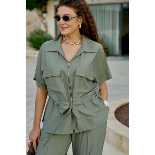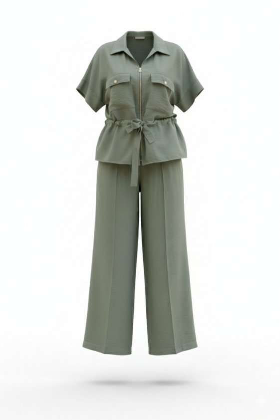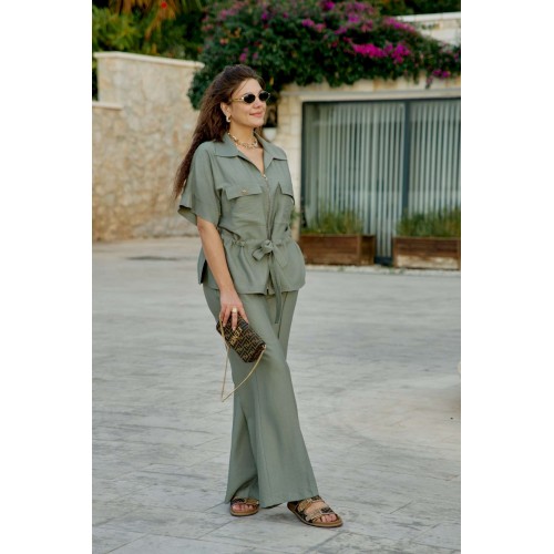 Летние брюки цвета хаки — это не просто предмет гардероба, а инструмент самовыражения. Они сочетают в себе практичность и элегантность городских брюк, натуральность оттенков и универсальность нейтральной палитры. Эти брюки подходят для женщины, которая не делит жизнь на \"повседневное\" и \"особенное\" — для неё каждый день может быть особенным, если правильно его одеть. Они говорят: \"Я готова к приключениям, но делаю это стильно\". В конце концов, настоящий стиль — это не про следование правилам, а про умение создавать свои, и брюки цвета хаки дают для этого идеальный холст. Сочетания: с спортивным топом — для активного дня; с oversize — расслабленный вайб; с футболкой с графическим принтом — молодёжный дух. Брюки прямого силуэта с притачным поясом на эластичной тесьме-резинке, что обеспечивает максимально удобную посадку на любой тип фигуры. По переду брюк застрочены «кантики». Это конструктивный приём, который позволяет визуально вытягивать фигуру. По переду брюк наклонные карманы. Длина брюк 108 см.