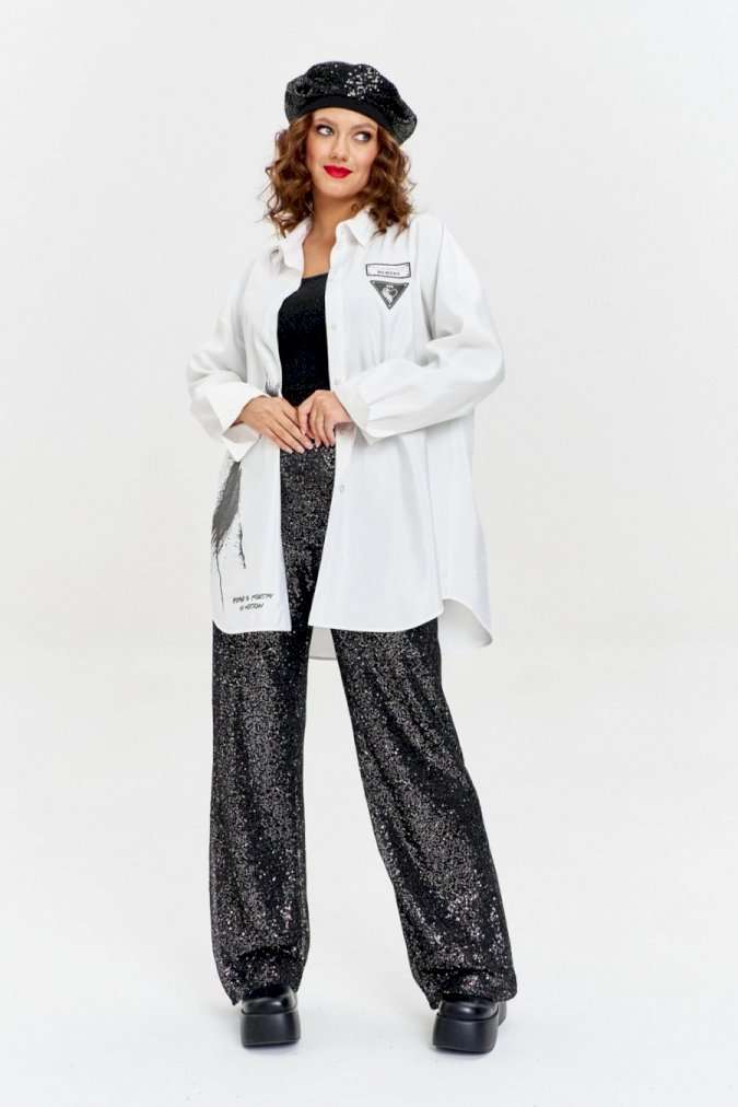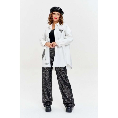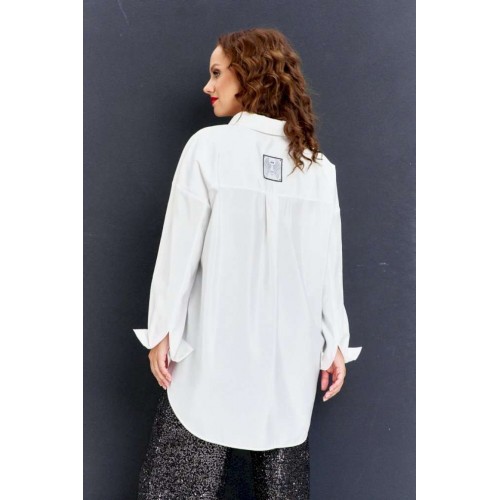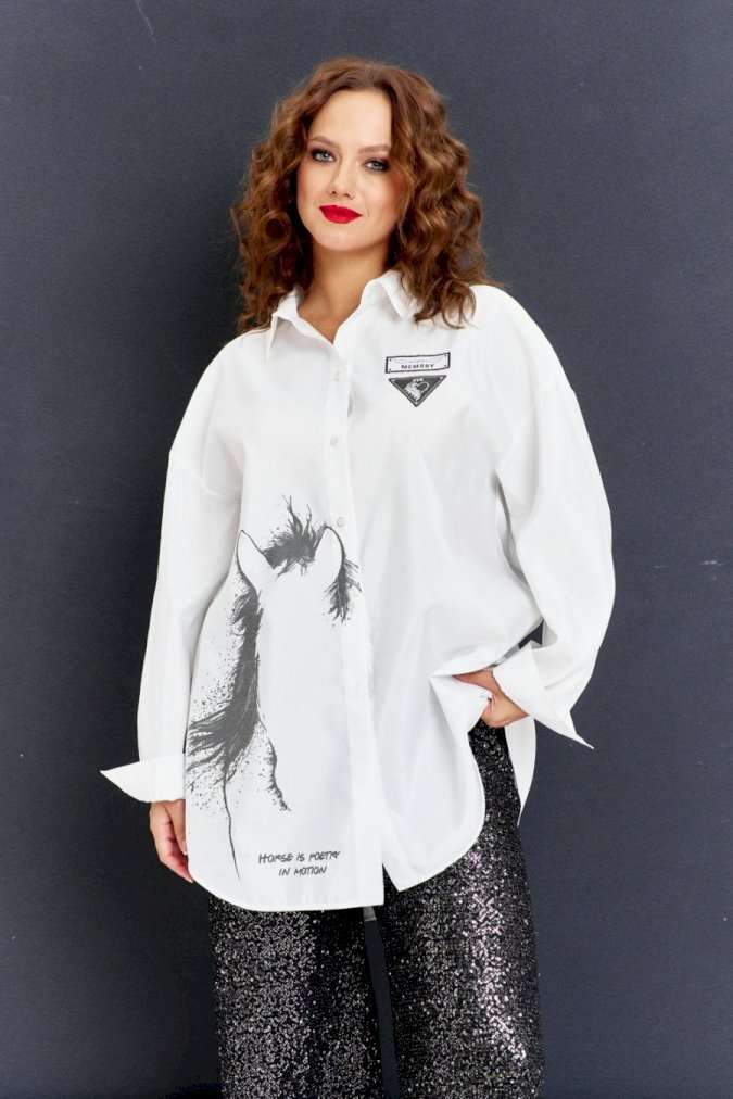 Рубашка свободного силуэта, с застежкой на пуговицы спереди, с длинным рукавом и рубашечным воротником. Спинка с отрезной кокеткой и бантовой складкой. Изделие декорировано авторским принтом и нашивками.