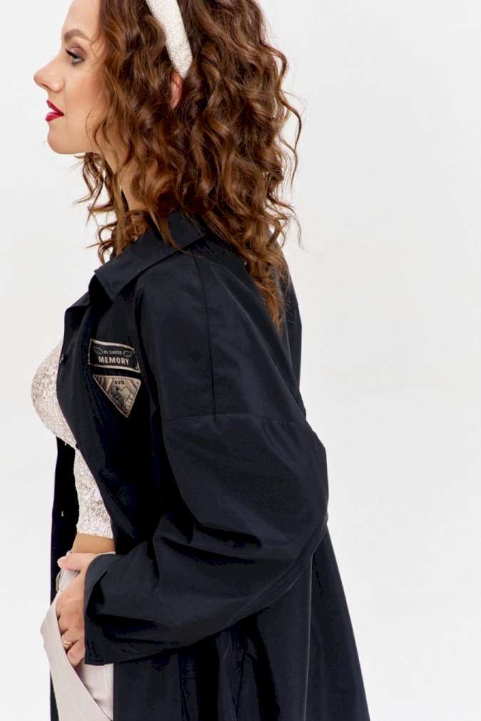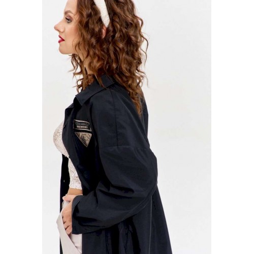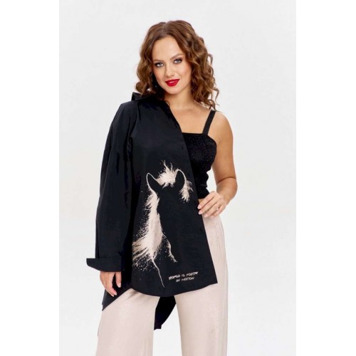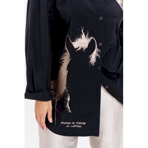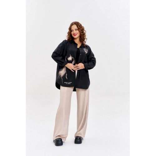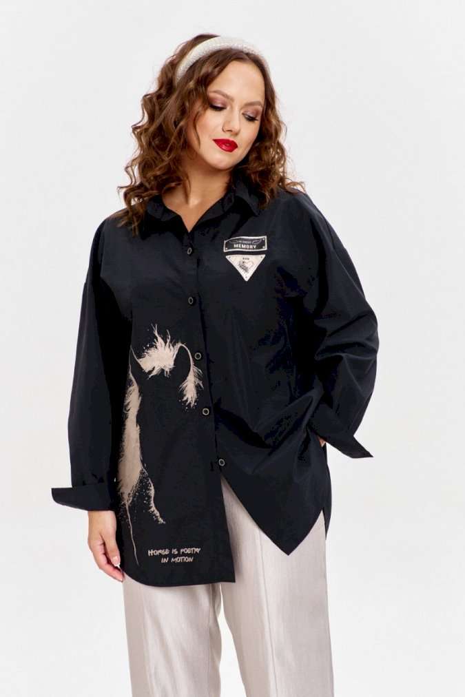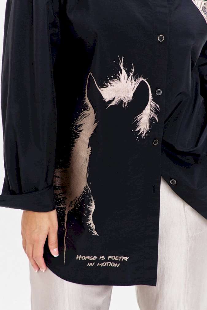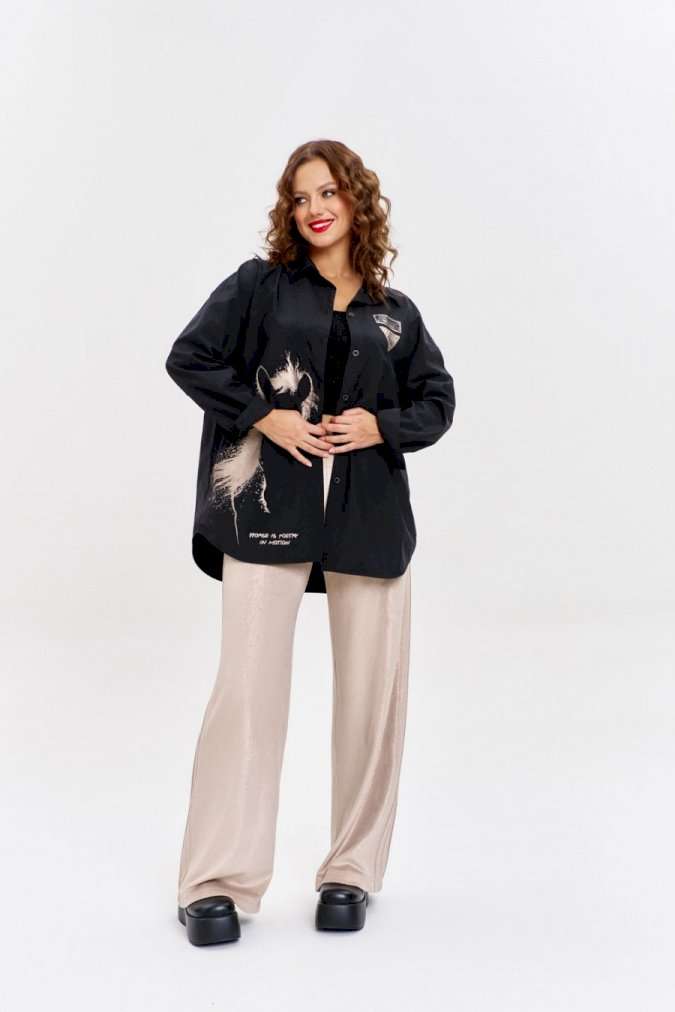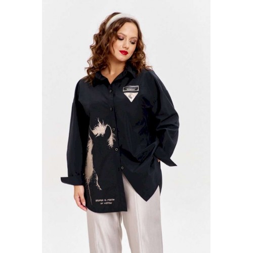 Рубашка свободного силуэта, с застежкой на пуговицы спереди, с длинным рукавом и рубашечным воротником. Спинка с отрезной кокеткой и бантовой складкой. Изделие декорировано авторским принтом и нашивками.