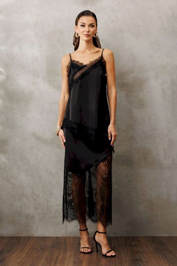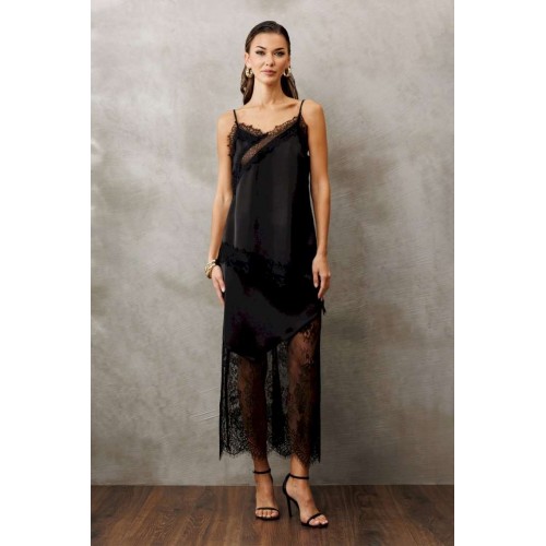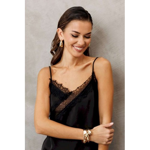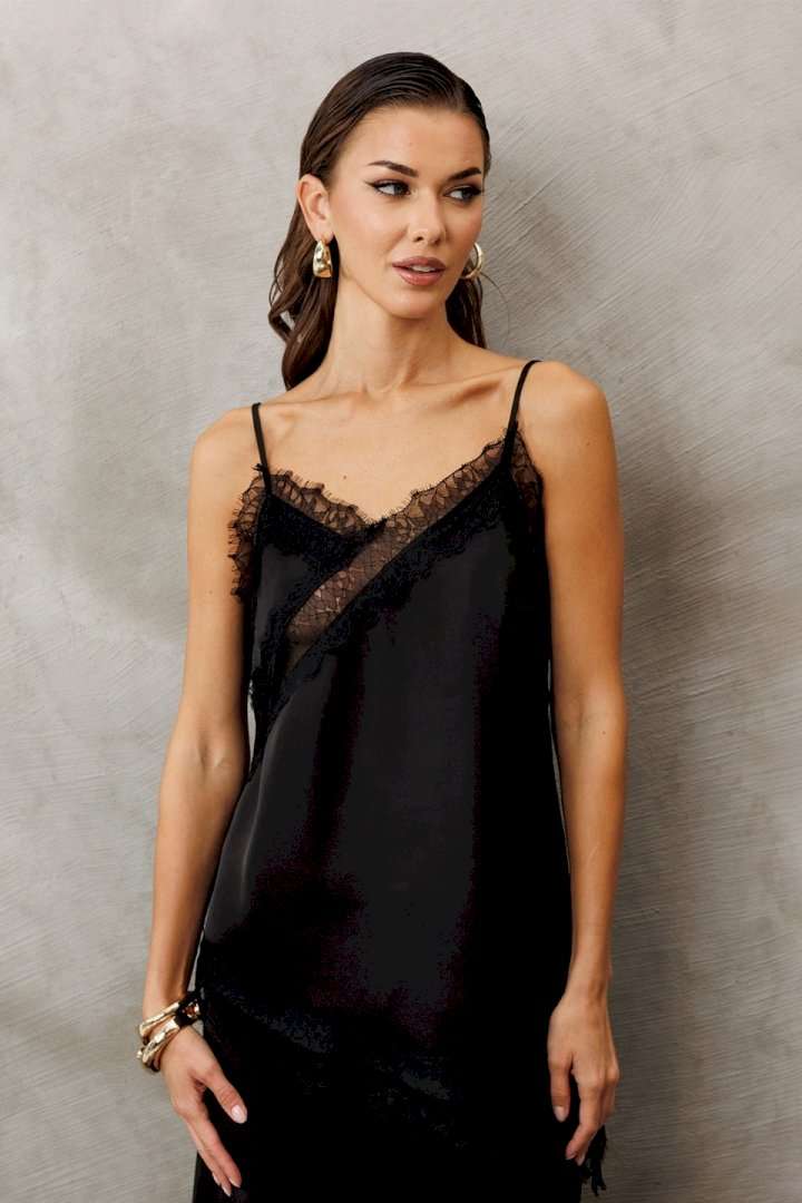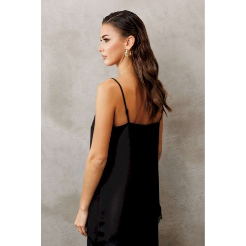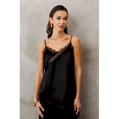 Элегантная атласная блузка-топ классического черного цвета представляет собой идеальное сочетание утонченности и стиля. Дизайн изделия украшен изысканным кружевом на регулируемых бретелях, добавляющих нотку изящества и позволяющих подстроить длину под индивидуальные предпочтения. Блузка выполнена с V-образным вырезом горловины, обрамленным кружевной отделкой, что придает образу особую привлекательность. Асимметричный низ дополнен аналогичным кружевным элементом, создавая легкий и воздушный силуэт. Этот топ идеально подходит для создания как элегантных, так и повседневных ансамблей, подчеркивая изысканный вкус своей обладательницы.