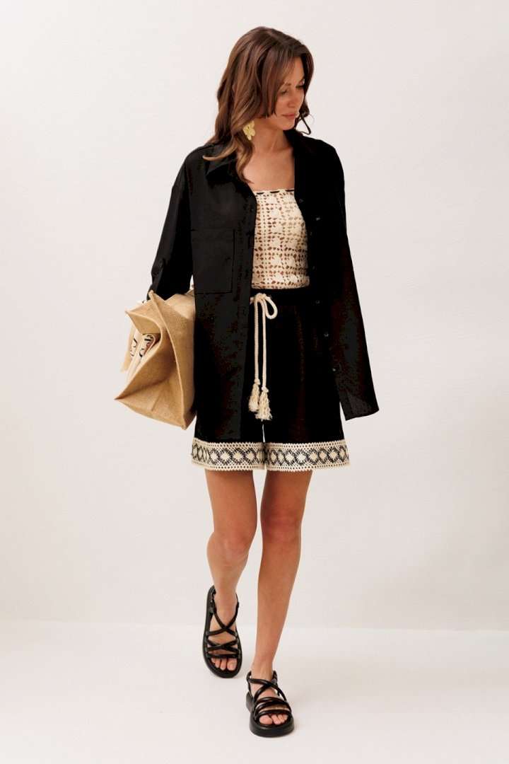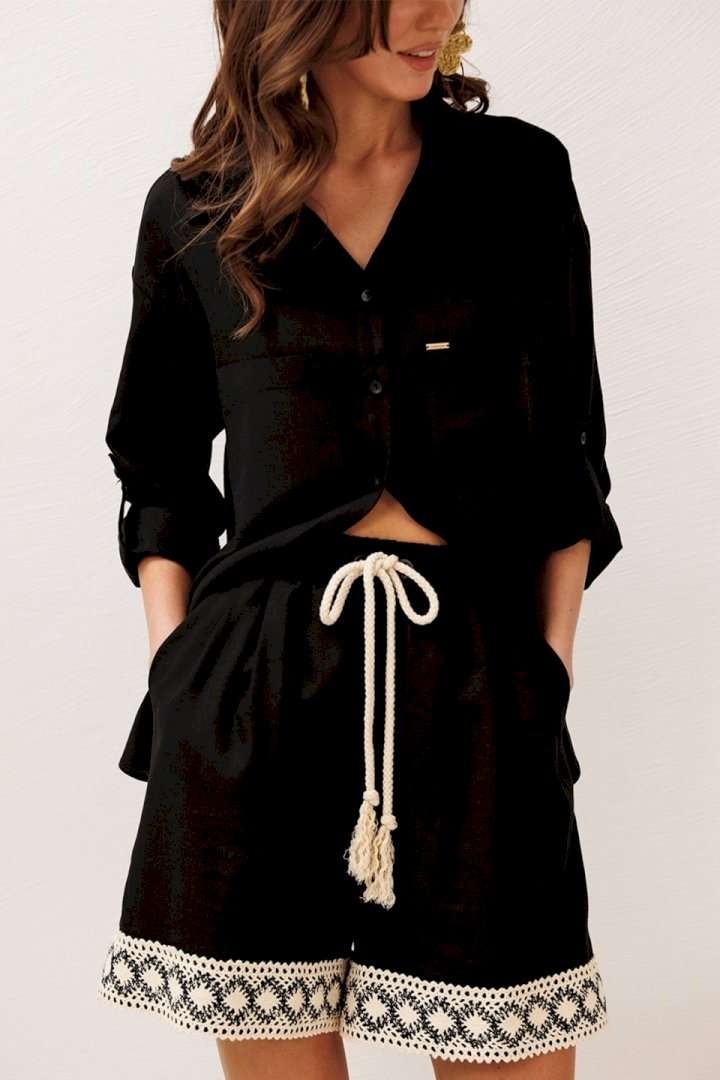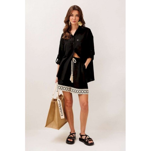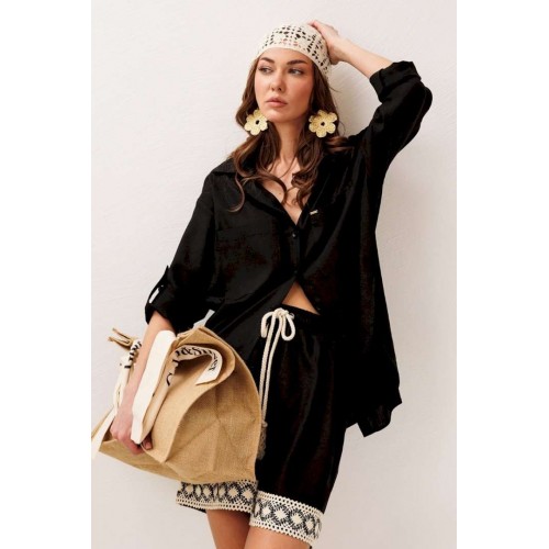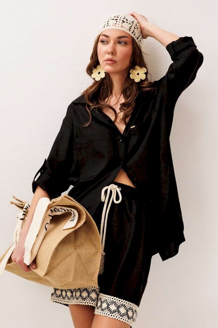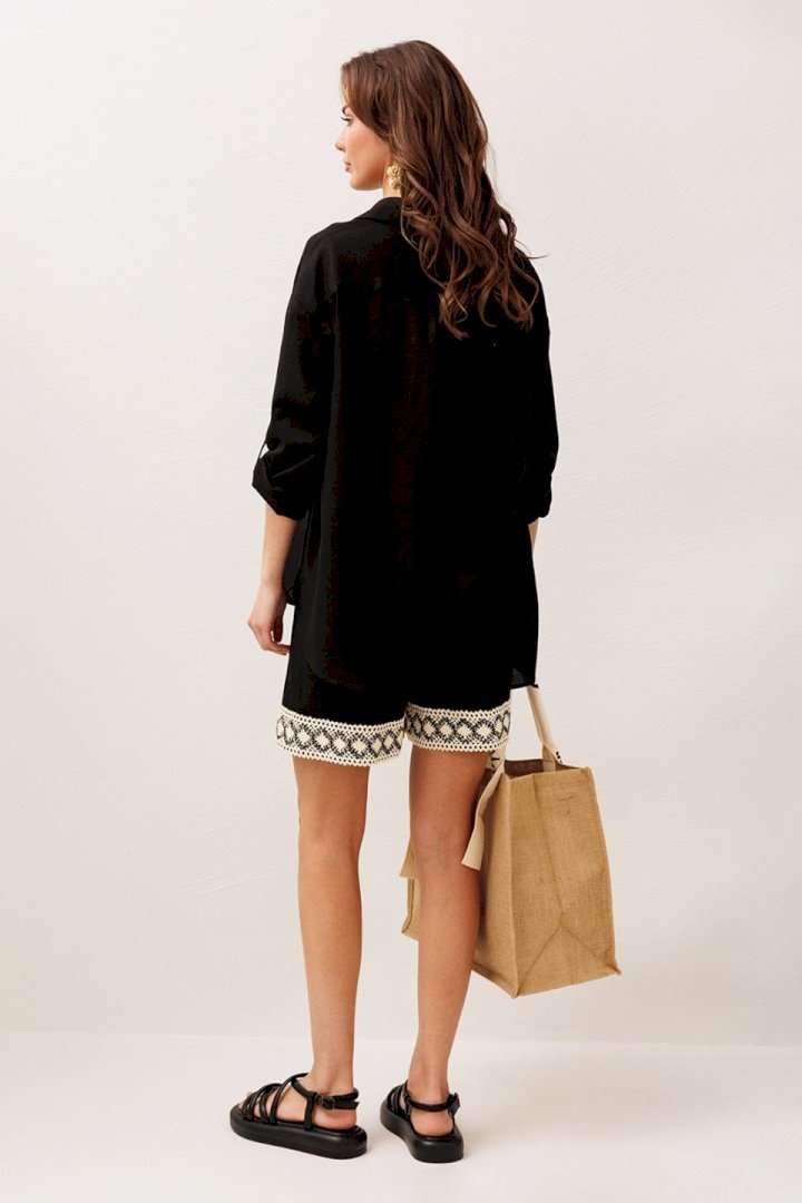Блузка 3317 черный BUTER — это стильное решение на каждый день. Коллекция бренда BUTER отличается простотой и элегантностью. Сделанная из комбинации 55% льна и 45% вискозы, эта блузка обеспечивает комфорт и легкость в носке. Прямой силуэт и рубашечный воротник на стойке придают модели строгость и элегантность, а центральная застежка на пуговицы облегчает использование. Втачные одношовные рукава с патой и манжетами с застежкой на петлю-пуговицу делают эту модель интересной и функциональной. Настроченные карманы с нашивкой придают блузке уникальность и современный вид. Отлично подходит для весенне-летних и демисезонных образов в офисном или повседневном стиле.