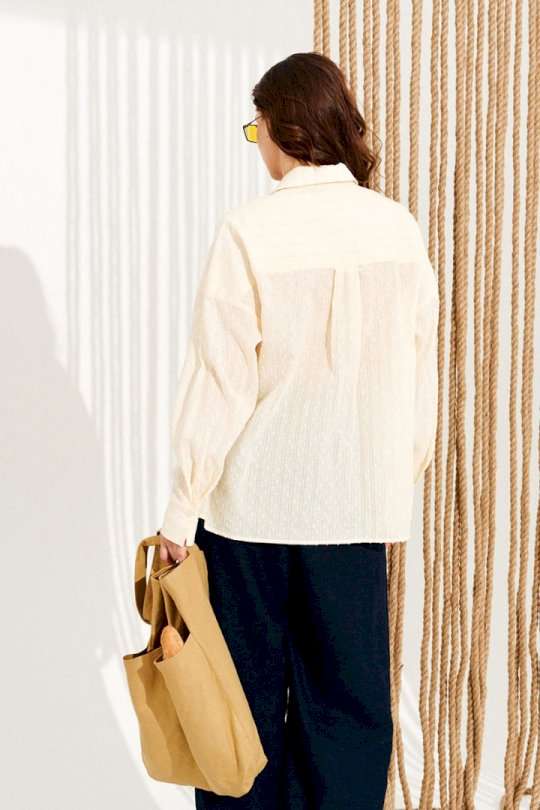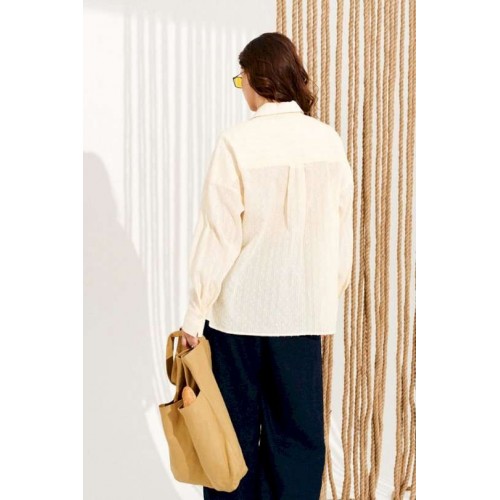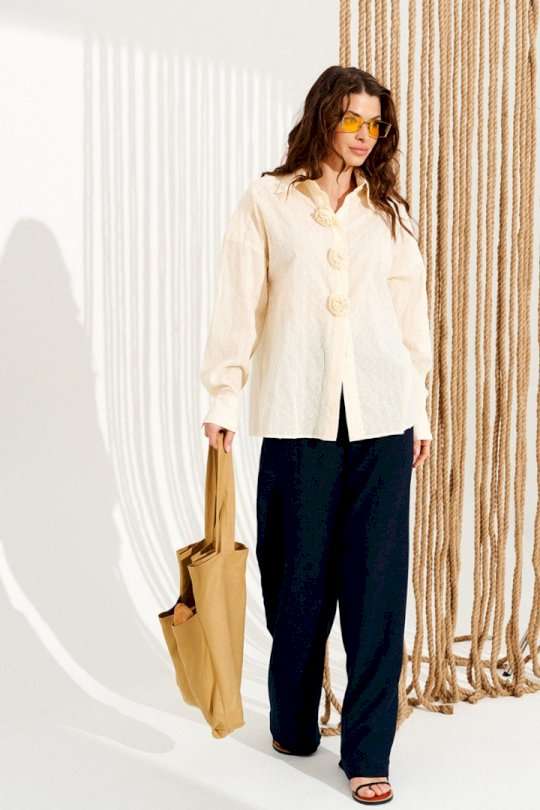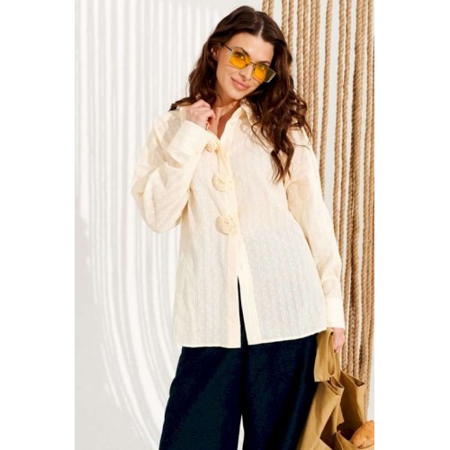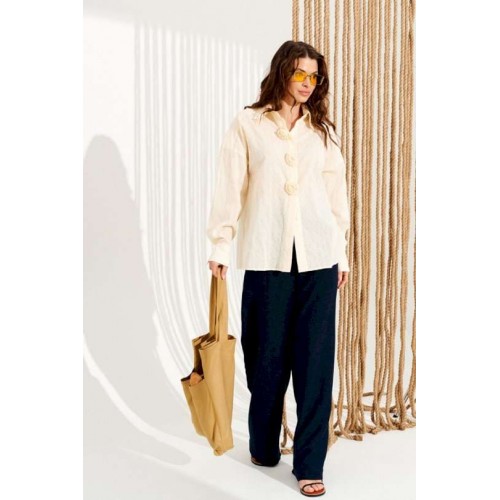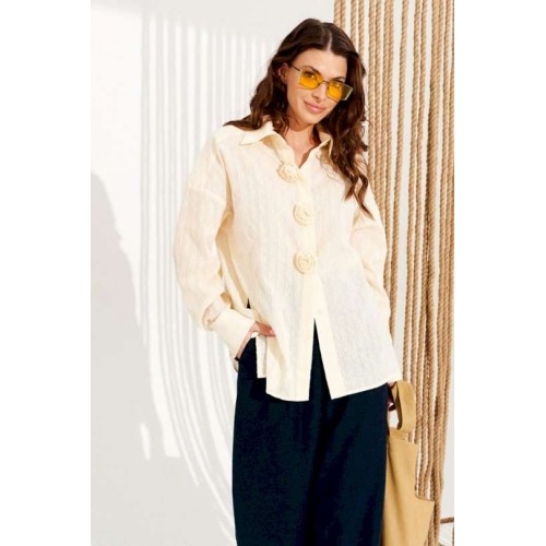 Блузка умеренного объема, прямого силуэта. Воротник стояче-отложной на отрезной стойке. Застежка центральная потайная, с цельнокроеными планками на петли и пуговицы. По переду планки декорированы розочками из основной ткани. Спинка с притачной кокеткой и бантовой складкой. Боковые швы заканчиваются разрезами. Рукав втачной, одношовный, длинный. Нижний срез рукава с разрезом и складкой, обработан притачной манжетой с застежкой на одну петлю и одну пуговицу. Длина изделия на модели вдоль середины спинки — 68,5 см (допустимое отклонение +/- 1 см)