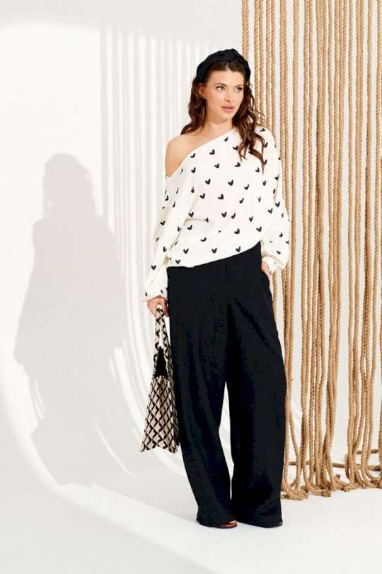 Блузка свободного объема, прямого силуэта. Вырез горловины формы «лодочка». Горловина обработана цельнокроеными обтачками. Левый плечевой шов по переду оформлен сборкой. Спинка цельная. Рукав втачной, одношовный, длинный. Нижний срез рукава со сборкой и разрезом, обработан притачной манжетой с застежкой на одну петлю и одну пуговицу. Длина изделия на модели вдоль середины спинки — 62 см (допустимое отклонение +/- 1 см)