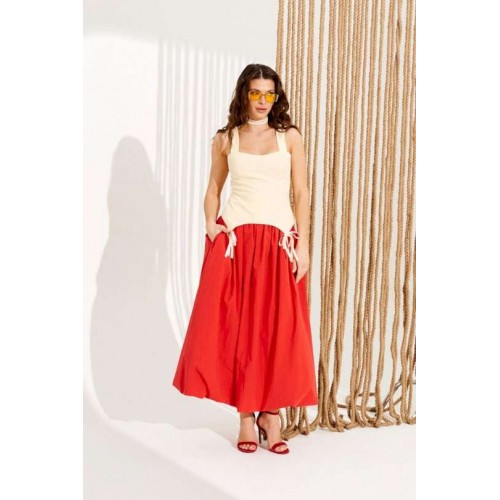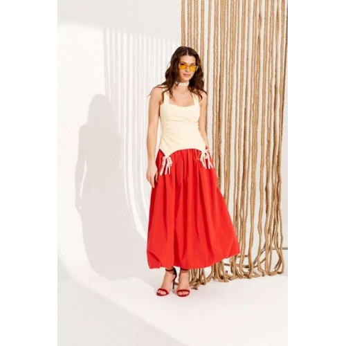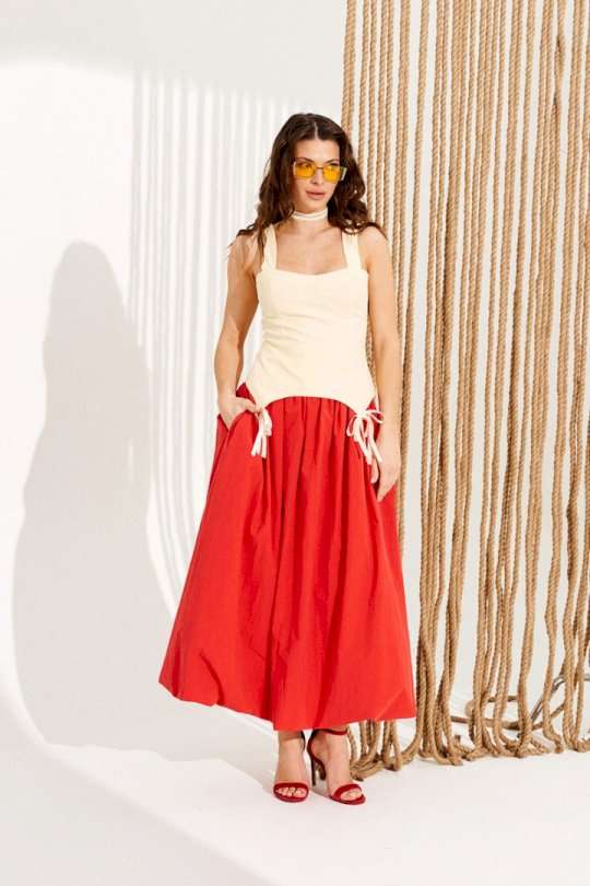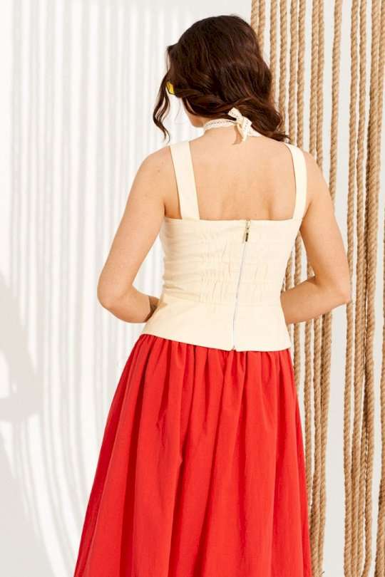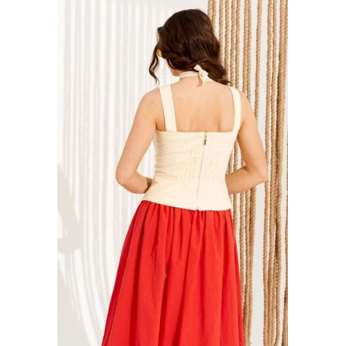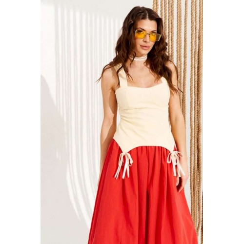 Блузка приталенного силуэта, отрезная по линии талии, на бретелях и подкладке. Перед с рельефами, отрезными чашками, фигурной линией низа и декоративными бантами. Спинка с рельефами, средним швом и застежкой на тесьму-молнию. Центральные части спинки прострочены эластичной тесьмой. Длина изделия на модели вдоль середины спинки с учетом бретели — 48 см (допустимое отклонение +/- 1 см)
