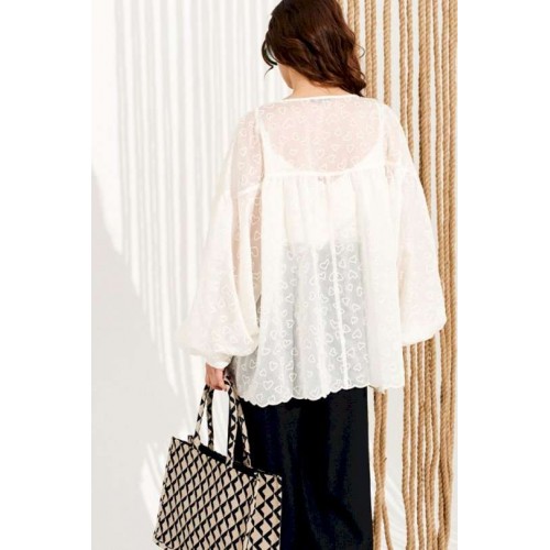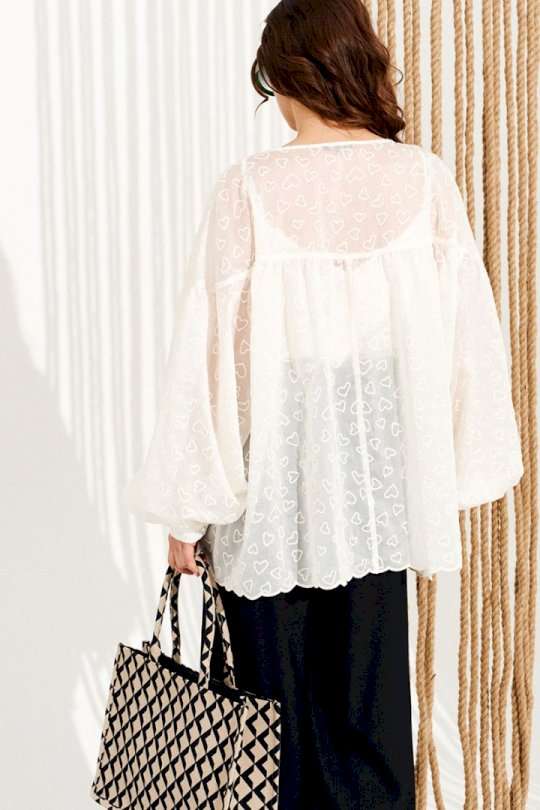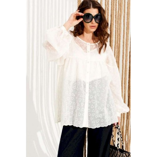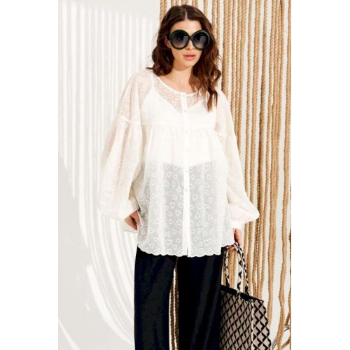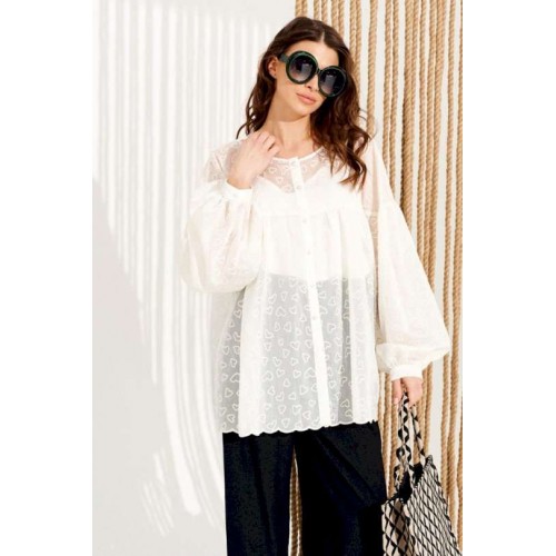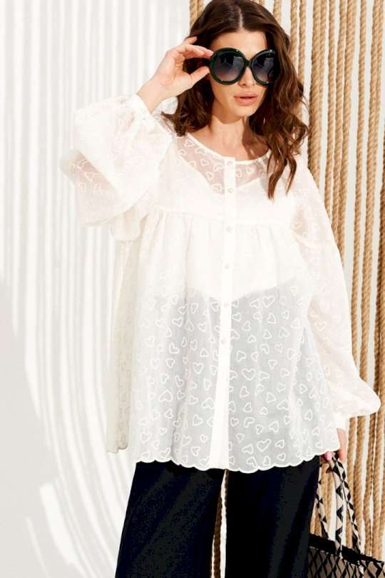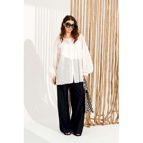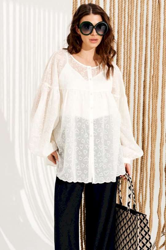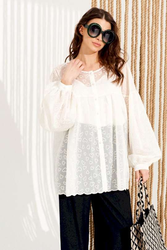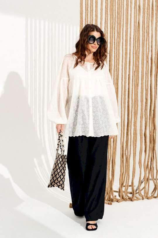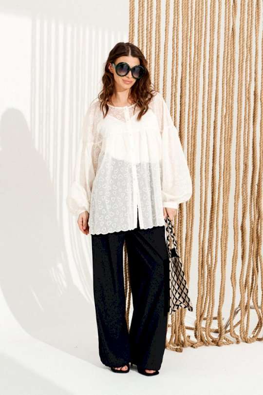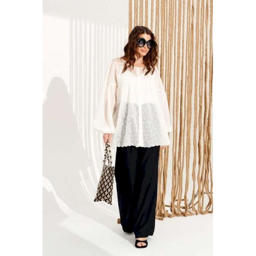 Блузка свободного объема, прямого силуэта, с круглым вырезом горловины и центральной застежкой на петли и пуговицы. Детали переда и спинки с отрезными кокетками. Нижняя деталь спинки со средним швом. По верхнему краю переда и спинки выполнена сборка, выходящая из-под кокетки. Рукав втачной, одношовный, длинный, со сборкой по нижнему срезу. Нижний срез рукава обработан притачной манжетой с застежкой на одну петлю и одну пуговицу. Длина изделия на модели вдоль середины спинки — 71,5 см (допустимое отклонение +/- 1 см)