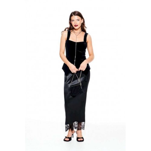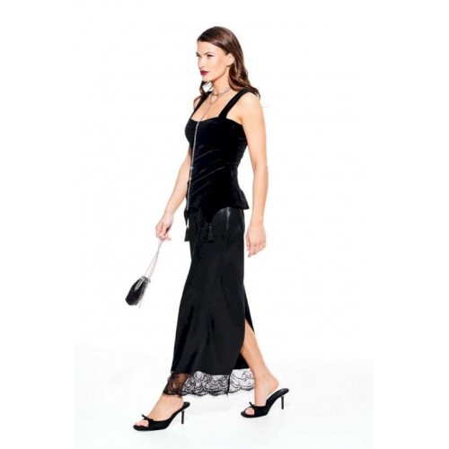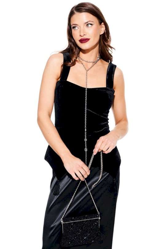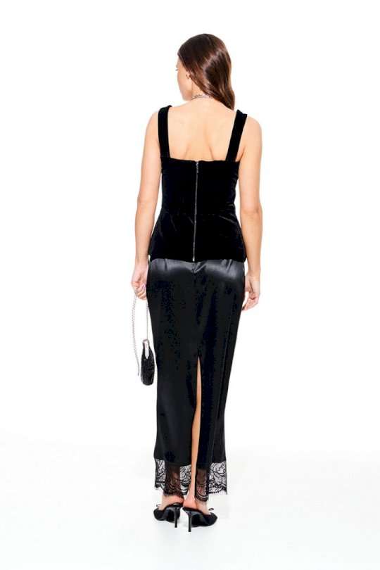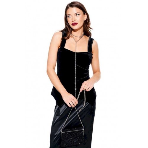 Блузка из бархата на трикотажной основе, приталенного силуэта, отрезная по линии талии, на бретелях, на подкладке. Лиф переда с рельефами и отрезными чашками, с фигурной линией низа, декоративными кисточками из бахромы. Спинка с рельефами и средним швом, застежкой на тесьму-молнию. Центральные части спинки прострочены эластичной тесьмой.