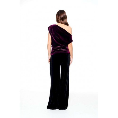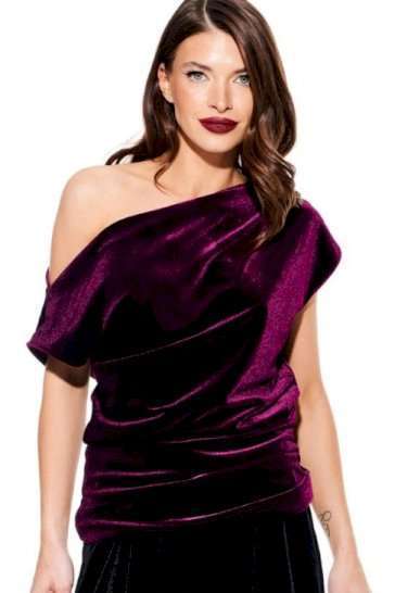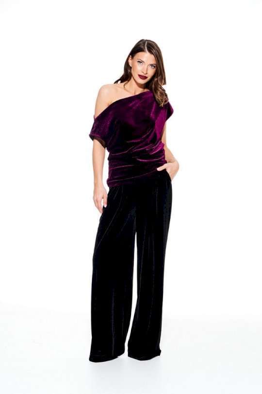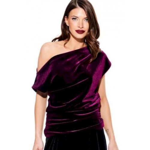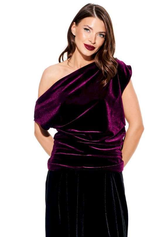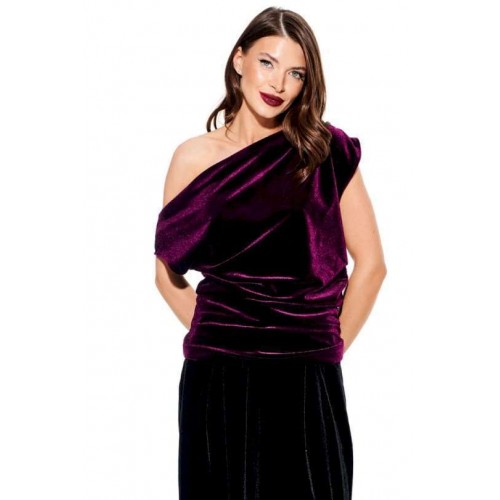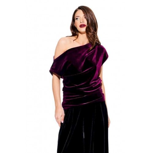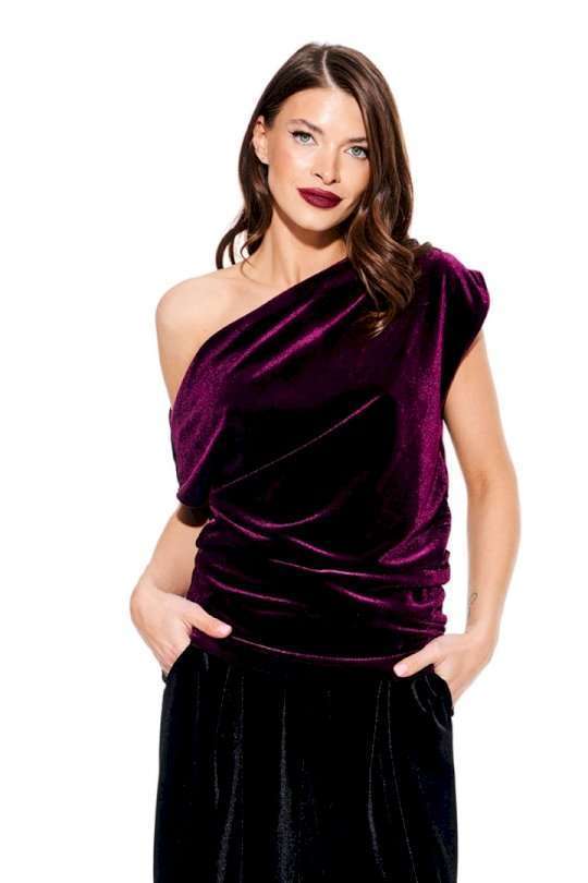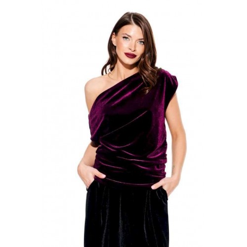 Блуза из бархата на трикотажной основе, умеренного объема, полуприлегающего силуэта с акцентом на одно плечо, с фигурной драпировкой на уровне груди. Вырез горловины в форме лодочки. Левый плечевой и боковой шов оформлены сборкой. Длина до линии бедер.