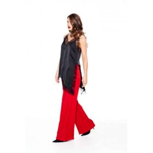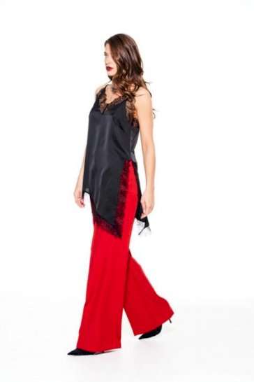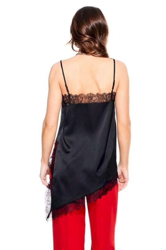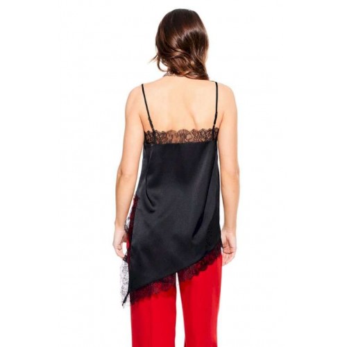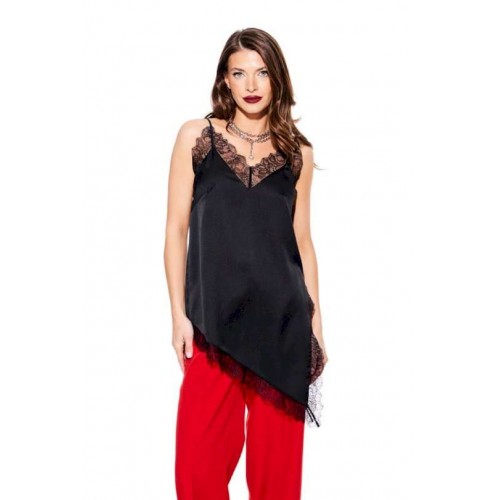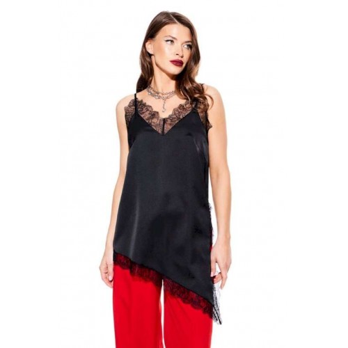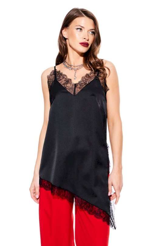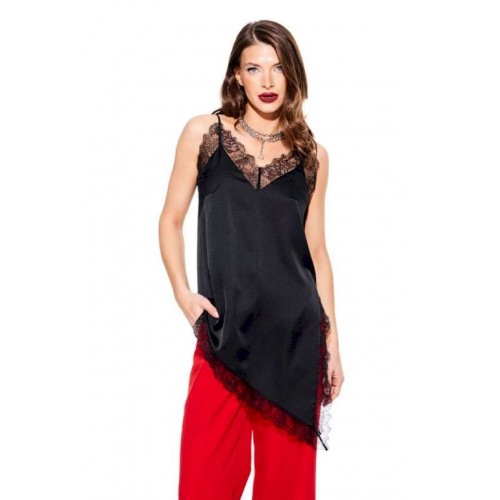 Блузка из струящейся ткани с блеском, с асимметричной линией низа, отделкой из кружева, на тонких регулируемых бретелях. Перед с V-образным вырезом горловины и нагрудными вытачками. В левом боковом шве фигурный разрез. Горловина, линия низа и разрез оформлены тесьмой из кружева.
