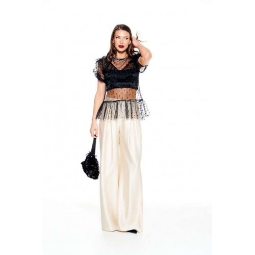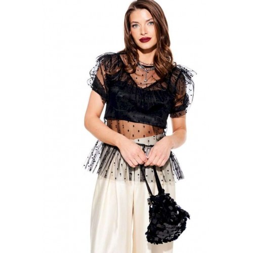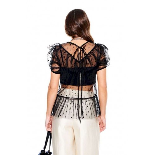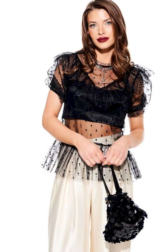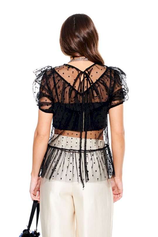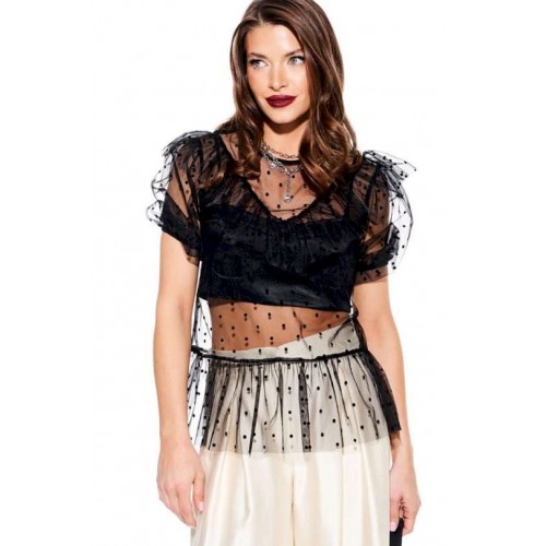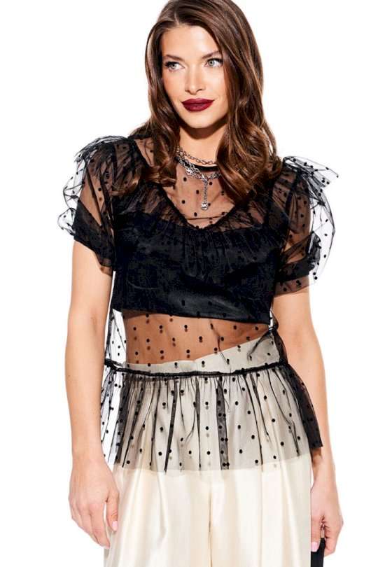 Блузка из различных материалов. Верхний слой блузки из сетчатого материала в горошек, полуприлегающего силуэта, с круглым вырезом горловины. Детали полочки и спинки с горизонтальным подрезом и отрезной фигурной кокеткой с воланом. Нижние части полочек и спинки собраны на сборку. Спинка с завязками на горловине. Кокетка спинки с средним швом и разрезом. Рукав втачной, короткий, со сборкой на резинку по нижнему срезу. Нижняя блузка из струящейся ткани с блеском, прилегающего силуэта, на тонких регулируемых бретелях, на подкладке. Лиф переда с рельефами и отрезными чашками. Спинка с рельефами, с центральной застежкой на тесьму-молнию.