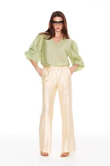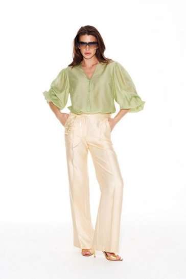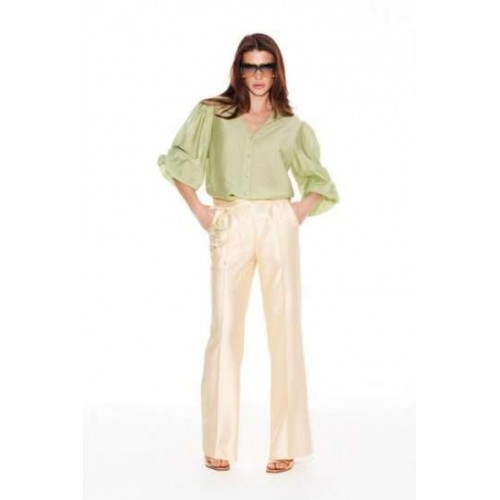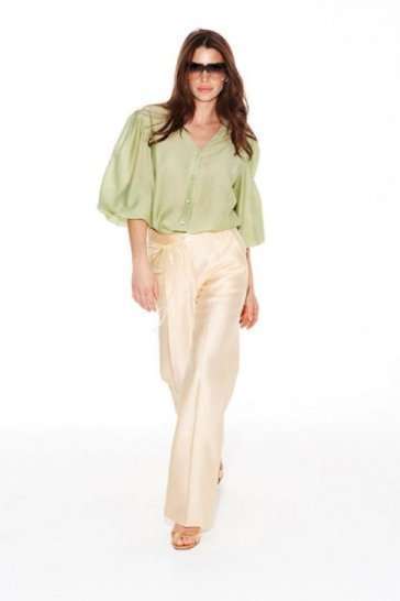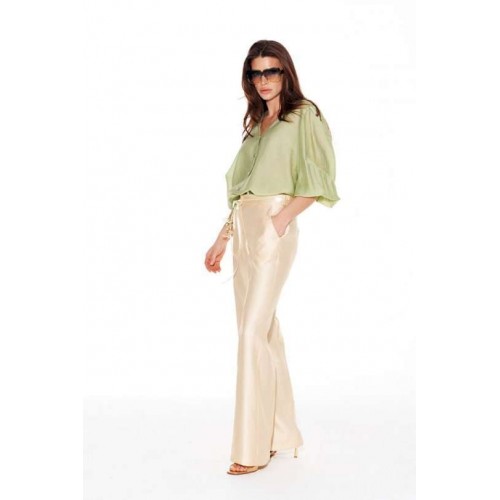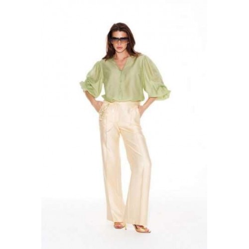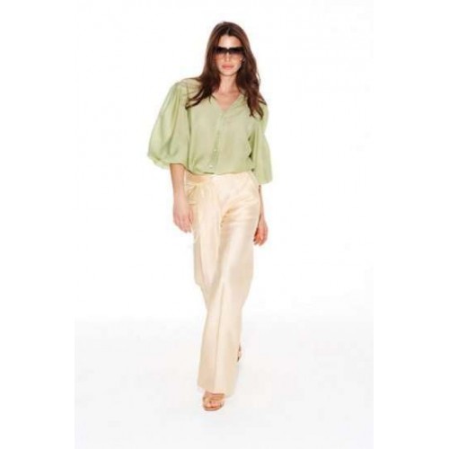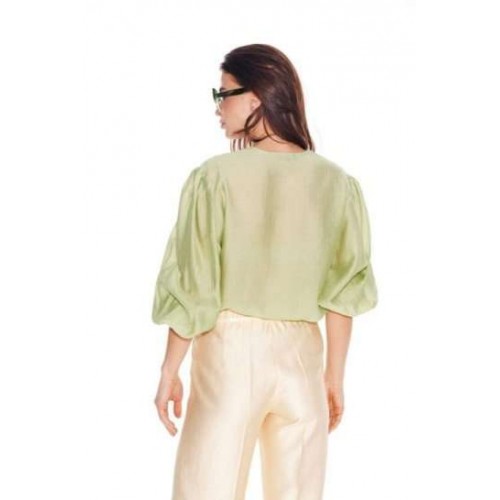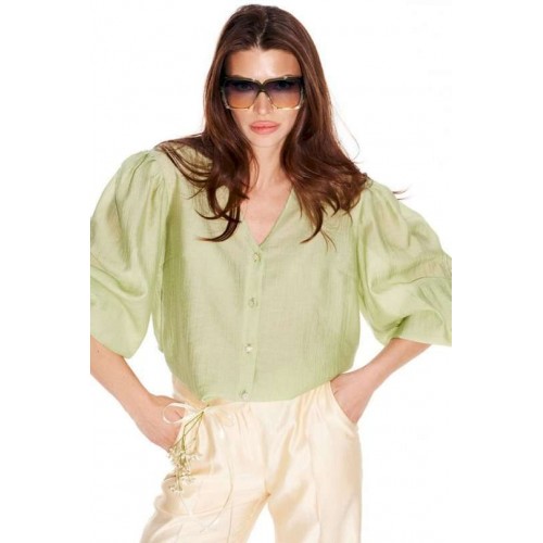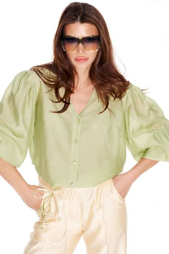 Блузка умеренного объема, прямого силуэта, с центральной застежкой на петли и пуговицы. Горловина переда с V-образным вырезом. Детали переда с нагрудными вытачками. Спинка цельная. Боковые швы заканчиваются разрезами. Рукав 3/4, втачной, одношовный, со сборкой по верхнему и нижнему срезам. Нижний срез рукава оформлен притачной манжетой со сборкой на резинку.