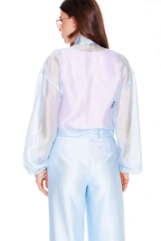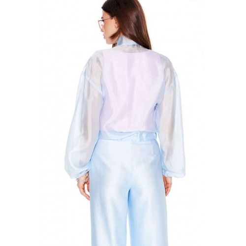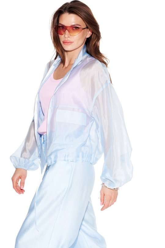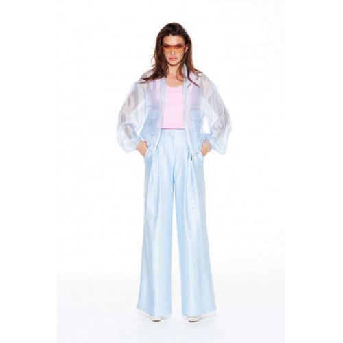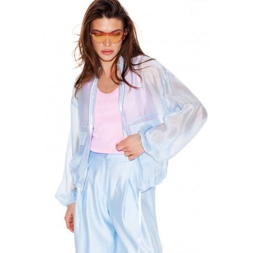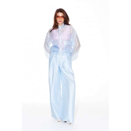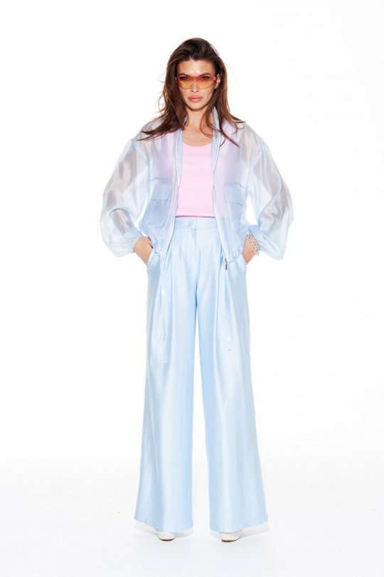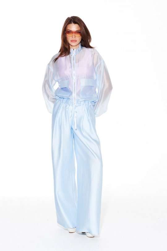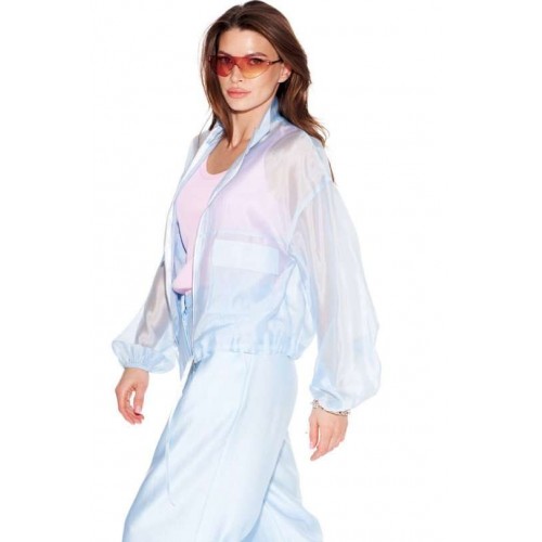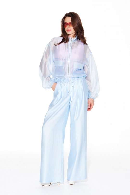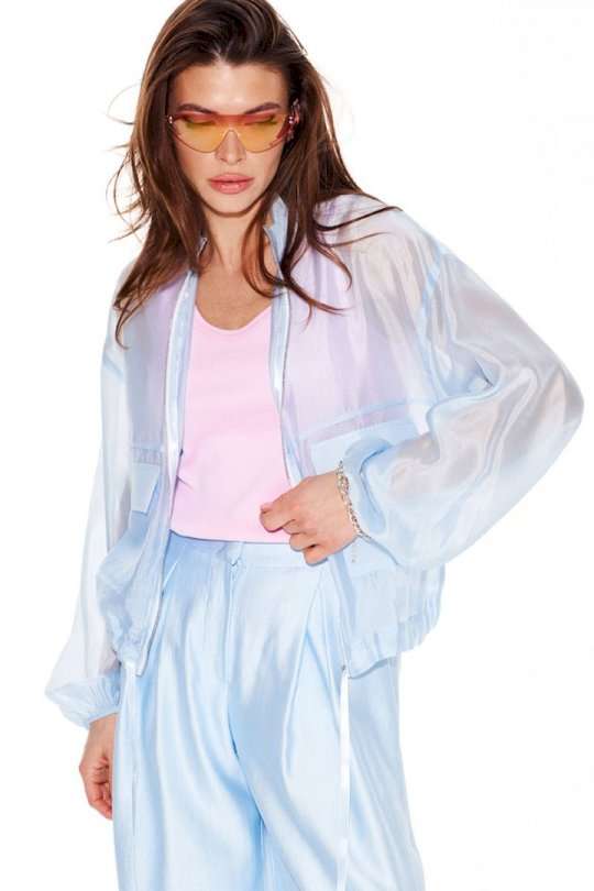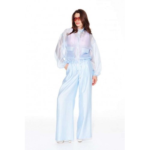 Блузон умеренного объема, прямого силуэта, со спущенной линией плеча, с центральной застежкой на тесьму-молнию. На деталях переда - горизонтальный подрез и накладные карманы с клапанами. Воротник - стойка. Спинка цельная. Нижний срез оформлен кулиской. В кулису продета декоративная тесьма для регулировки объема и формирования сборки. Рукав втачной, длинный, со сборкой на резинку по нижнему срезу.
