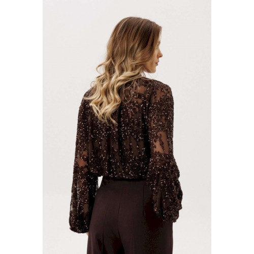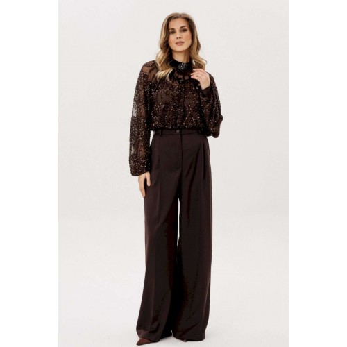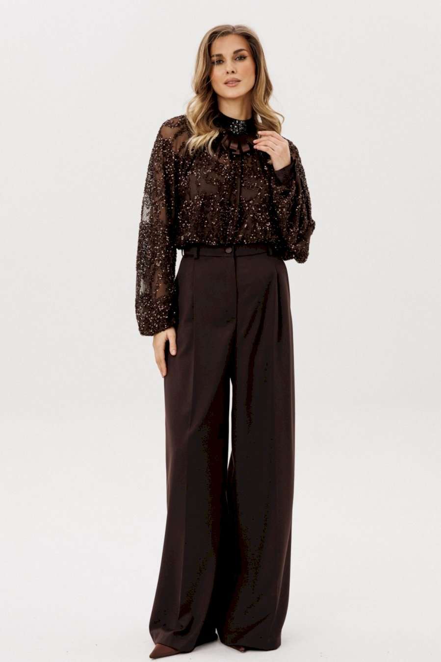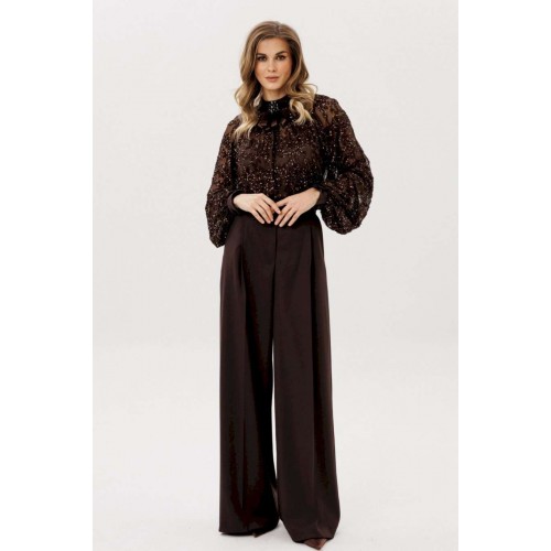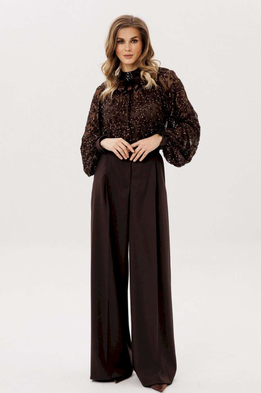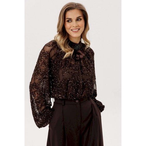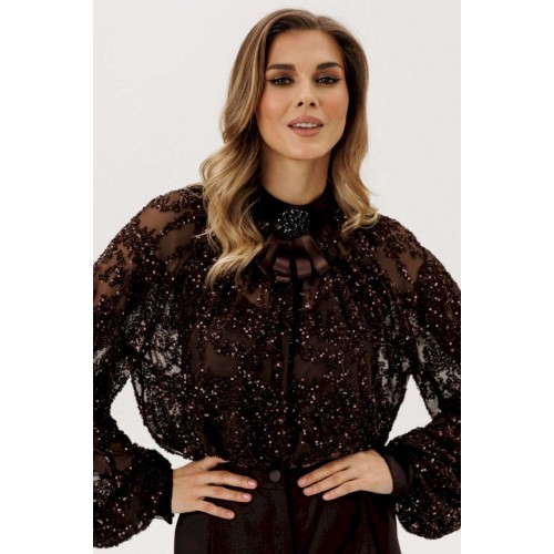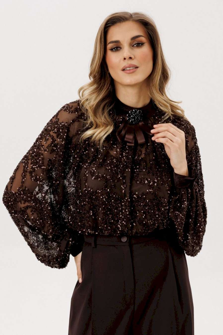 Блузка + топ. Блузка выполнена из сетки с вышивкой пайетками. Блузка прямого силуэта, длиной до линии бедер. Перед и спинка цельные, со сборкой по горловине. Воротник-стойка. Застежка сзади на две петли и пуговицы. Рукав покроя \"реглан\", одношовный, со сборкой по горловине и низу. Низ рукава на притачной манжете из велюра, застегивающейся на пуговицу. В комплект входит топ из трикотажной подкладки. Топ прямого силуэта, длиной до линии бедер, бретели регулируются по длине. В комплект входит декоративная брошь. Длина блузки: р.44-48 - 65 см, р.50-54 - 66,5 см. Длина рукава: р.44-48 - 76 см, 50-54 - 77 см. Гарантийный срок не установлен ГОСТ 25294 - 2003
