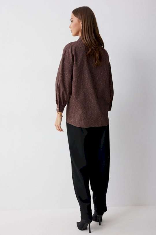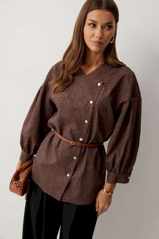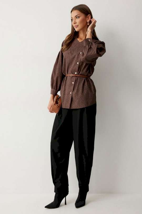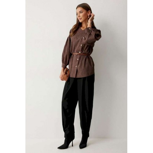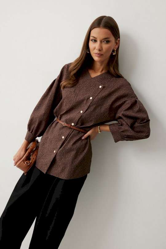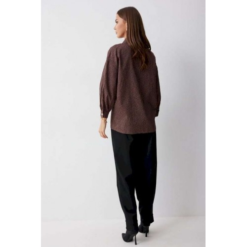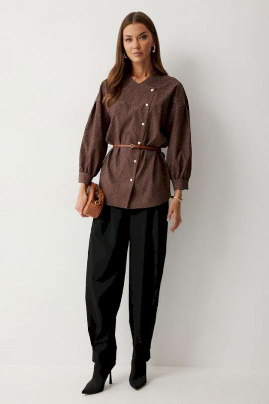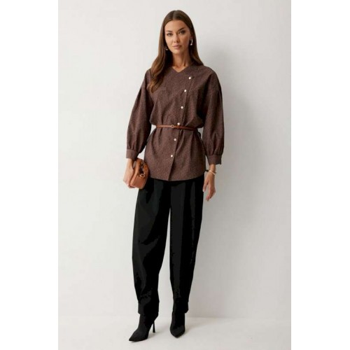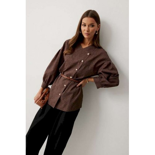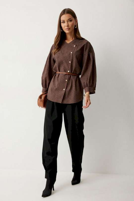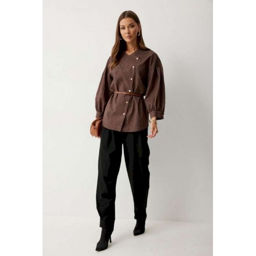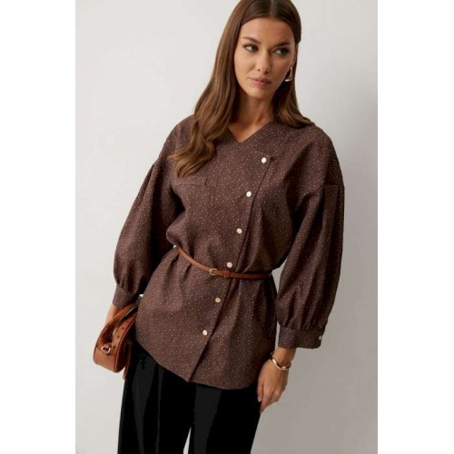Ассиметричная блузка прямого силуэта. Низ фигурный. Рукав, спущенный с встречной складкой по центру. По низу манжета с застежкой на кнопку. По переду декоративная настрочная листочка. Ассиметричная двубортная застежка на кнопки. Воротник-стойка. Обращаем ваше внимание, что фурнитура может незначительно отличаться от фото. Подходит на рост 164-170 см. Длина блузки (44-48р - 69см)(50-54р - 71см) Длина рукава от горловины (44-48р - 60,5см)(50-54р - 62см).