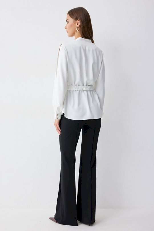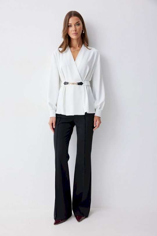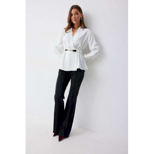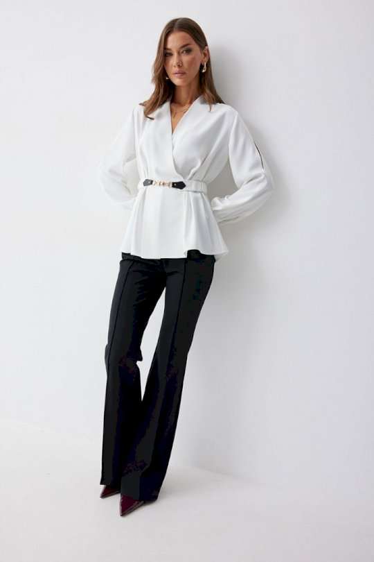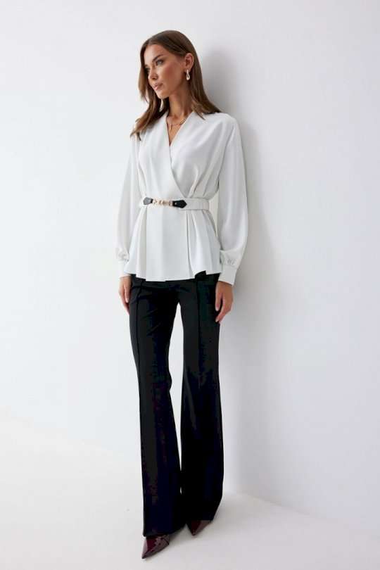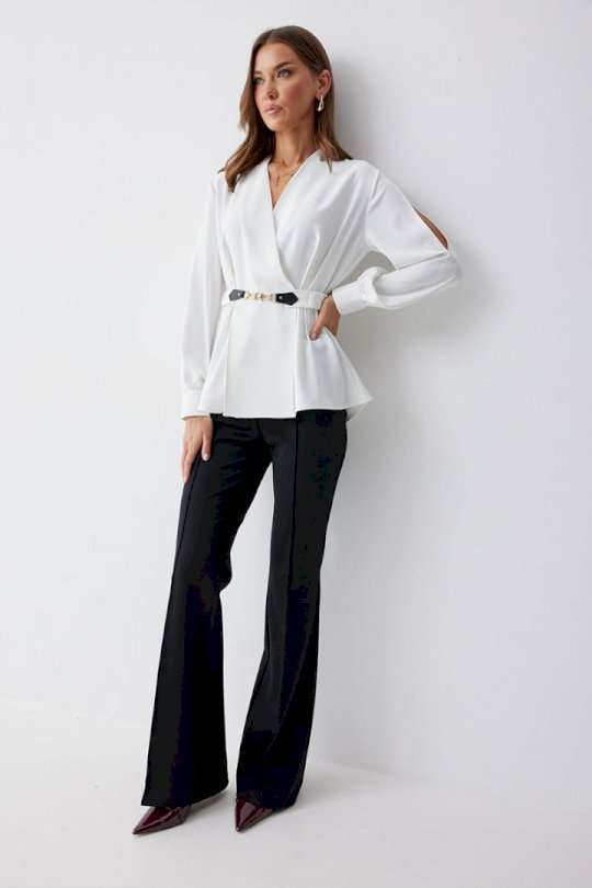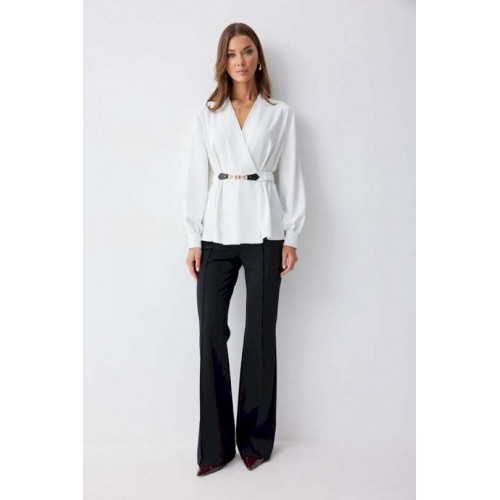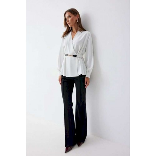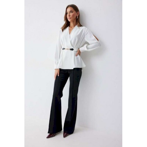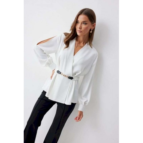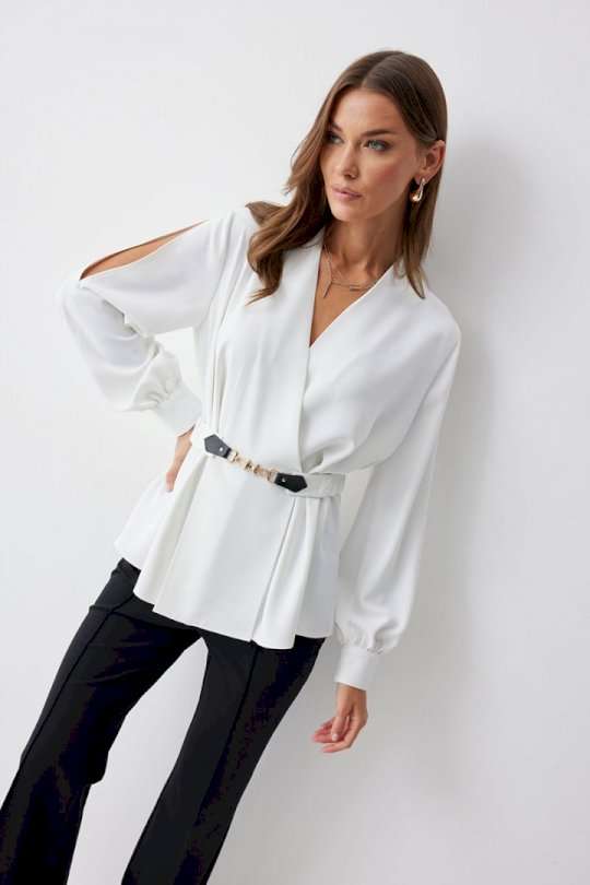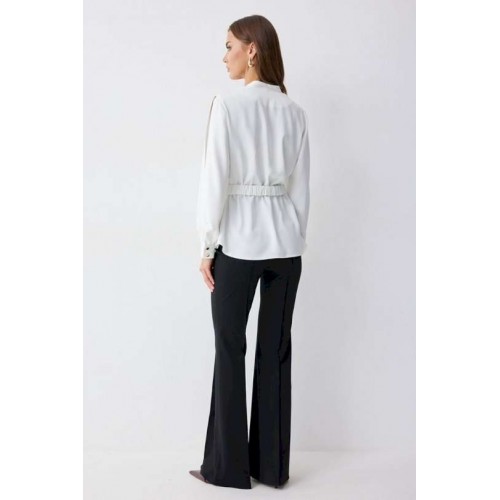 Блузка полуприлегающего силуэта расширенная книзу из струящейся ткани. Рукав втачной, с разрезом в области плеча, по низу манжета с застежкой на петли и пуговицы. Блузка отрезная по линии талии. По переду от подреза вверх и вниз декоративные складки. На спинке в подрез вставлена резинка. В комплект входит съемный ремень. Обращаем ваше внимание, что фурнитура может отличаться от фото. Подходит на рост 164-170 см. Длина блузки (44-48р – 66см)(50-54р - 68см). Длина рукава (44-48р – 59см)(50-54р - 59,5см).