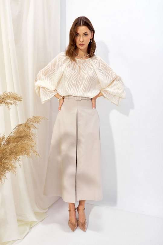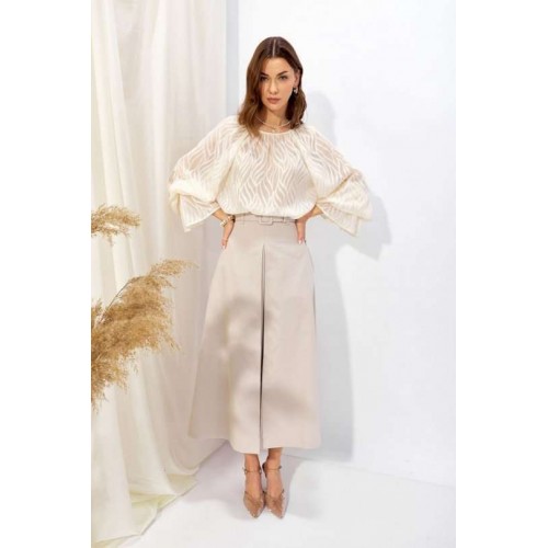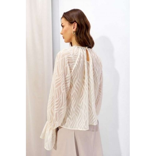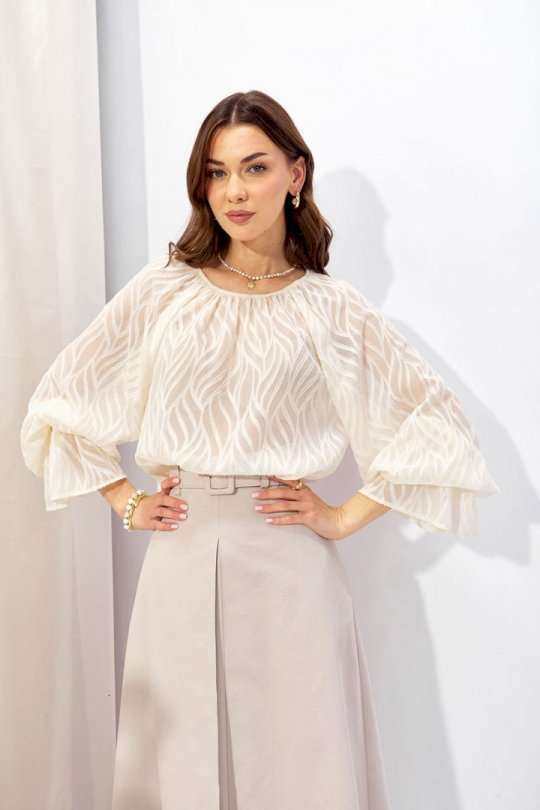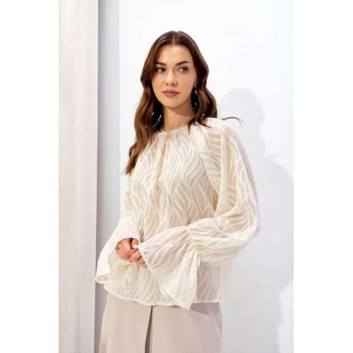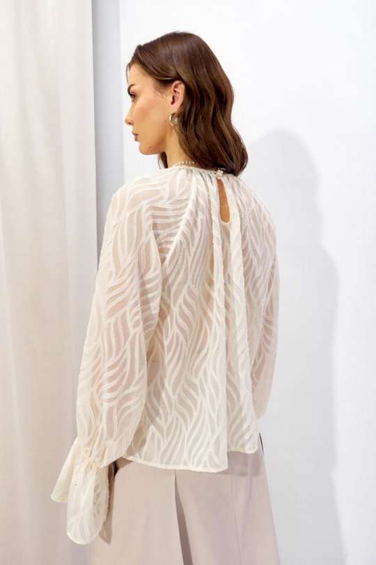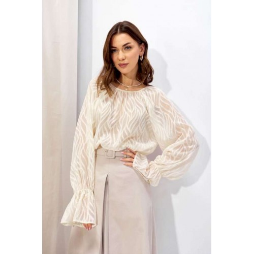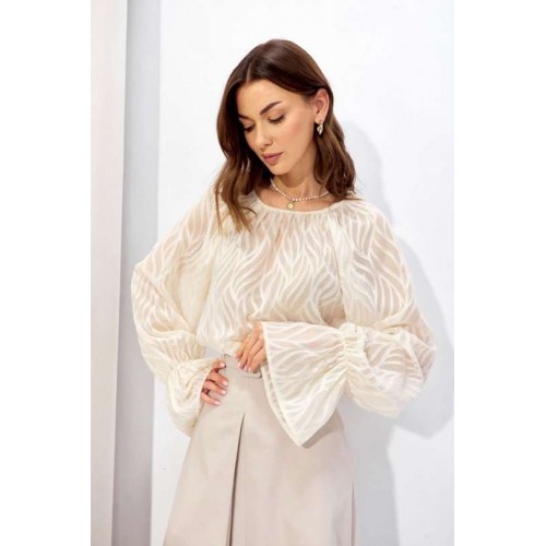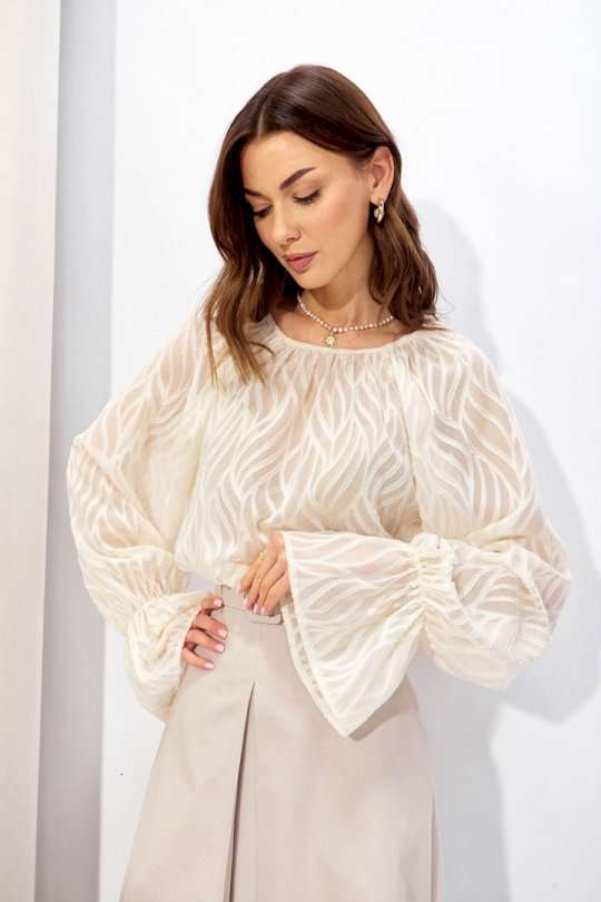 Блузка прямого силуэта из полупрозрачной блузочной ткани. Горловина округлая со сборкой, на спинке разрез “капля” с застежкой на петлю и пуговицу. Рукав покроя реглан удлиненный, по низу манжета. Длина блузки в 44-48р – 59см, в 50-54р - 65см. Длина рукава от горловины в 44-48р - 75,5см, в 50-54р - 77см.