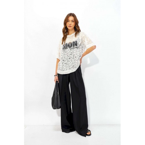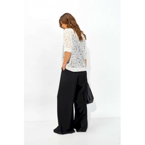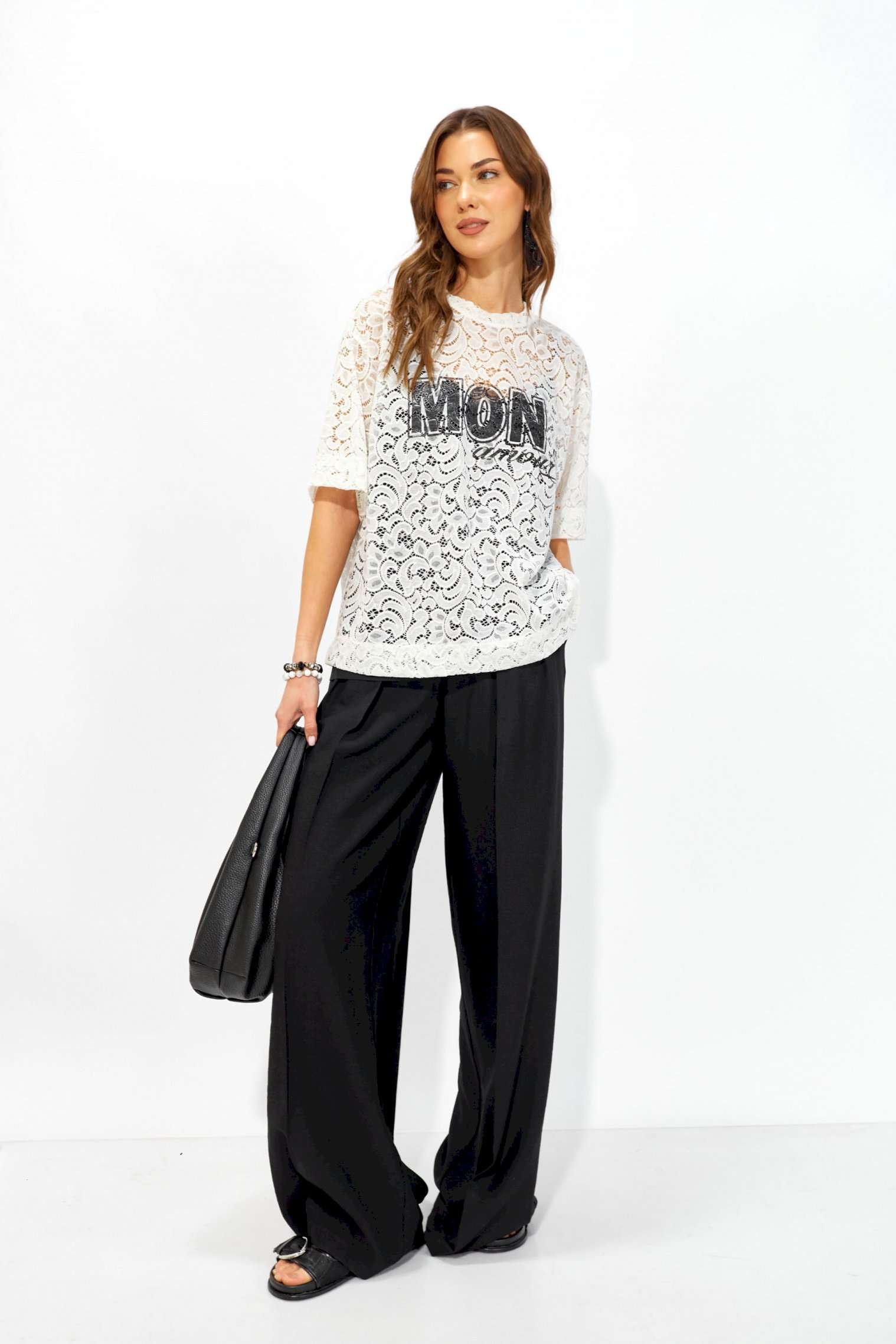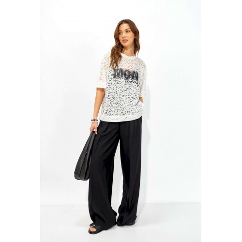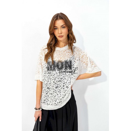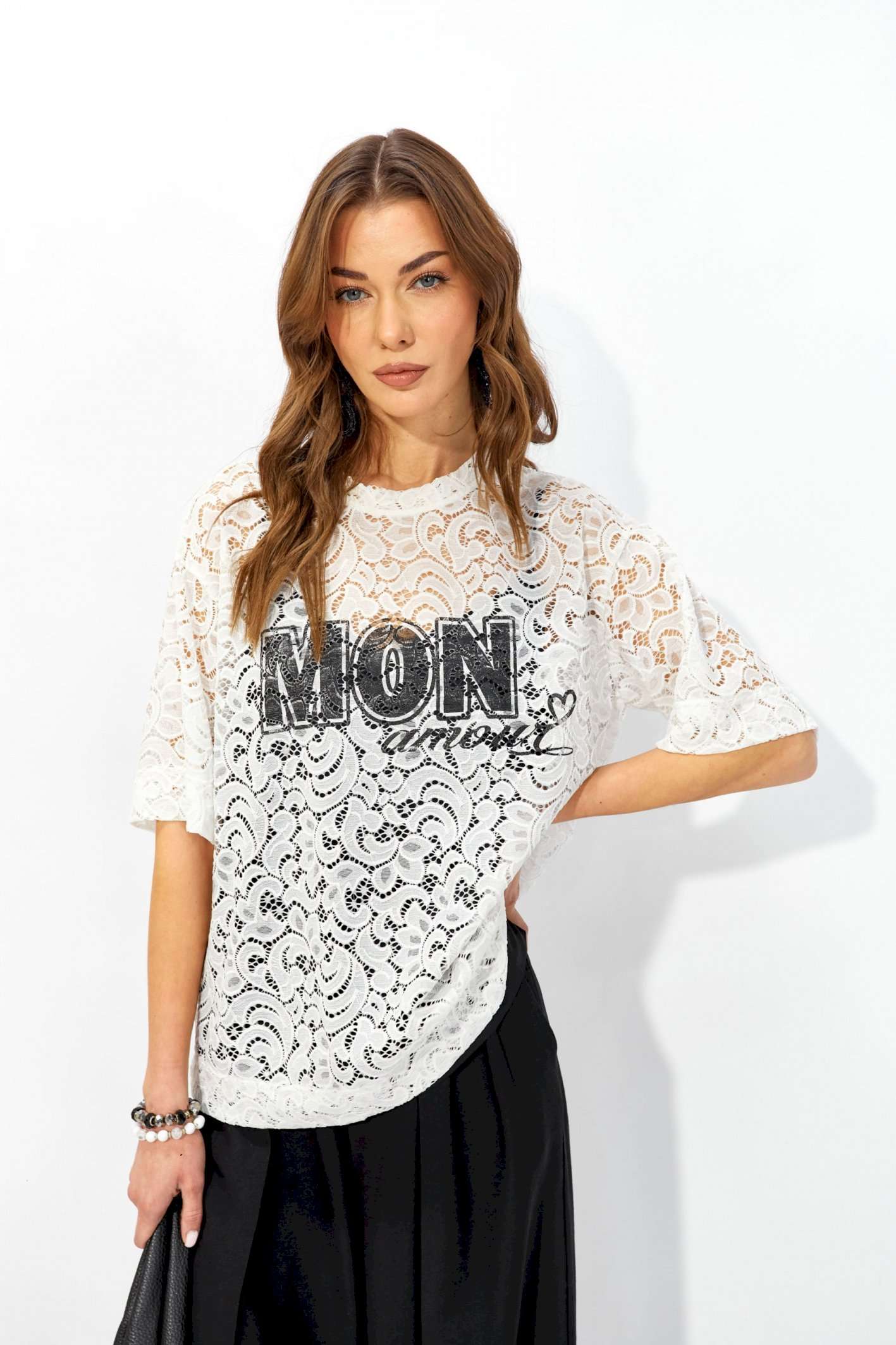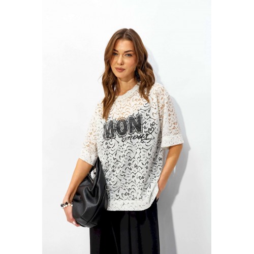 Оригинальный джемпер из эластичного кружева прямого силуэта, вырез горловины округлый, обработан притачной планкой. По переду выполнена дизайнерская печать контрастного цвета. Длина по спинке 44-48 – 61см, 50-54 –63 см, 56-62 -65 см. Длина рукава от горловины - 44-48 -42см, 50-54 – 44см, 56-62 – 46см.