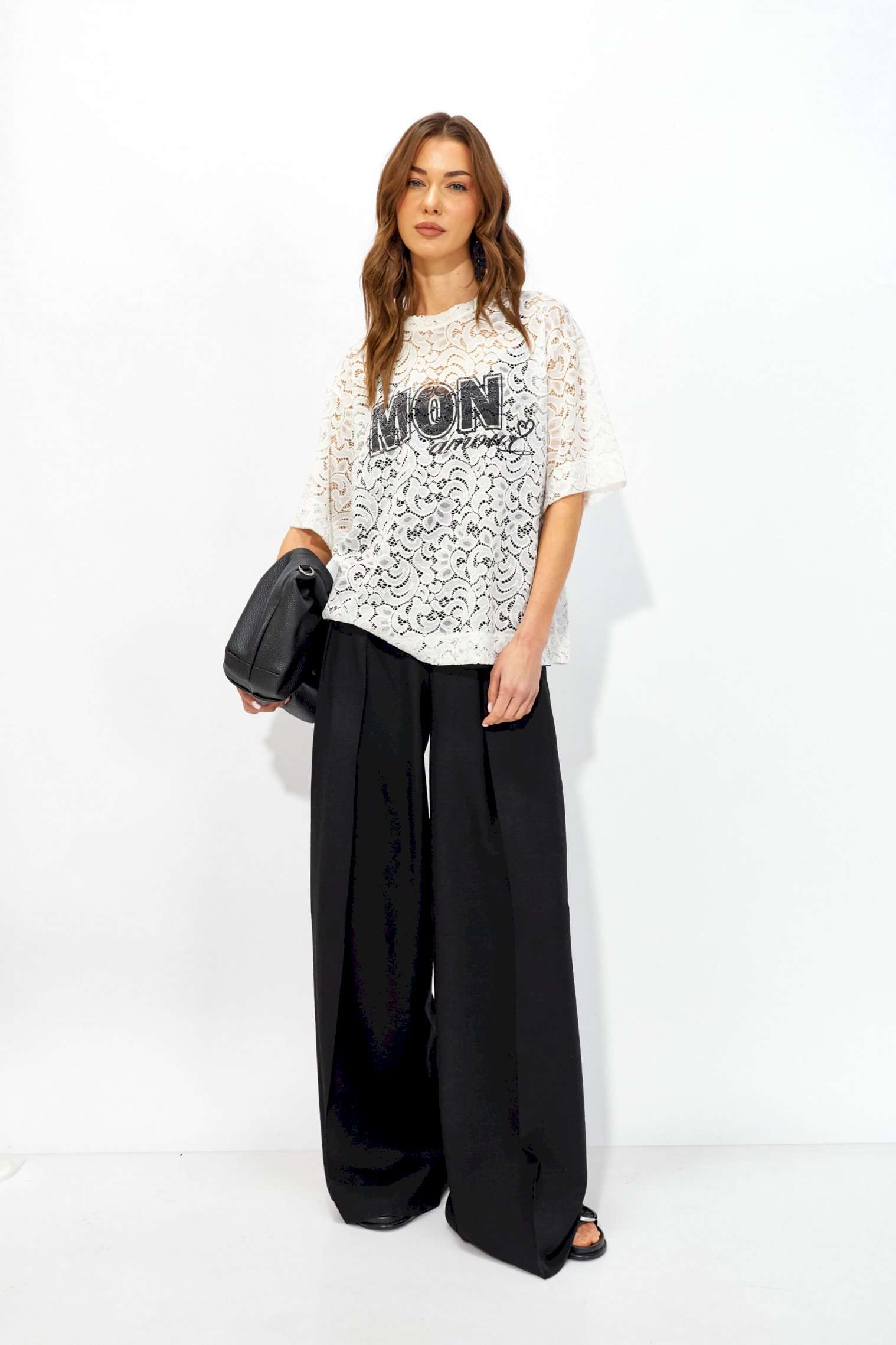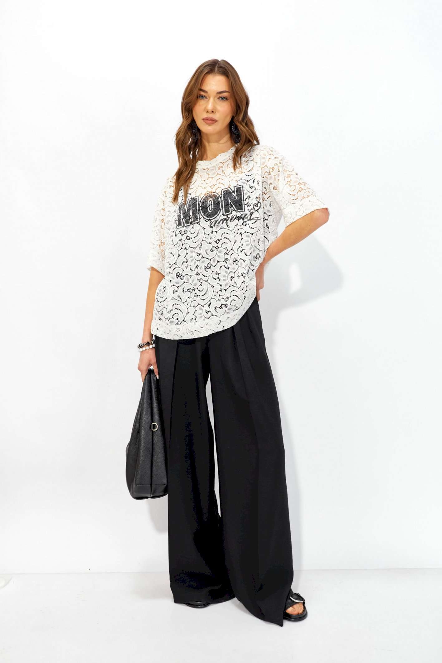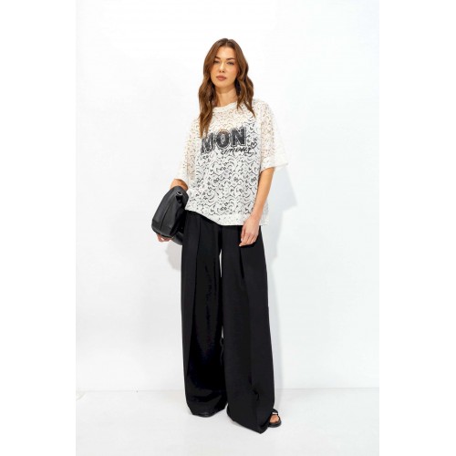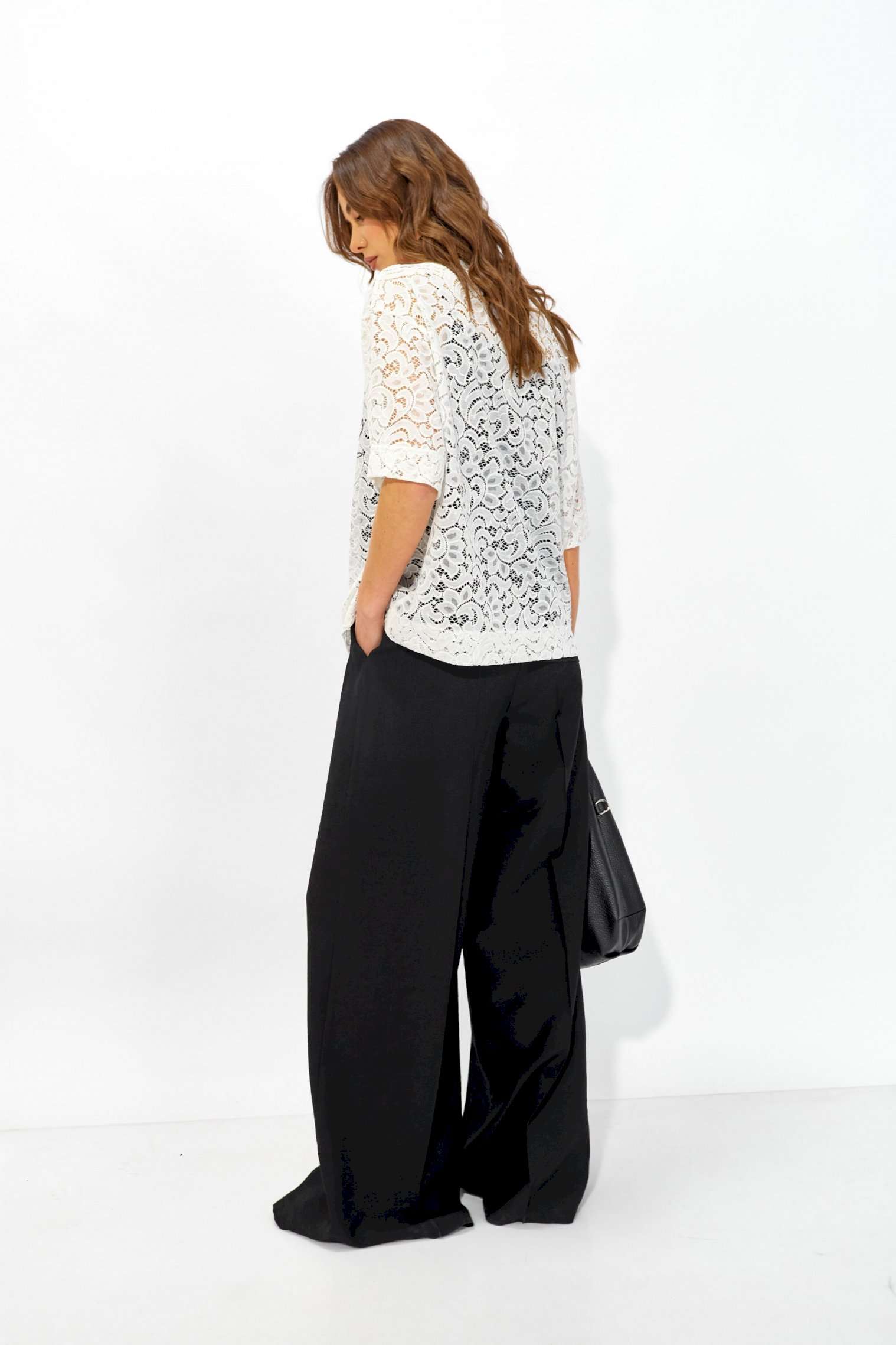 Оригинальный джемпер из эластичного кружева прямого силуэта, вырез горловины округлый, обработан притачной планкой. По переду выполнена дизайнерская печать контрастного цвета. Длина по спинке 44-48 – 61см, 50-54 –63 см, 56-62 -65 см. Длина рукава от горловины - 44-48 -42см, 50-54 – 44см, 56-62 – 46см.