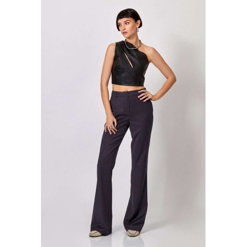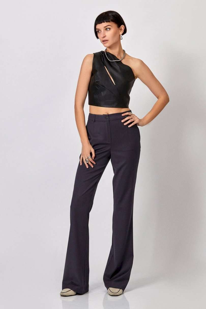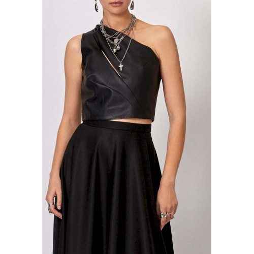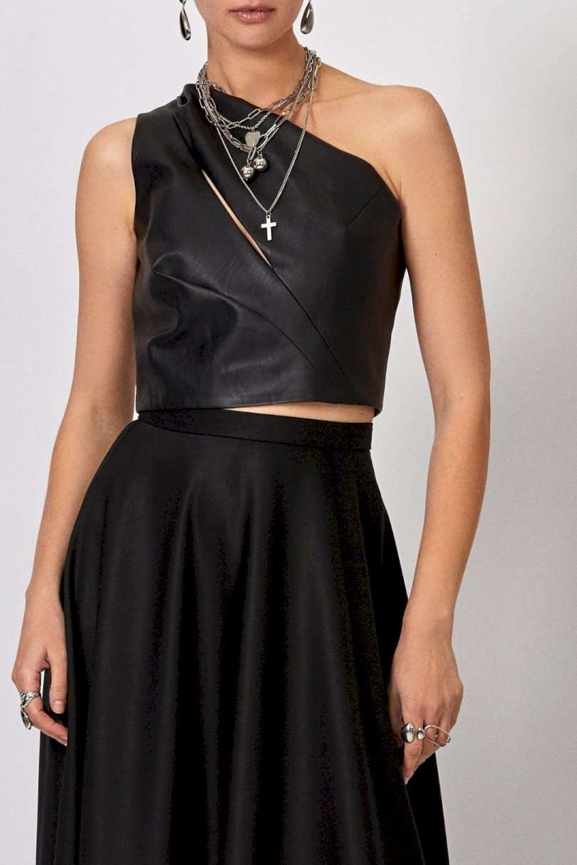 Топ из эко-кожи: - прилегающий силуэт - асимметричный крой на одно плечо - спереди — диагональный вырез с декоративными складками: две сверху, одна снизу - сзади — прямые рельефы и средний шов - застёжка: потайная молния по среднему шву спинки