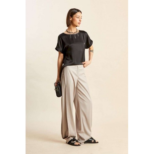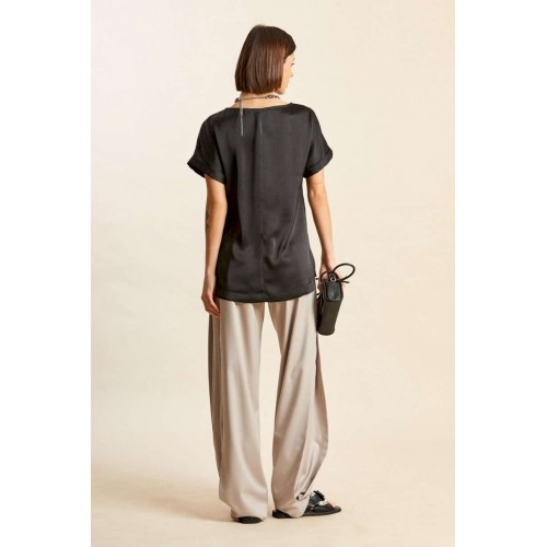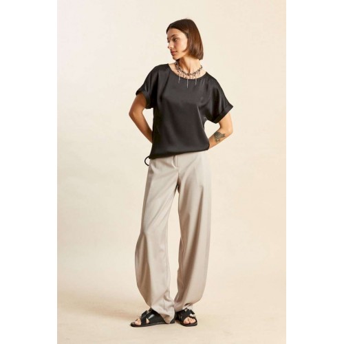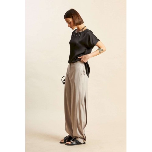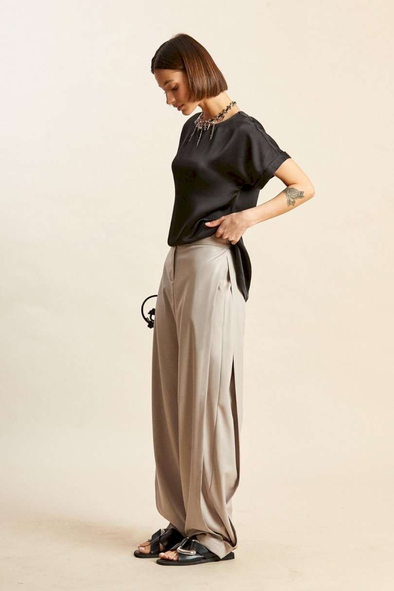 Блуза: - свободный силуэт; - спущенное плечо; - проймы с узкими манжетами с отворотами; - в боковых швах разрезы; - спинка со средним швом, немного длиннее переда; - вырез горловины широкий округлый.