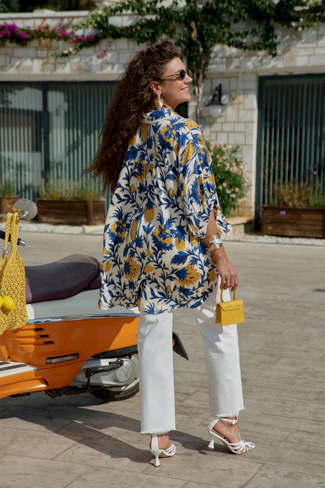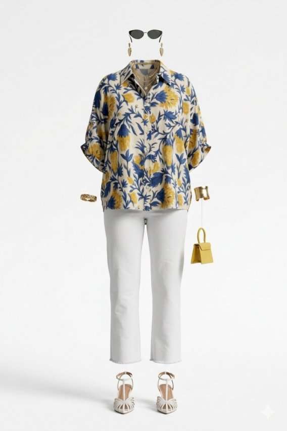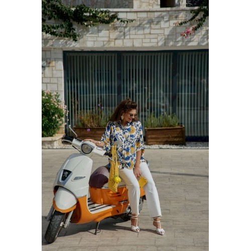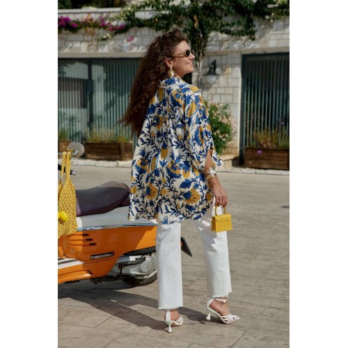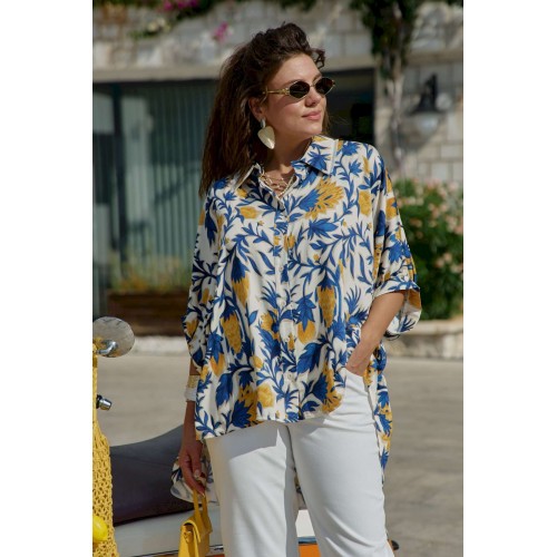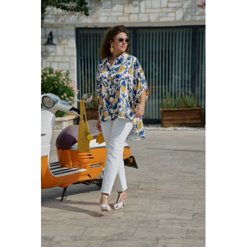 Эта блузка — словно кусочек итальянского лета, пойманный в летящей ткани. «Оверсайз» силуэт создает ощущение свободы и небрежной элегантности, а яркий итальянский принт напоминает о солнечных террасах, виноградниках Тосканы и лазурном побережье Амальфи. Это не просто одежда — это настроение, застывшее в ткани, готовое оживить любой образ щедростью южного солнца. Ткань на ощупь прохладная и шелковистая, она струится по телу, повторяя каждое движение, словно второе дыхание летнего бриза. Крой создает эффект намеренно свободного, но стильного образа. Блузка «оверсайз» силуэта с центральной застёжкой на петли-пуговицы по планке, воротником рубашечного типа со вставкой декоративной бахромы. Рукав в блузе цельнокроеный со сборкой на притачной манжет по низу. По спинке блузки отрезная кокетка со сборкой от подреза. Низ в блузке ассиметричный, фигурной формы. Эта рубашка создана для современной женщины, которая ценит комфорт, не жертвуя стилем, и помнит, что настоящая элегантность — в умении быть собой в любой ситуации. Длина блузки 84 см, длина рукава 44 см (р 50-54), 45 см (р 56-60).