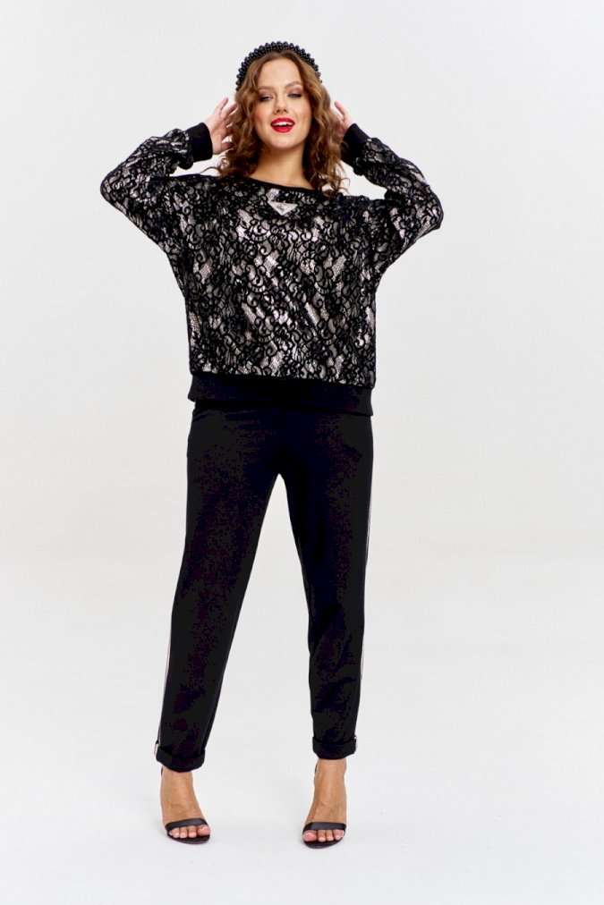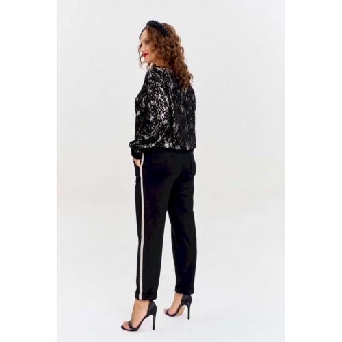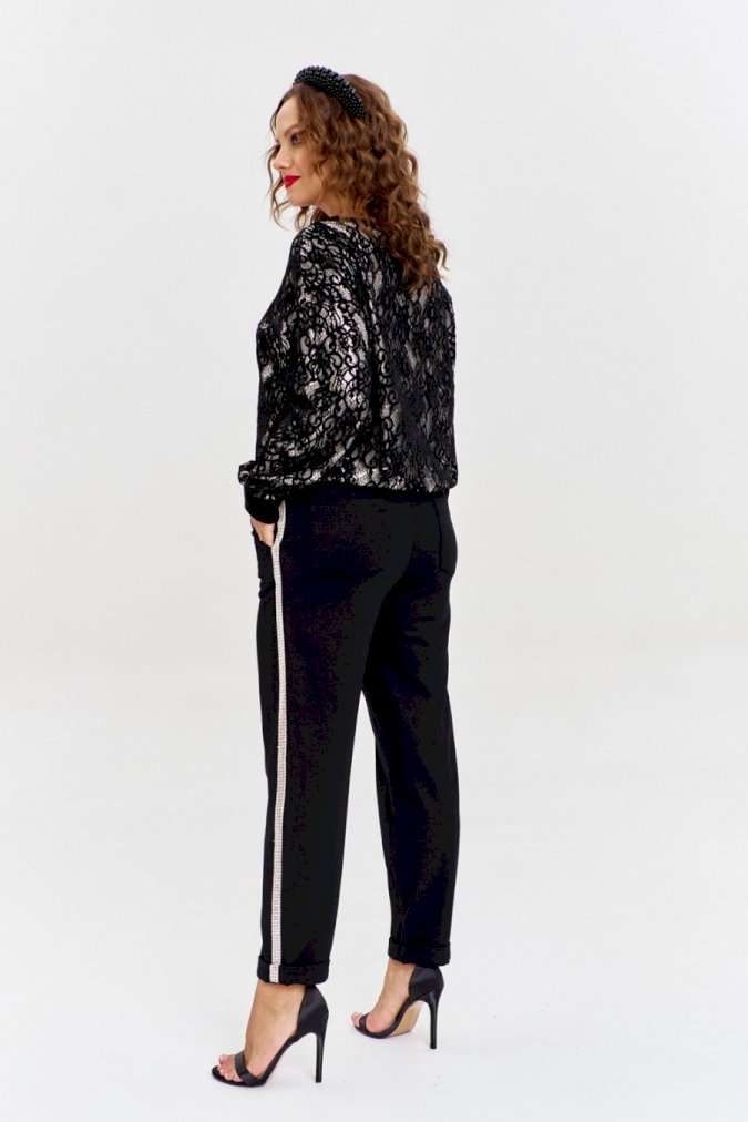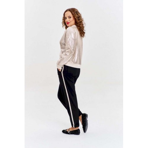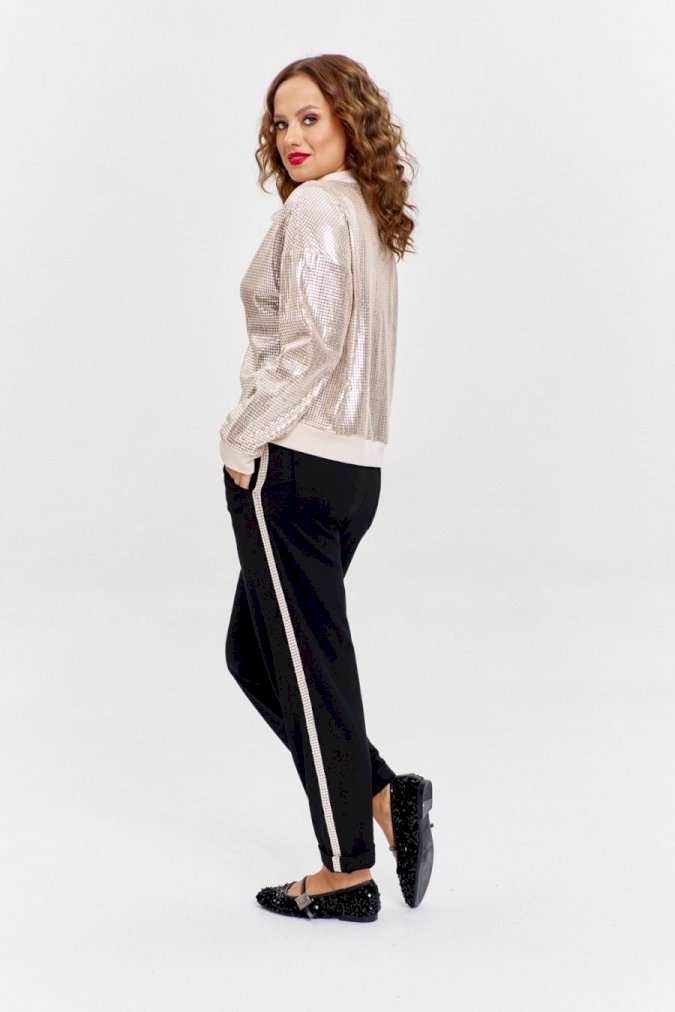 Брюки из плотного трикотажа с рубчиком, зауженные к низу, с боковыми карманами спереди и накладными сзади. Пояс - декоративная резинка . По бокам брюк - золотистый лампас из ленты с пайетками.