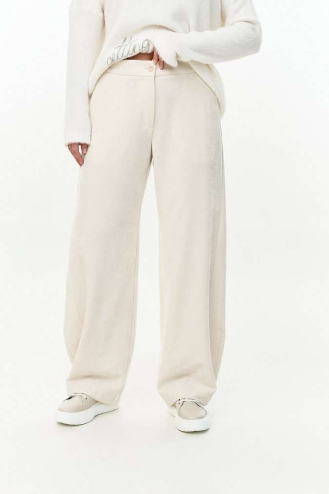 Брюки из эффектного бархата суперактуальной формы \"подковы\": прямые, свободные по ноге и зауженные к низу. Застежка на молнию, пояс с резинкой по спинке. Спереди боковые карманы в швах, сзади - в шве притачивания кокеток.