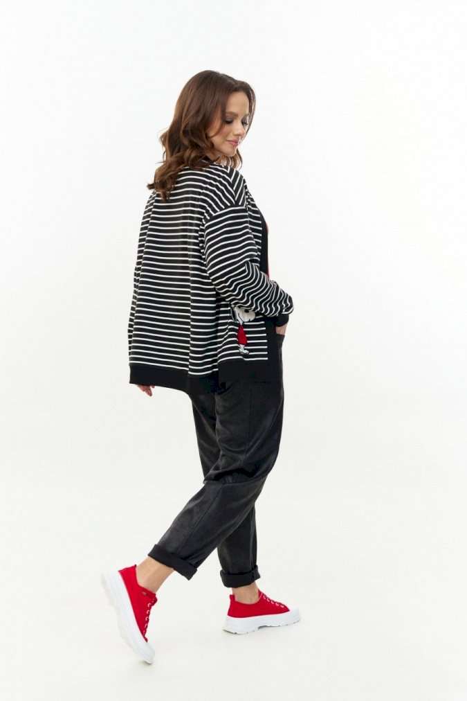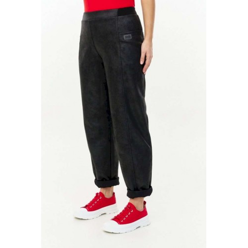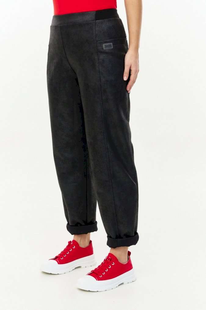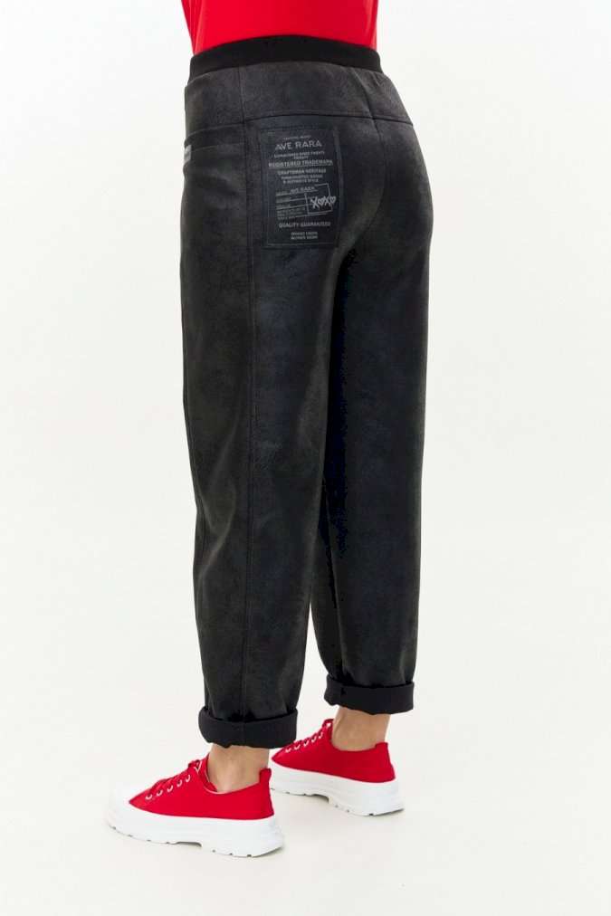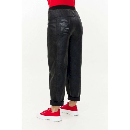 Брюки из плотного эластичного трикотажа с покрытием \"нубук\", прямого силуэта, зауженные к низу. Пояс с трикотажной вставкой с резинкой. Карманы брюк в боковых вставках. Изделие декорированонашивкой с авторским принтом.