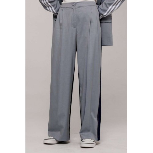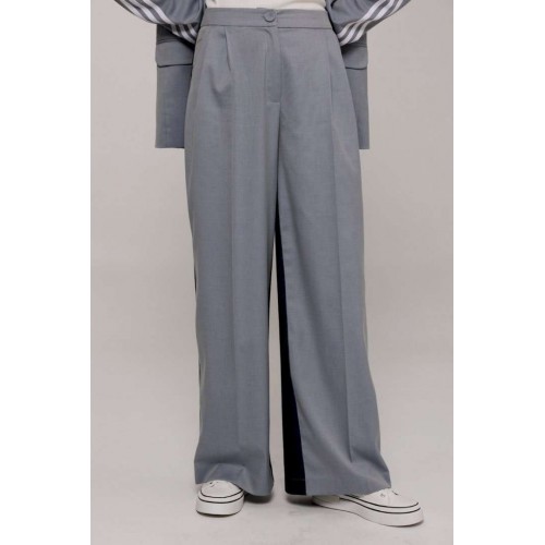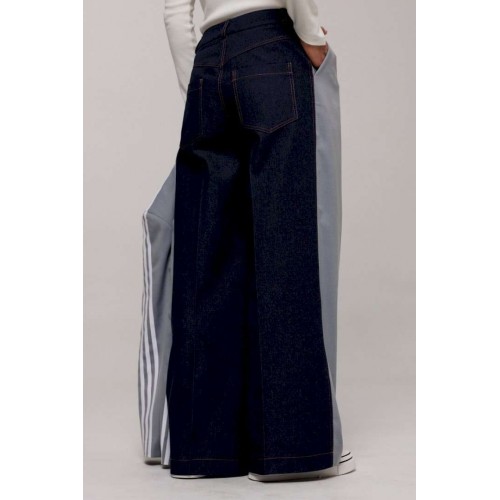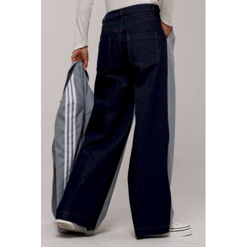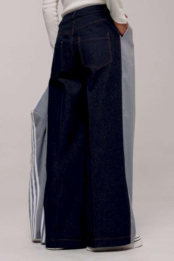 Брюки-палаццо, комбинированные из костюмной ткани по переду и джинса по спинке. Брюки на притачном поясе со шлевками и застежкой-гульфик. Пояс застегивается на петлю-пуговицу. По переду со складками и заутюженной стрелкой от одной из складок по всей длине брюк и карманами в боковых швах с наклонным входом. По спинке кокетка, накладные карманы и заутюженная стрелка.
