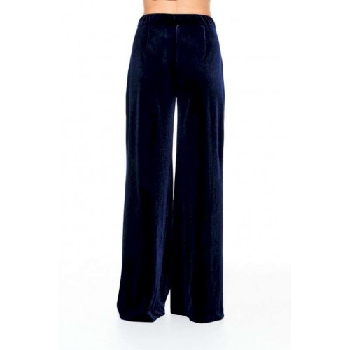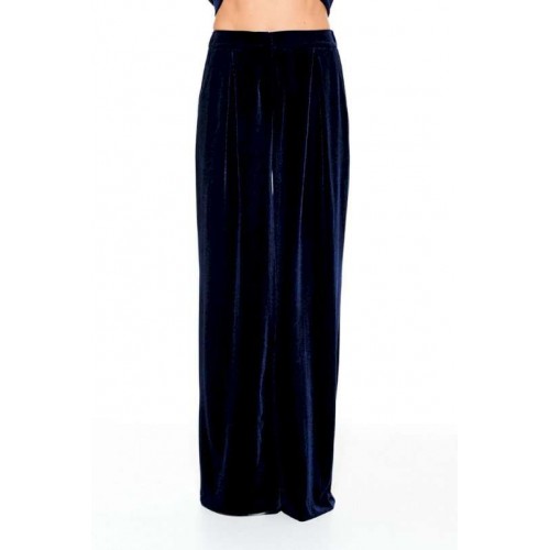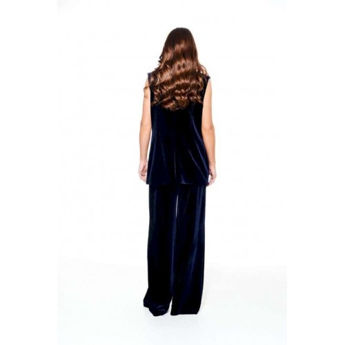 Брюки из бархата на трикотажной основе, свободного объема, расширенные к низу. На передних половинках выполнены боковые карманы с отрезным бочком и встречные складки. На задних половинках талиевые вытачки. Застежка – гульфик на молнии. Пояс притачной, с резинкой по спинке, застежкой на крючок и потайную пуговицу.