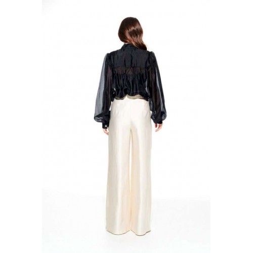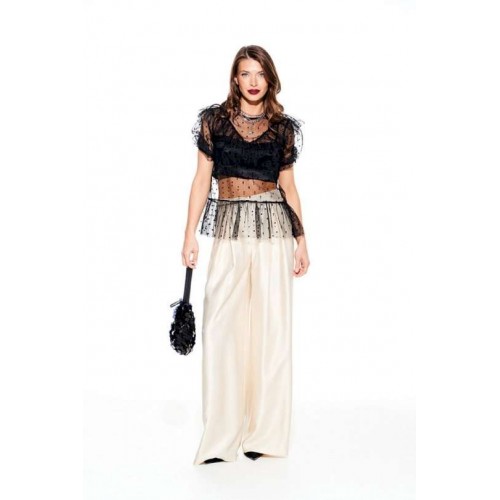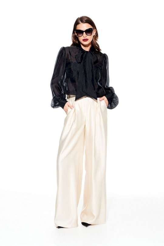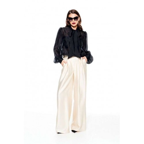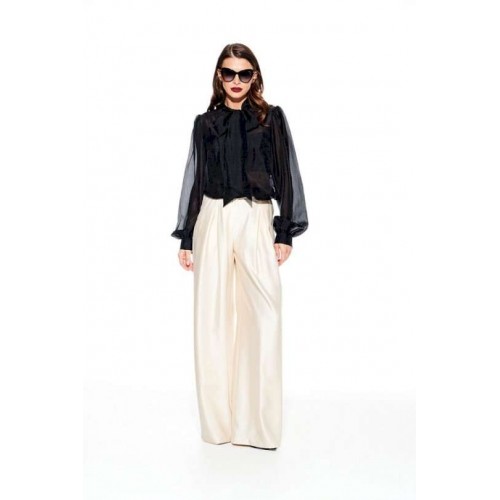 Брюки свободного объема, расширенные к низу. На передних половинках выполнены боковые карманы с отрезным бочком и встречные складки. На задних половинках талиевые вытачки. Застежка – гульфик на молнии. Пояс притачной, с резинкой по спинке, застежкой на крючок и потайную пуговицу.