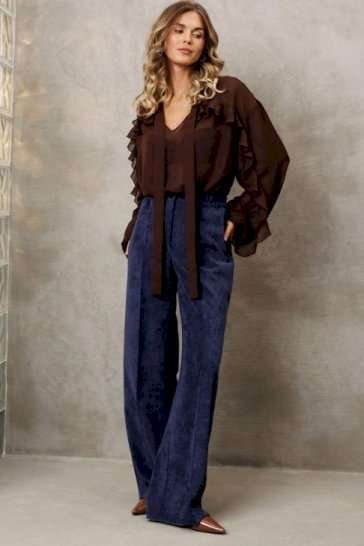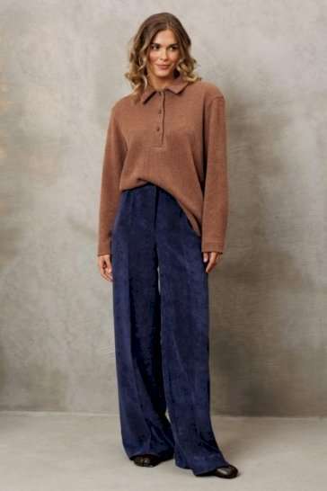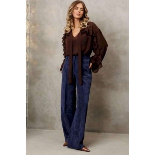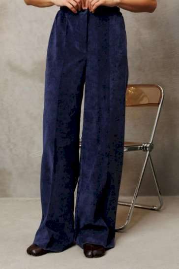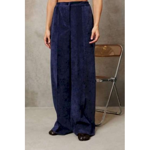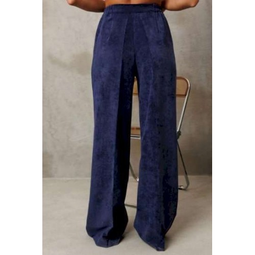 Брюки палаццо с притачным поясом из мягкой вельветовой ткани. Спереди застежка гульфик на молнии и петлей и пуговицей по поясу. По задней частям брюк вытачки. Пояс с резинкой в боковых частях. Брюки с заутюженными стрелками. Длина брюк с учетом пояса - 109 см.