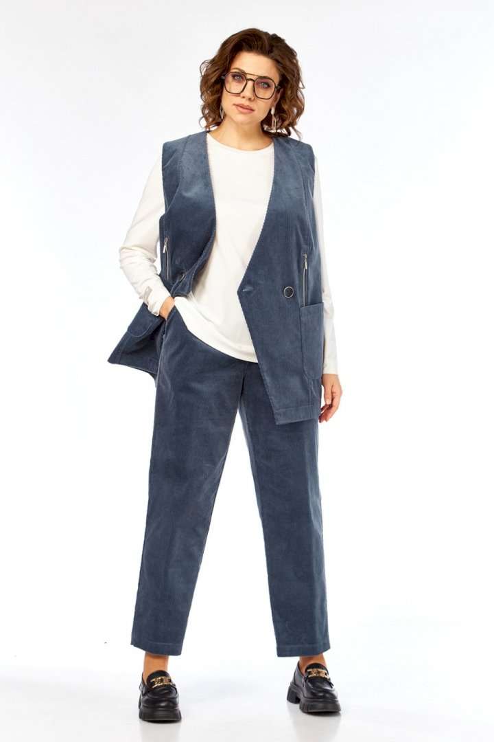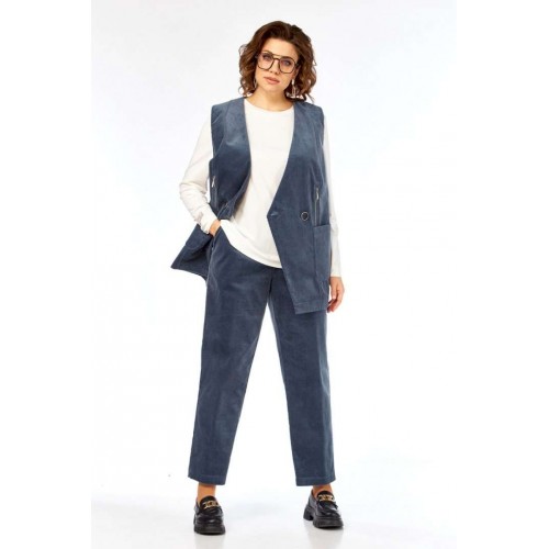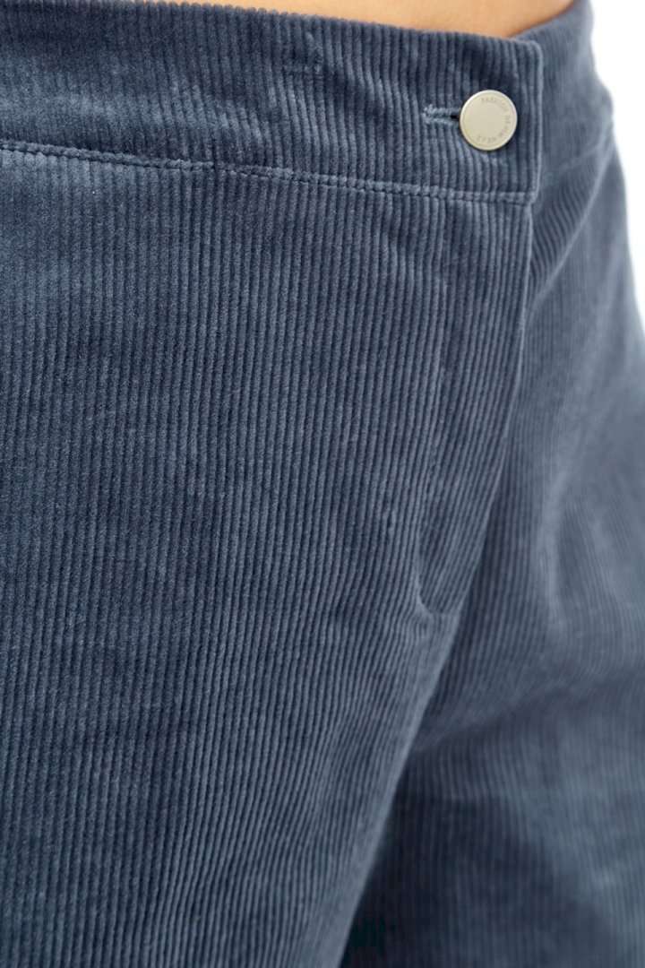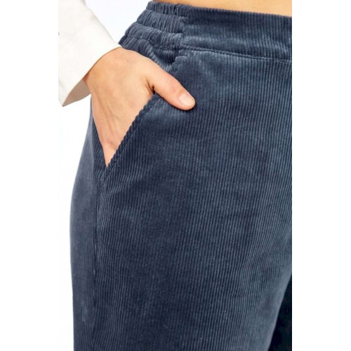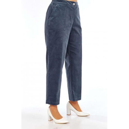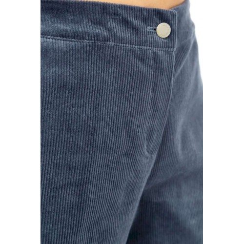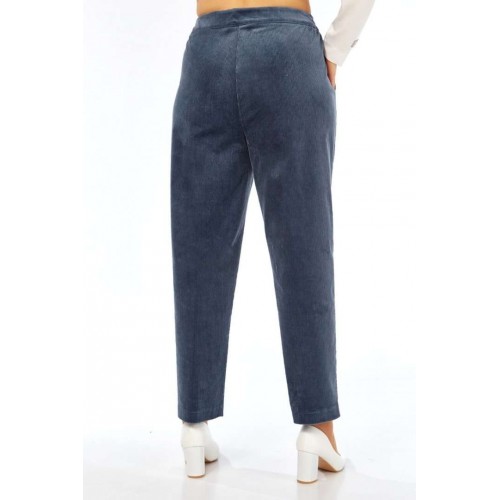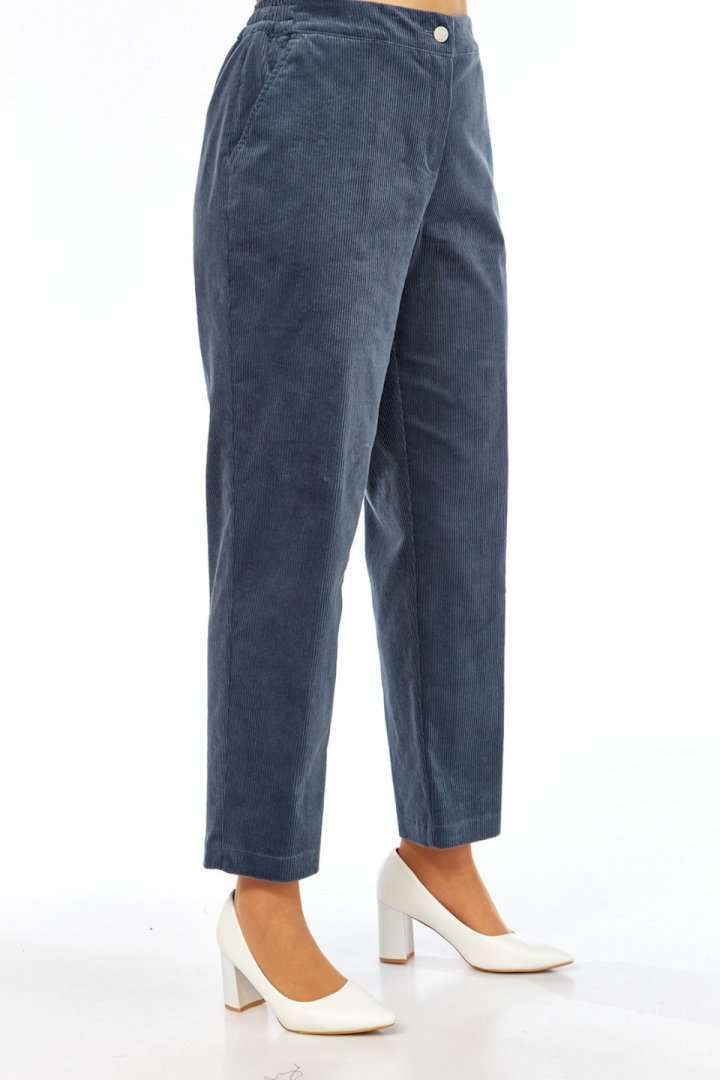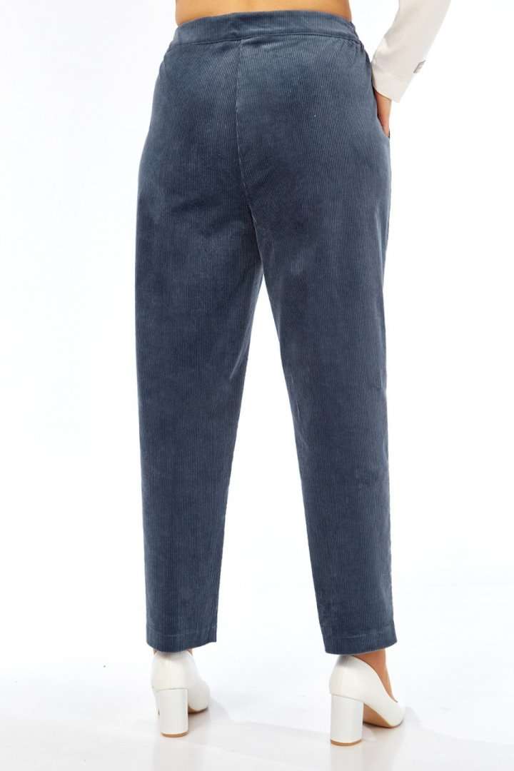 Брюки женские, свободного силуэта, выполнены из хлопкового вельвета. Пояс притачной, частично на резинке. Застежка на молнию, петлю и пуговицу. В передних деталях брюк обработаны боковые карманы с подрезным бочком.