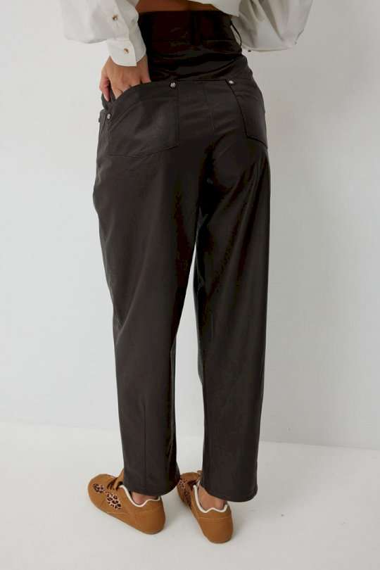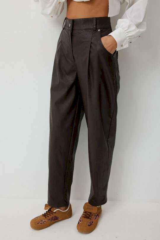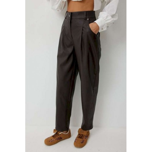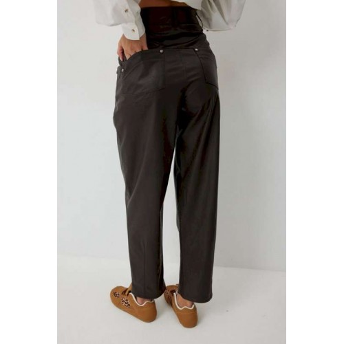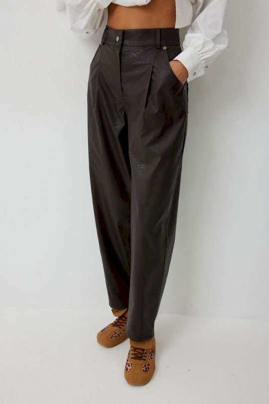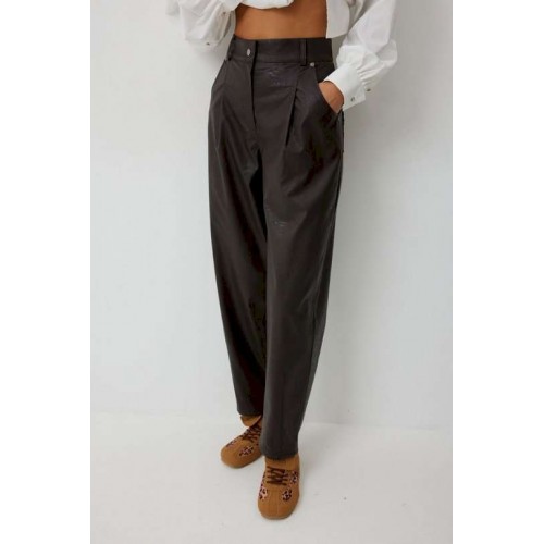 Брюки женские из искусственной кожи зауженные к низу. На передних частях брюк обработаны карманы с отрезным бочком и застрочены складки. По концам кармана установлены хольнитены. По спинке брюк накладные карманы с хольнитенами на концах и отрезной кокеткой. Верхний срез брюк обработан отрезным поясом со шлевками. Брюки застегиваются по переду на «молнию» в гульфике и кнопку по поясу. Длина брюк по боковому шву 97,5см.