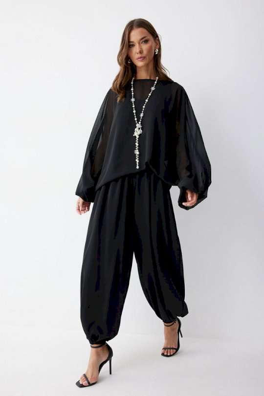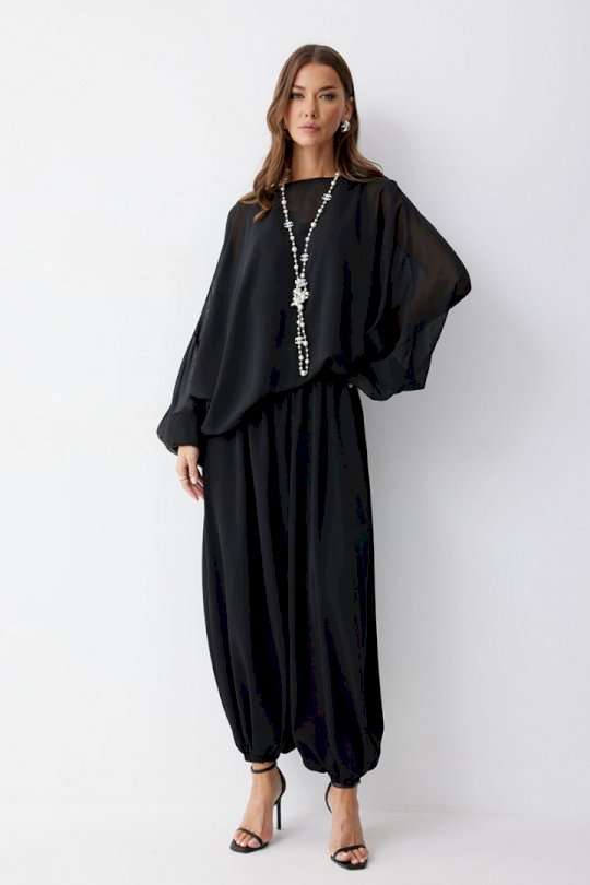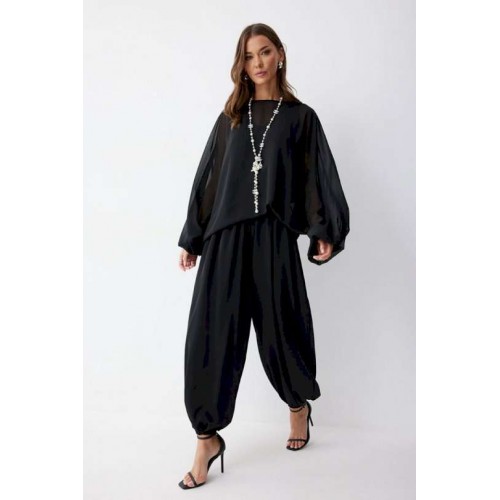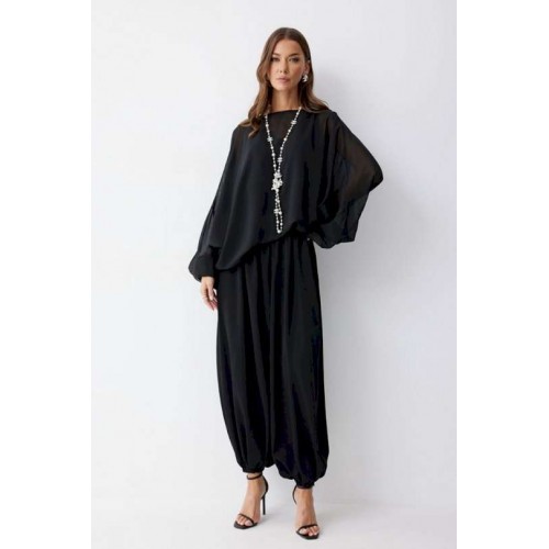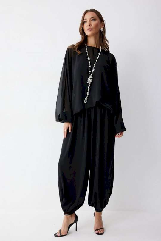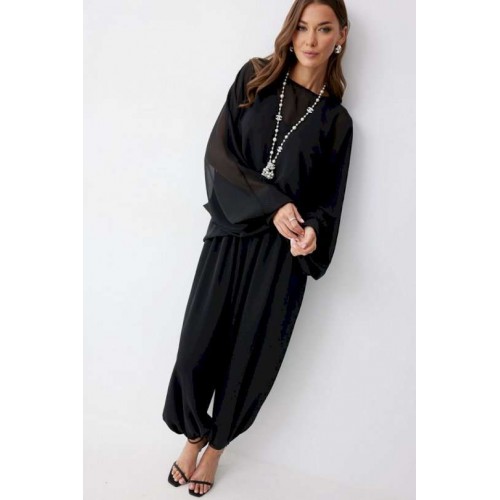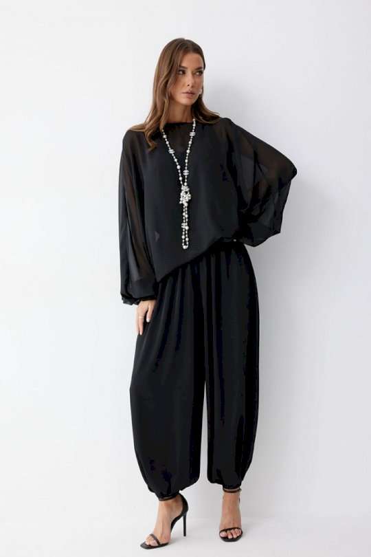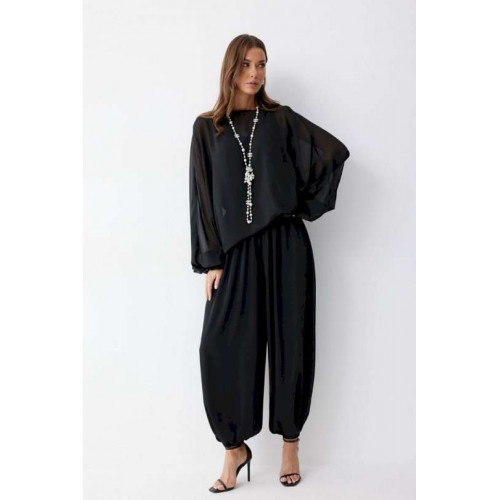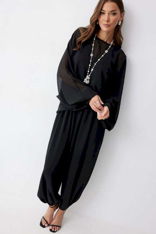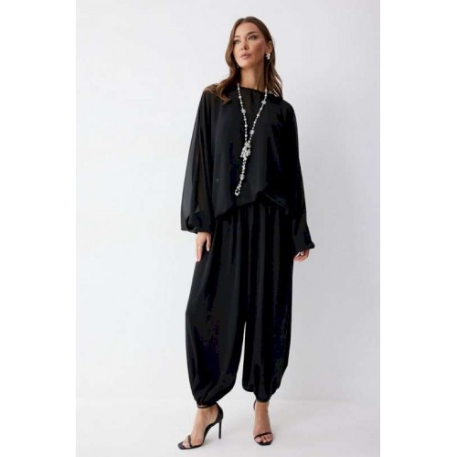 Брюки шаровары свободного, расширенного силуэта, по низу со сборкой. Из струящейся ткани. Пояс с резинкой. По низу манжеты с резинкой. Подходит на рост 164-170 см. Длина брюк (44-48р 102 см, пояс 2 см), (50-54р 103см, пояс 2 см).