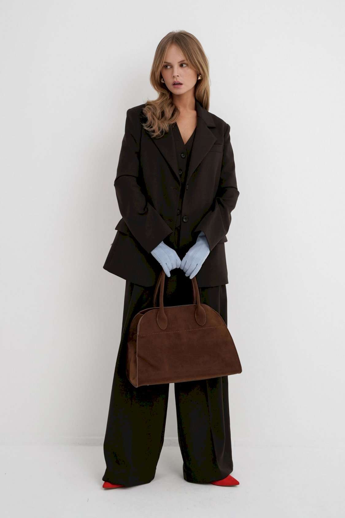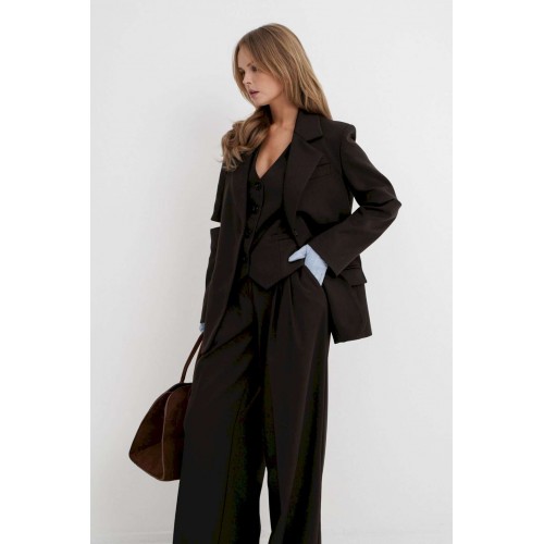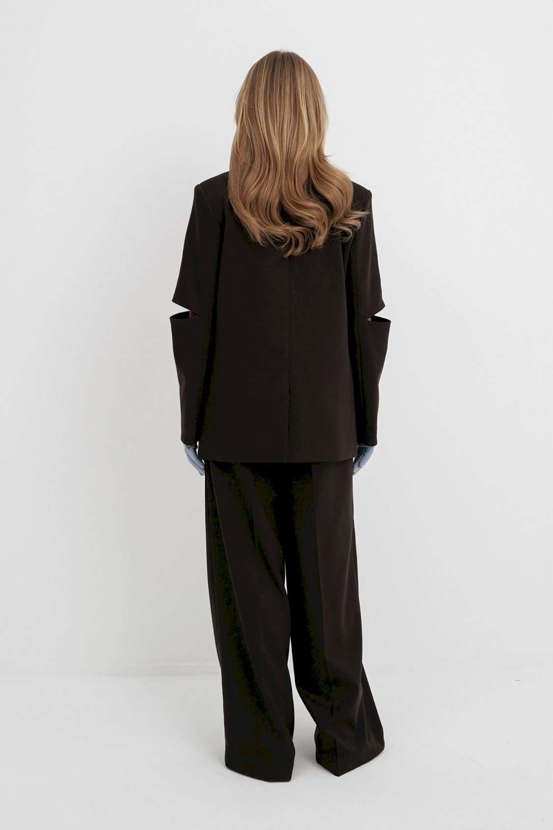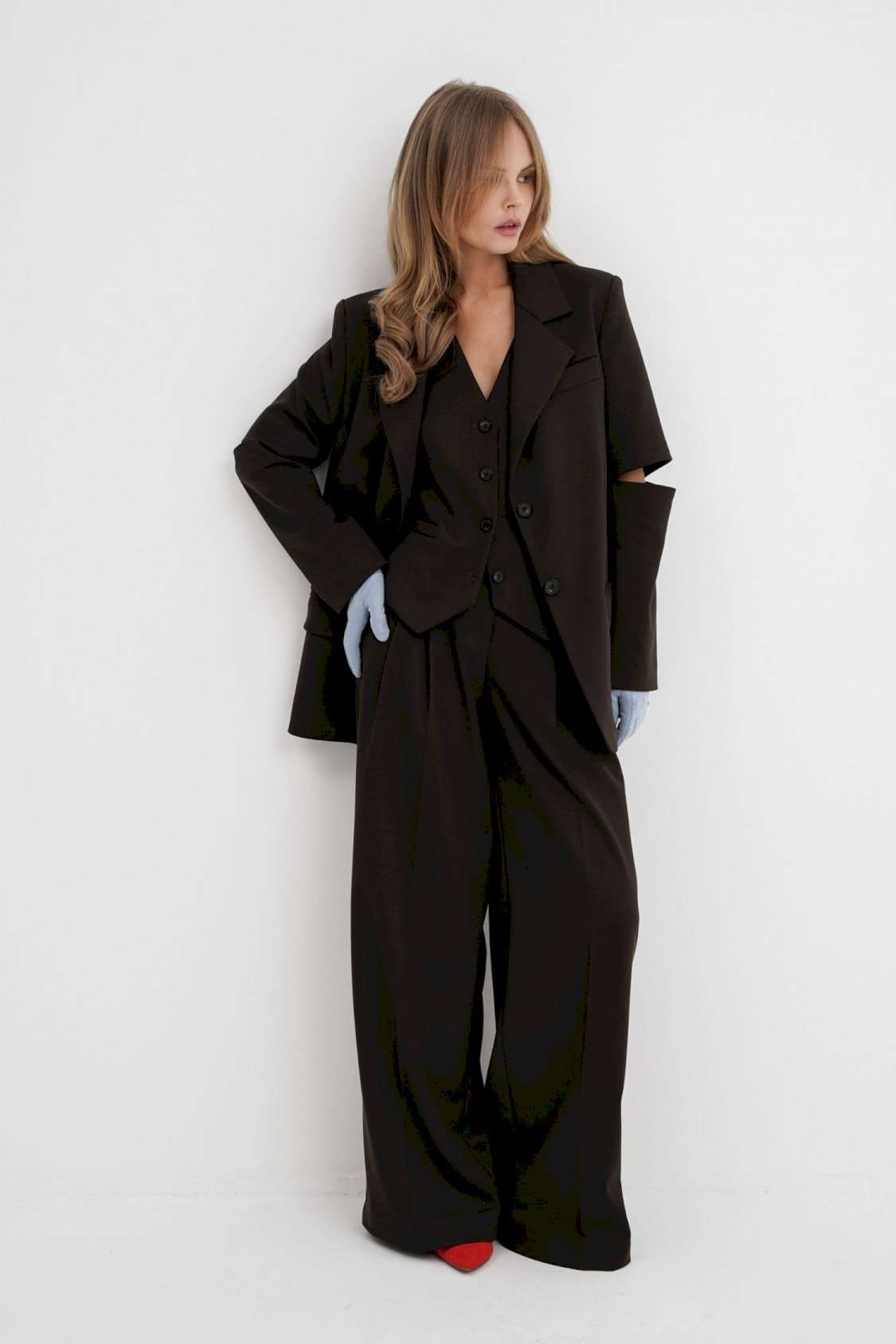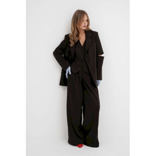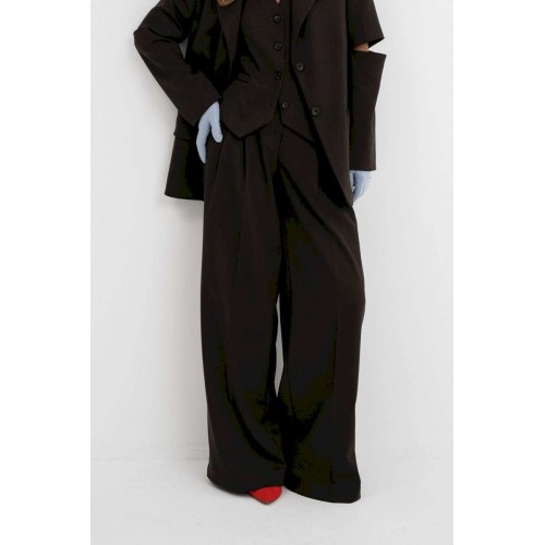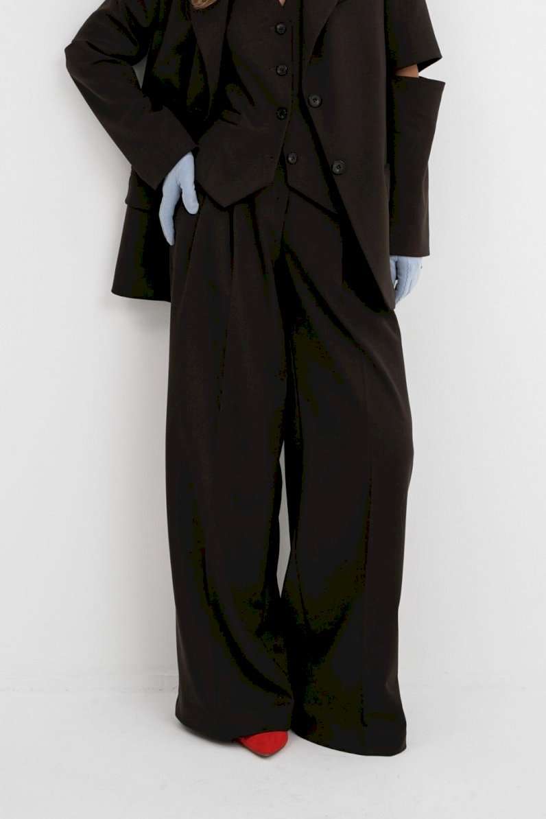 Широкие брюки-палаццо с небольшими складками у пояса и заутюженными стрелками. Детали: притачной пояс со шлевками, складки, застежка на молнию и пуговицу, боковые карманы. Задние части брюк с вытачками и имитацией карманов. Длина брюк по боковому шву с поясом около 109,5 см, длина по внутреннему шву около 83 см