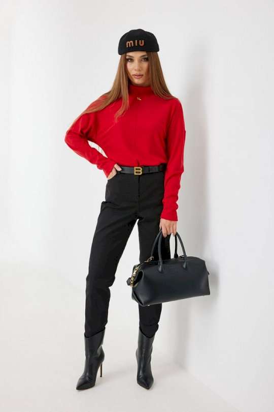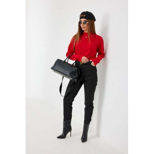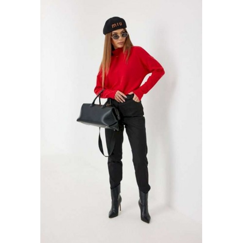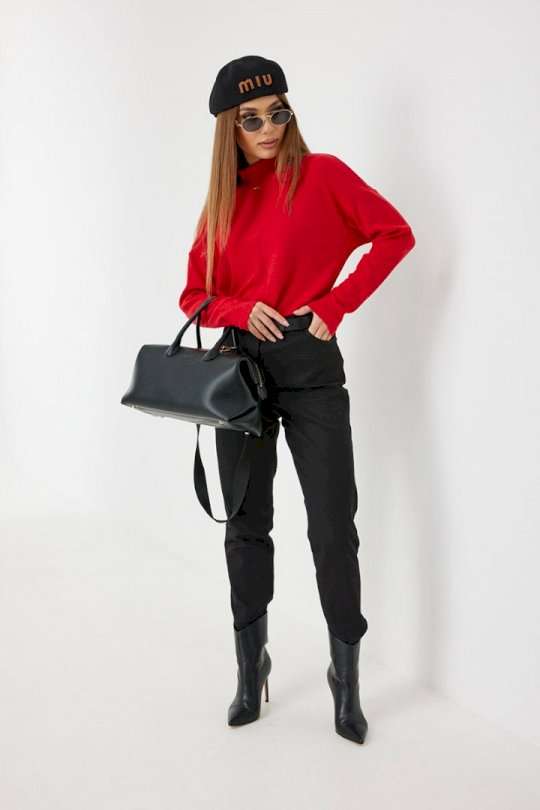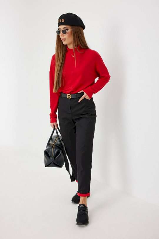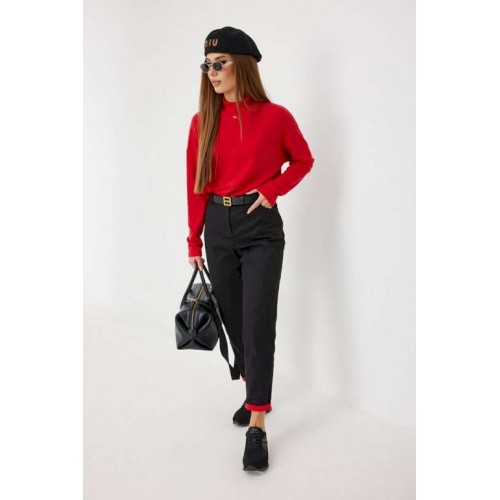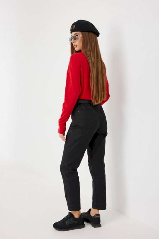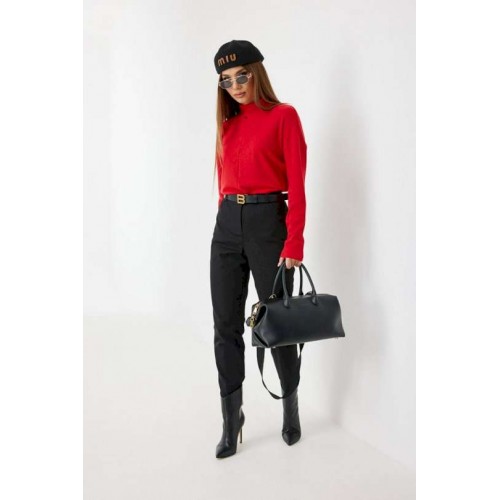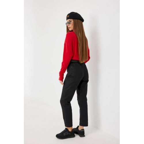 Брюки из джинса, зауженные к низу, укороченные. Средняя посадка, пояс притачной, застежка спереди на молнию и джинсовую пуговицу. По переду боковые карманы, сзади под кокеткой накладные карманы. Внутренний пояс и отвороты по низу брюк красного цвета. 44 р-р: ОТ - 76 см., ОБ - 96 см. 46 р-р: ОТ - 80 см., ОБ - 100 см. 48 р-р: ОТ - 84 см., ОБ - 104 см. 50 р-р: ОТ - 88 см., ОБ - 108 см. 52 р-р: ОТ - 92 см., ОБ - 112 см.