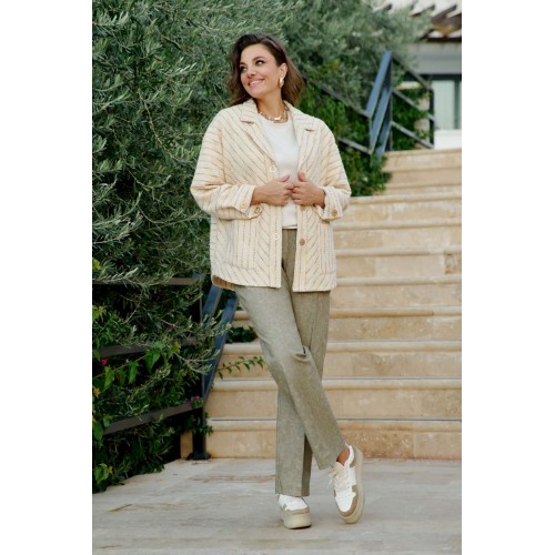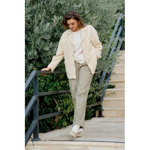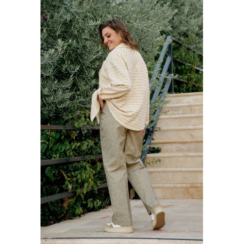 Брюки классического, прямого силуэта это эталон спокойной элегантности и практичности. Цвет «хаки» не кричащий, но выразительный, способен гармонировать с чем угодно, оставаясь идеальным фоном или достойным акцентом в комплекте. Свободный крой дарит комфорт и свободу. Брюки прямые зауженные к низу, с застроченными кантами по переду и застёжкой на тесьму-молнию в гульфике и пуговицу по центру пояса. Пояс притачной по бокам на тесьме-резинка для максимального комфорта по талии. По переду брюк в верхней части джинсовые карманы. На задней части брюк фигурная кокетка. В этой модели брюк чувствуешь себя комфортно, современно и уместно в любой ситуации, где ценится стиль. Это инвестиция в гардероб, которая будет слжить верой и правдой сезон за сезоном. Длина брюк по боковому шву 98 см.