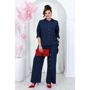 Сезон: Демисезон, Осень - зимаРост: 164Цвет: ВасилекСостав: Полиэстер 100%; брюки – полиэстер 97%, спандекс 3%Этот нарядный костюм для полных женщин станет вашим универсальным решением — он уместен и на праздничном вечере, и в офисной обстановке. Модель гармонично сочетает в себе торжественность и лаконичность, поэтому одинаково эффектно смотрится как с лодочками и клатчем, так и с более сдержанными аксессуарами. Блузка прямого силуэта выполнена в двух слоях: верхний — из роскошного гипюра с утончённым растительным узором и фестонами по краю, нижний — из струящегося шифона. Такое сочетание придаёт образу глубину и воздушность, мягко скрывая возможные особенности фигуры. Длинные рукава с манжетами и завязками добавляют изысканности, а округлый вырез горловины подчёркивает линию шеи. Благодаря потайной застёжке по спинке изделие сохраняет идеальную посадку и комфорт в движении. Брюки классического кроя выполнены из качественной костюмно-плательной ткани. Они идеально садятся на талию, вытягивают силуэт и визуально стройнят фигуру. Стрелки формируют чёткие линии, придавая образу деловую собранность, а эластичная вставка на поясе обеспечивает удобство даже при длительном ношении. Комплект брючный 2-х предметный, состоящий из блузки и брюк. Блузка прямого силуэта, комбинированная. Модель двухслойная: верхний слой выполнен из гипюра с фестонами, нижний – из шифона. На верхней детали переда обработаны нагрудные вытачки, на верхней детали спинки – талиевые. В среднем шве спинки предусмотрена застежка на потайную тесьму-«молнию» (50см). Вырез горловины переда и спинки округлый, углубленный спереди. Рукав длинный, втачной, со сборкой по низу и притачной манжетой с завязками. Длина блузки – 74 см, длина рукава (с манжетой) – 59 см. Брюки классические, длинные, с посадкой на талии, выполнены из костюмно- плательной ткани. Модель со стрелками. Передние и задние половинки брюк с талиевыми вытачками, направленными от пояса вниз. Спереди обработаны наклонные боковые карманы и центральная застёжка на тесьму-«молнию». Притачной пояс застегивается на 1 петлю и 1 пуговицу; для лучшего прилегания по линии талии в притачном поясе предусмотрена эластичная лента, вставленная по спинке. Длина брюк по боковому (с поясом) – 104 см (50 – 52 р-р), 105 см (54 – 58 р-р)...