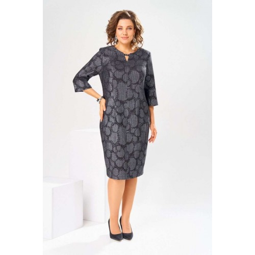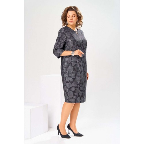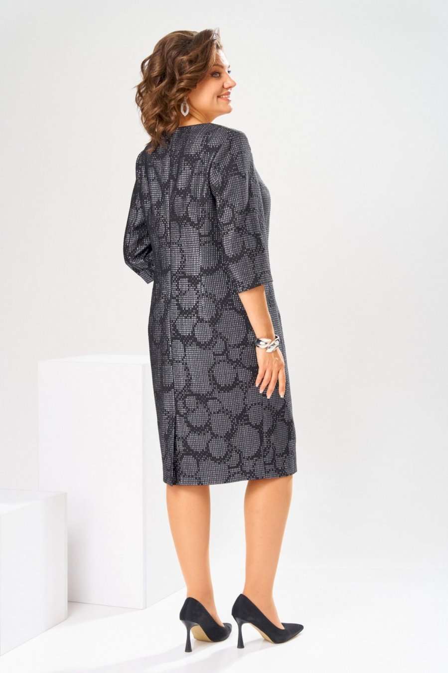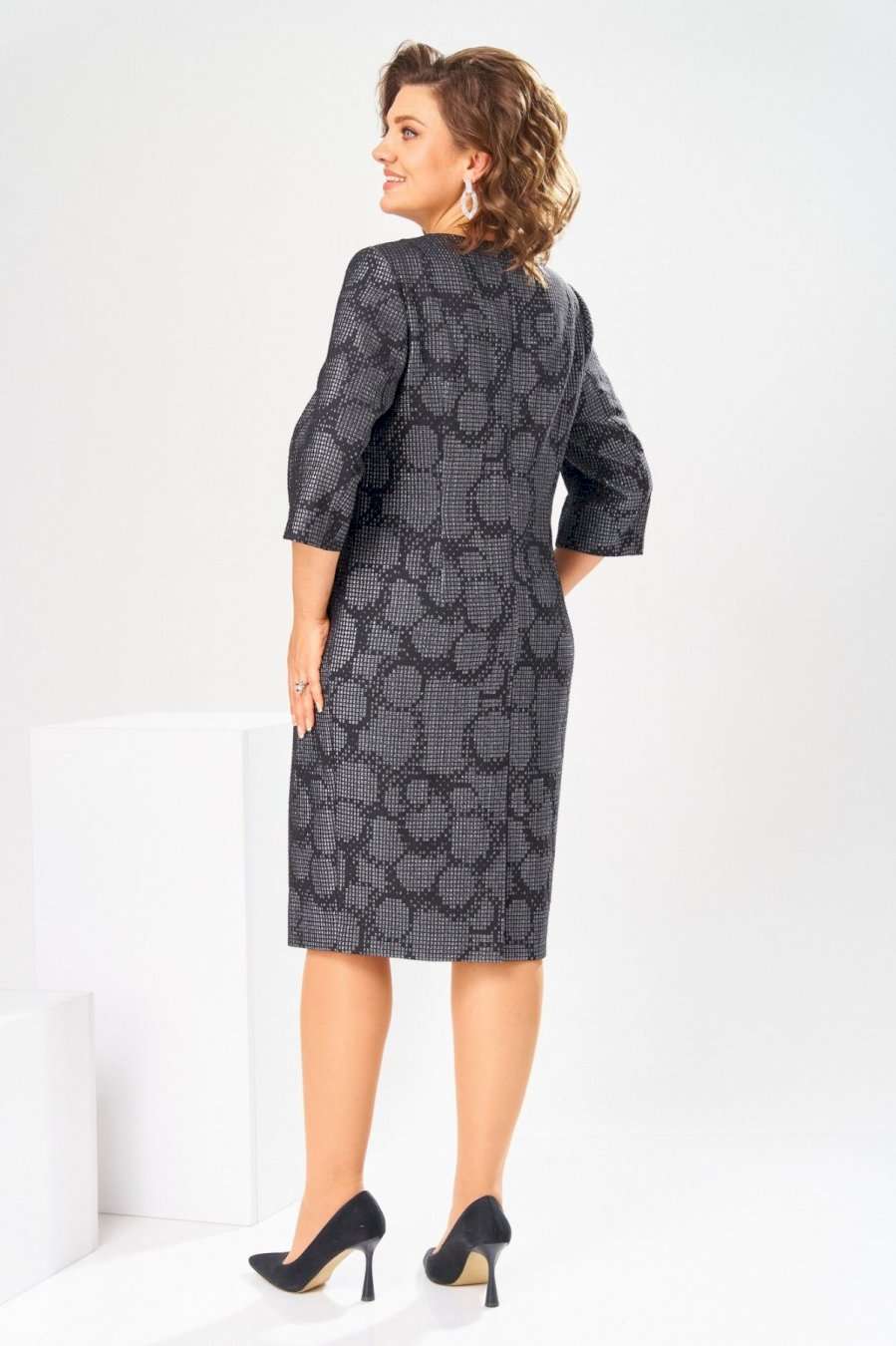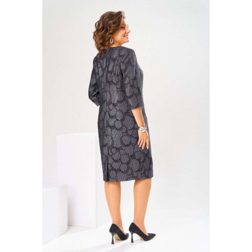 Платье относится к торжественно-нарядной одежде. Платье женское, полу прилегающего силуэта, длиной за колено. Перед с 2-мя рельефами, выходящими из плечевых швов и средним швом. Спинка с 2-мя таллиевыми вытачками и средним швом, заканчивающимся шлицей. Застёжка на потайную тесьму молнией в среднем шве спинки. Горловина круглая, обточная, без воротника с V-образным разрезом по переду, декорированным отделочной планкой, с пришивной стразой. Рукав во втачной, 2-х шовный, длиной 3/4. Платье на подкладке. Платье с плечевыми накладками. Длина платья по спинке 103 см, длина рукава 43,5 см.